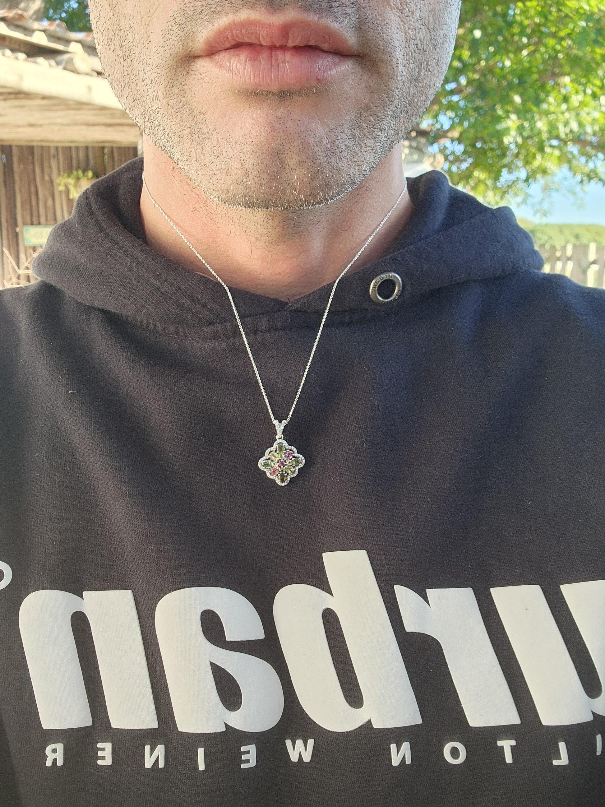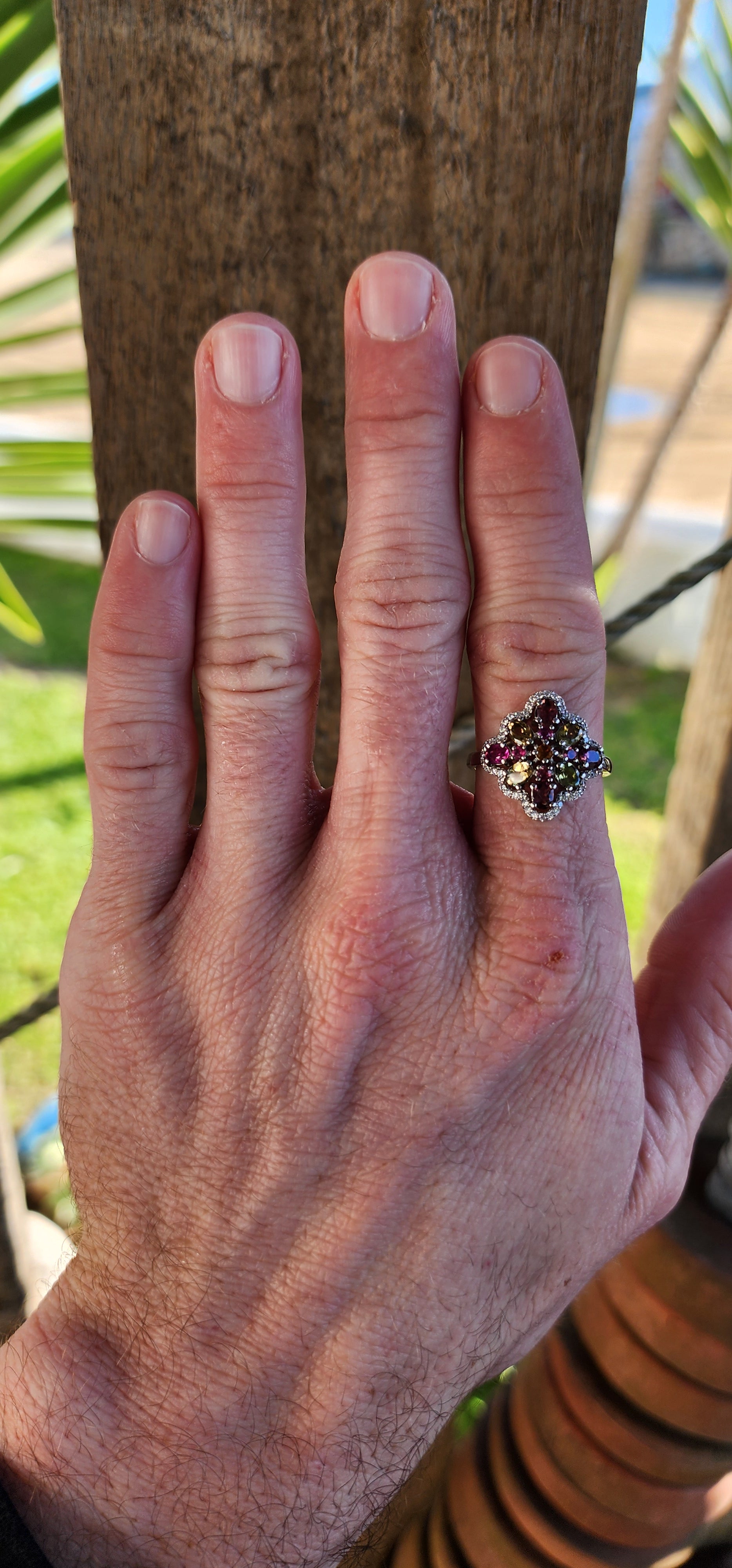 Clusters of Natural multicolor Round and Oval cut Tourmaline Gemstones finely arranged in a Sterling Silver scalloped CZ Halo.