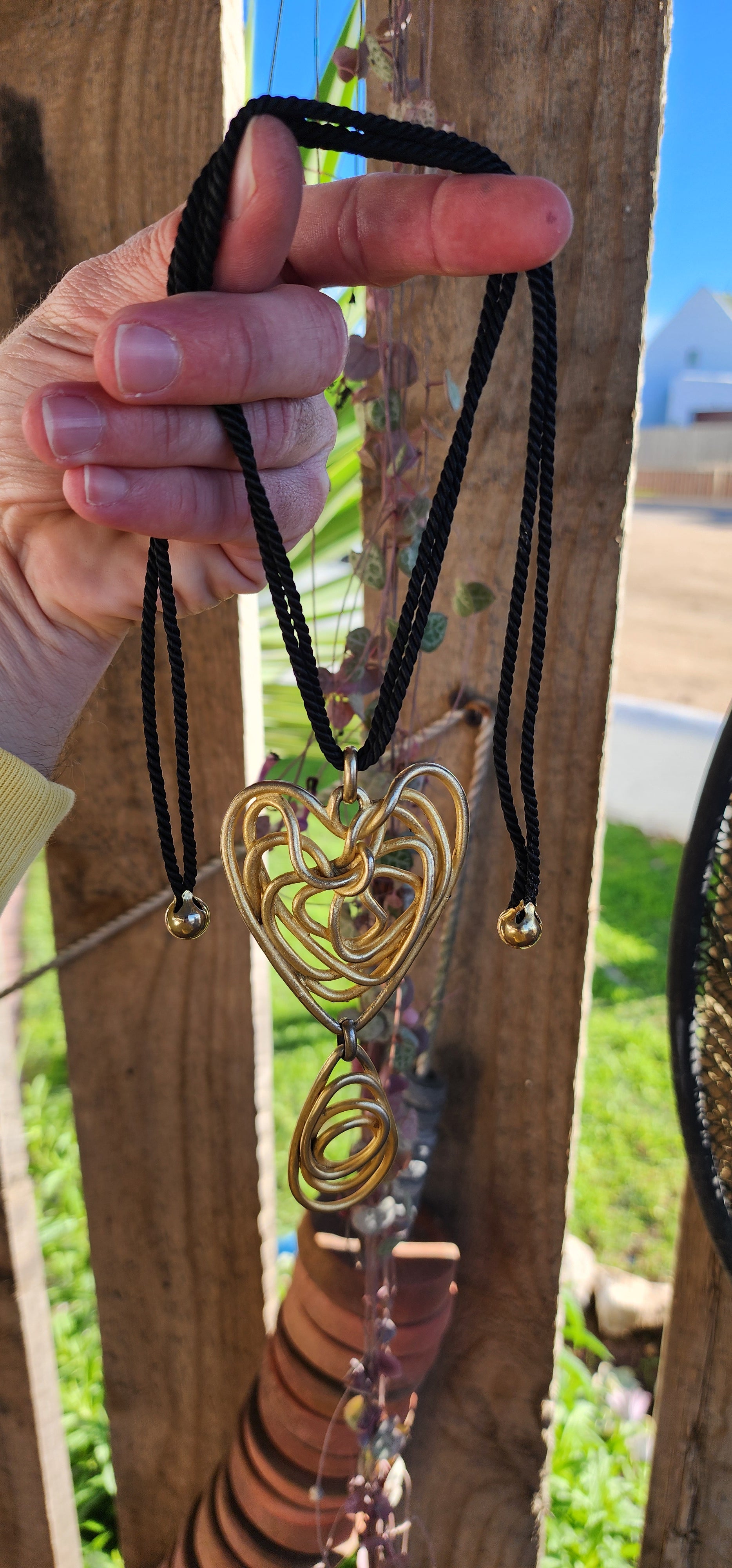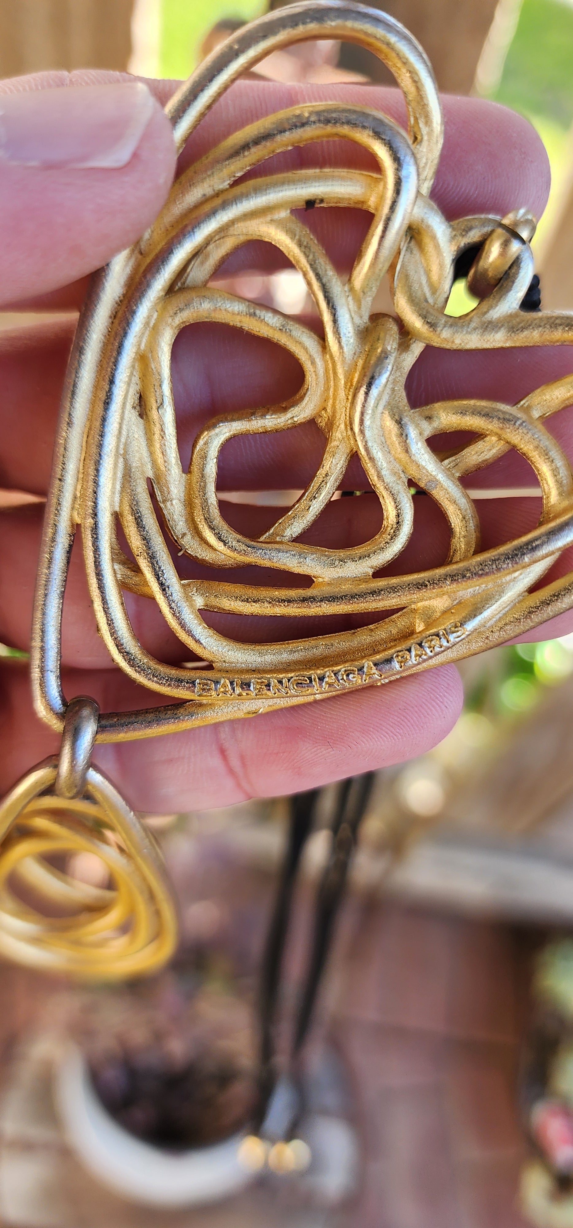 This is a beautiful and massive wired spiral heart pendant necklace designed by Balenciaga in 1980’s. This piece is Gold plated. It features an Black double strand twisted silk rope finished with gilt metal beads. Signed: "Balenciaga. Paris"