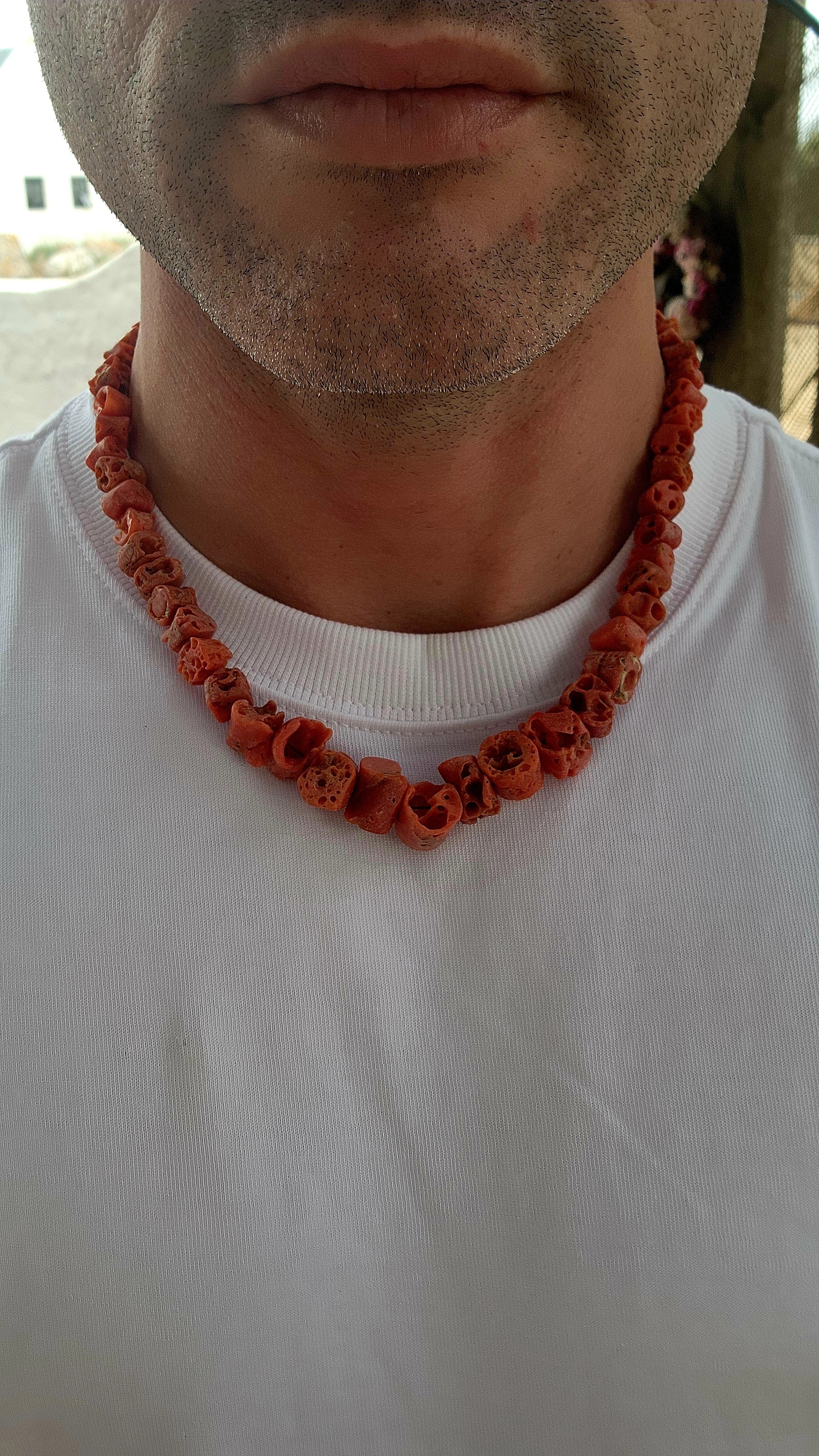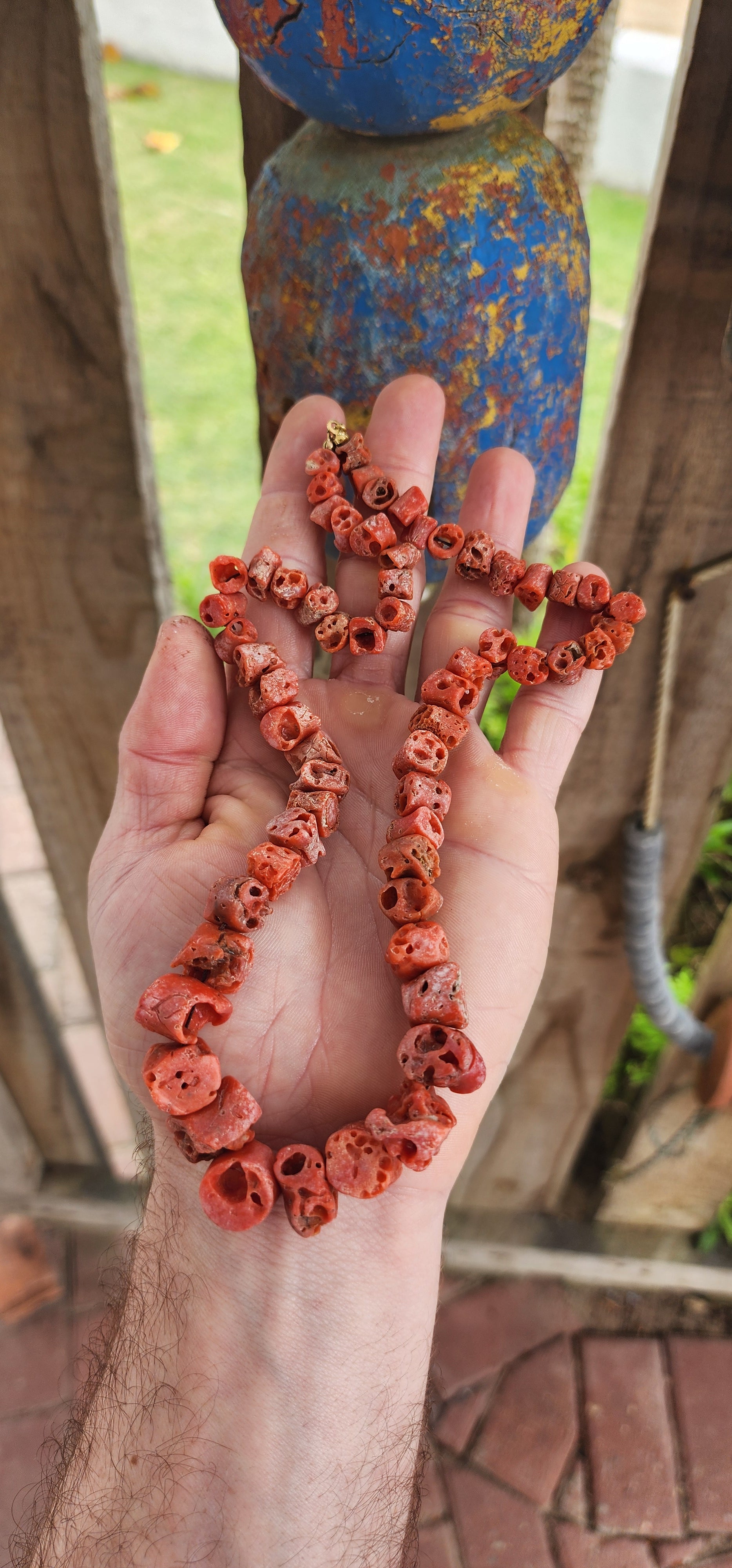 Up for grabs is this magnificent antique strand of raw Mediterranean red coral beads — a true relic of the sea and a testament to nature’s artistry. Each bead retains its organic, semi-raw form, with visible pores, natural sea tunnels, and warm coral patina that speak of centuries spent beneath sunlit waves. The beads are graduated barrel shapes, ranging from chunkier coral tubes at the center to finer pieces toward the clasp — all strung together in a design that feels as ancient as it is stylish.