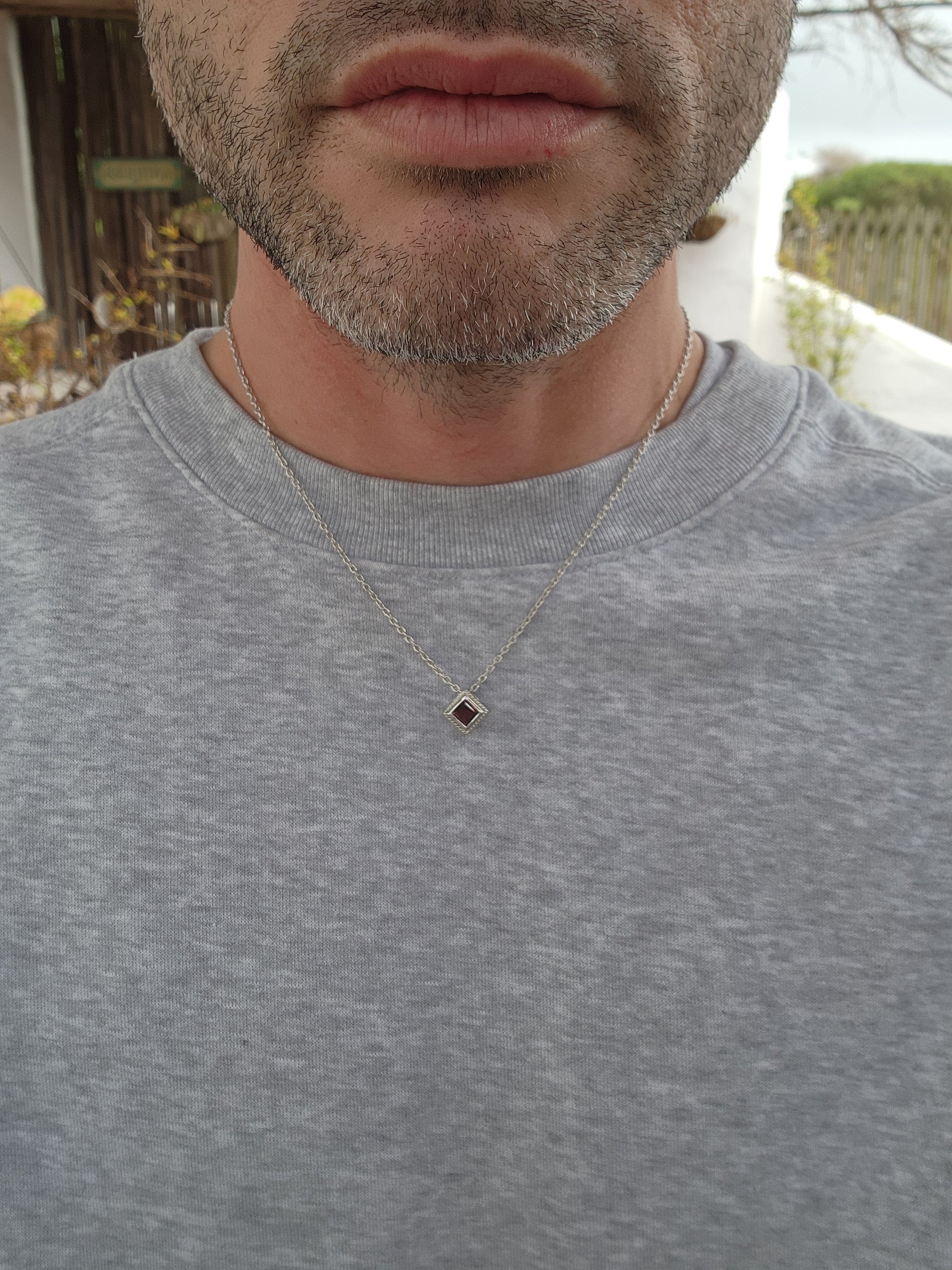 Minimalistic beauty - Beautiful and elegant Sterling Silver Cube pendant featuring a bezel/tube set Princess cut Almandine Garnet Gemstone with Rope motif border.