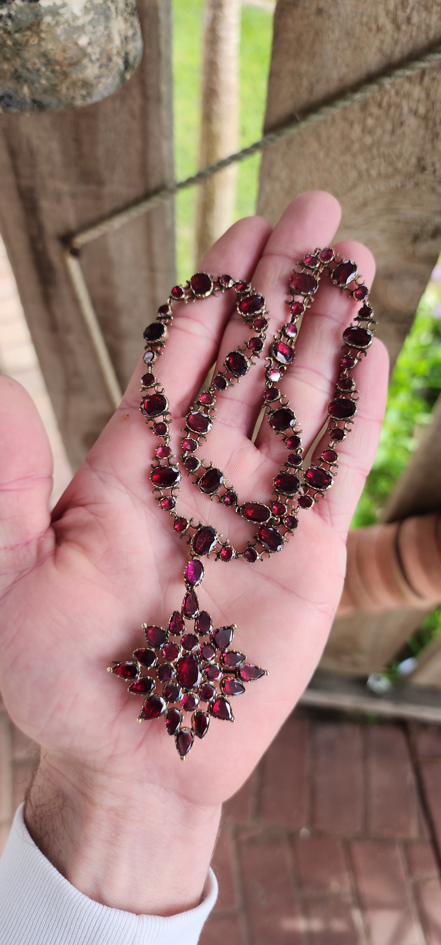 Up for grabs is this MOST incredible Antique Georgian era circa 1800 foiled back Almandine Garnet Riviere/Collar necklace with detachable pendant/brooch drop.Set in 10ct Yellow/Rosy Gold.