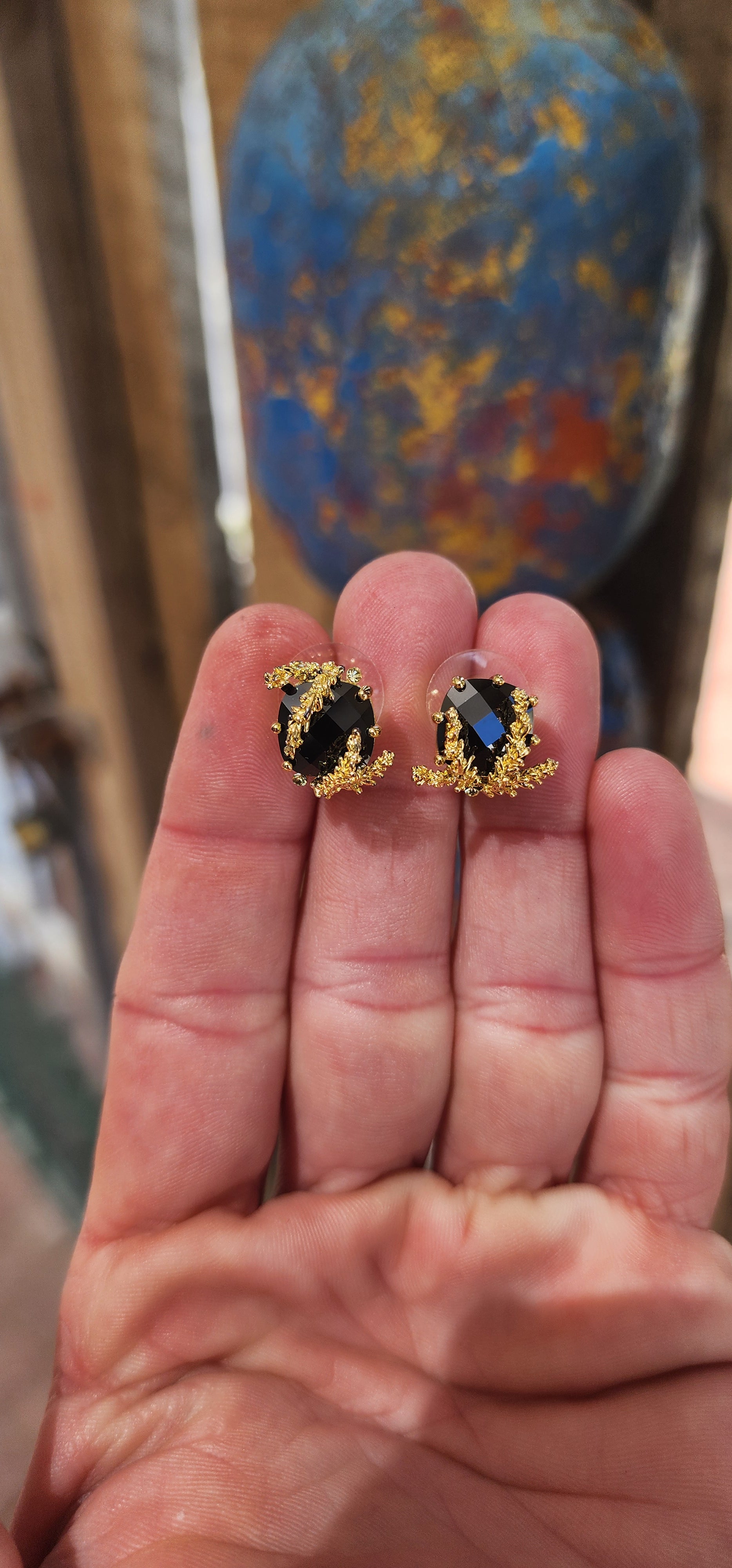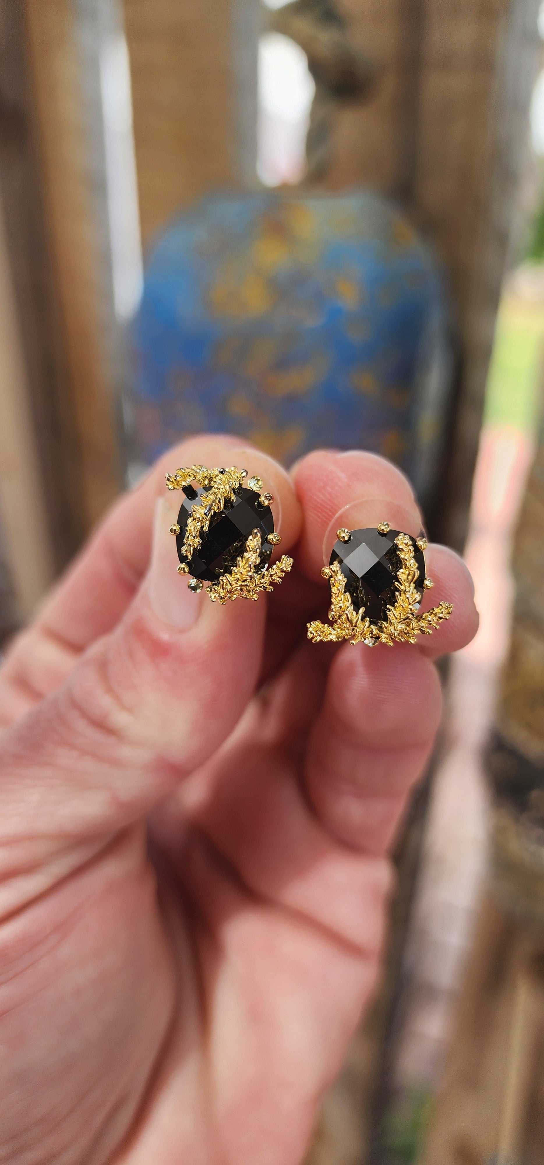 Each earring showcases a beautifully faceted black glass centerpiece, which adds a touch of timeless elegance and sophistication.