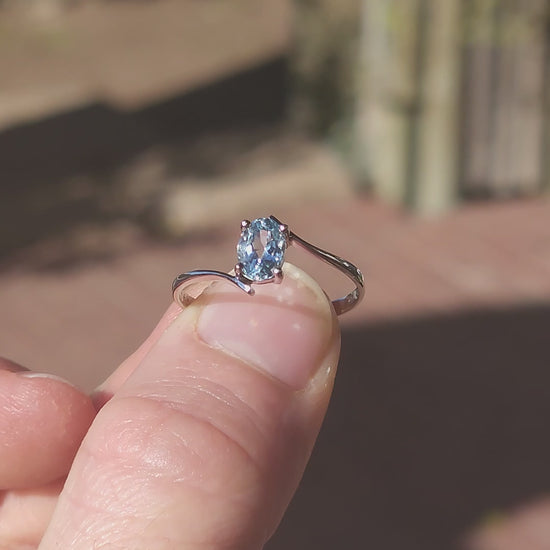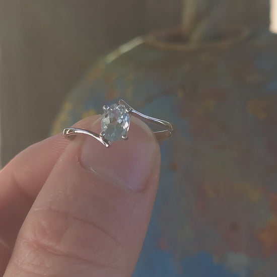 A ring that feels as if it carries the calm of the sea within its heart. This elegant piece is crafted in 14ct white gold, its sleek metal glowing with a cool, silvery sheen. The design follows a graceful bypass style, where the shoulders of the band sweep upward in a flowing curve, meeting the gemstone at the top and bottom like waves embracing a precious jewel.