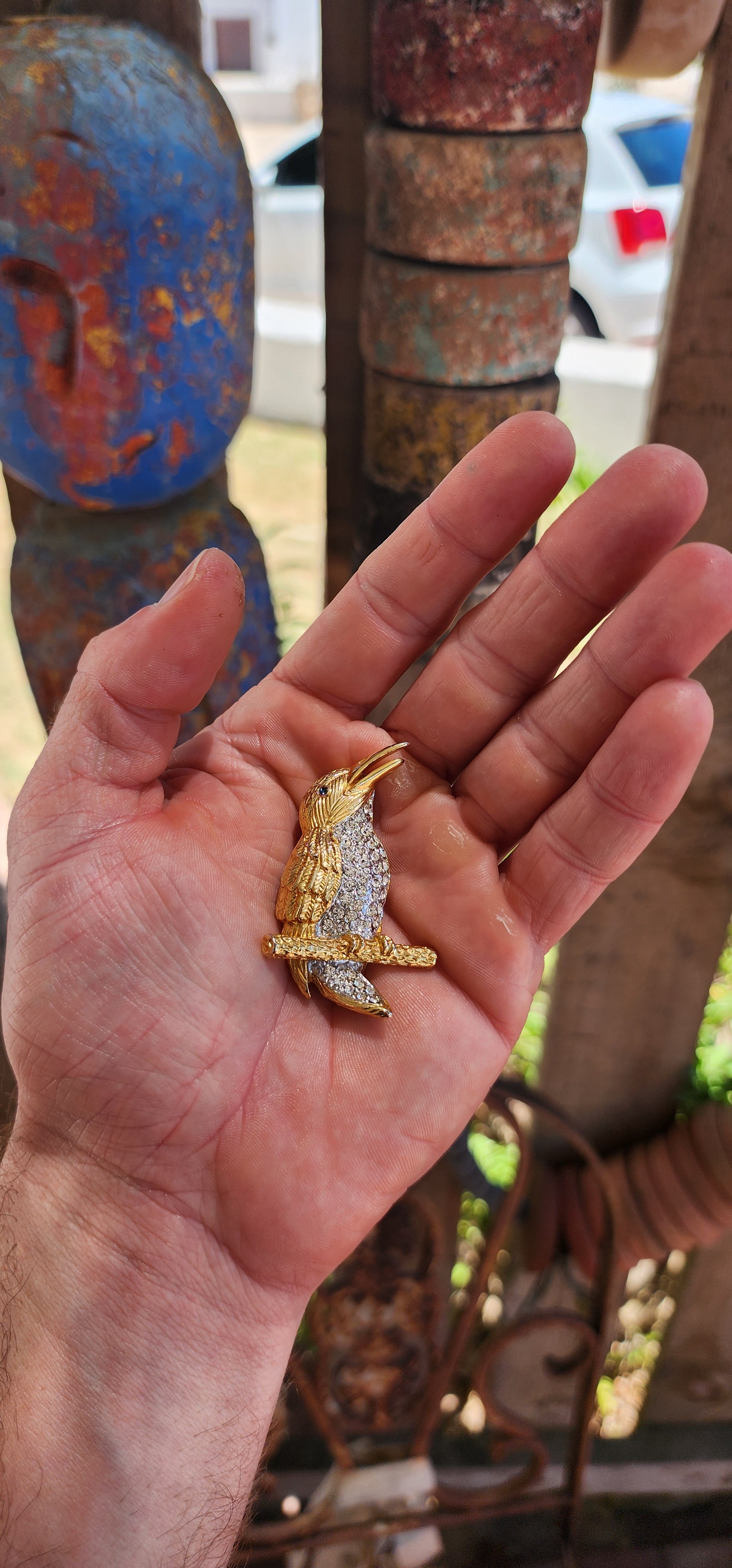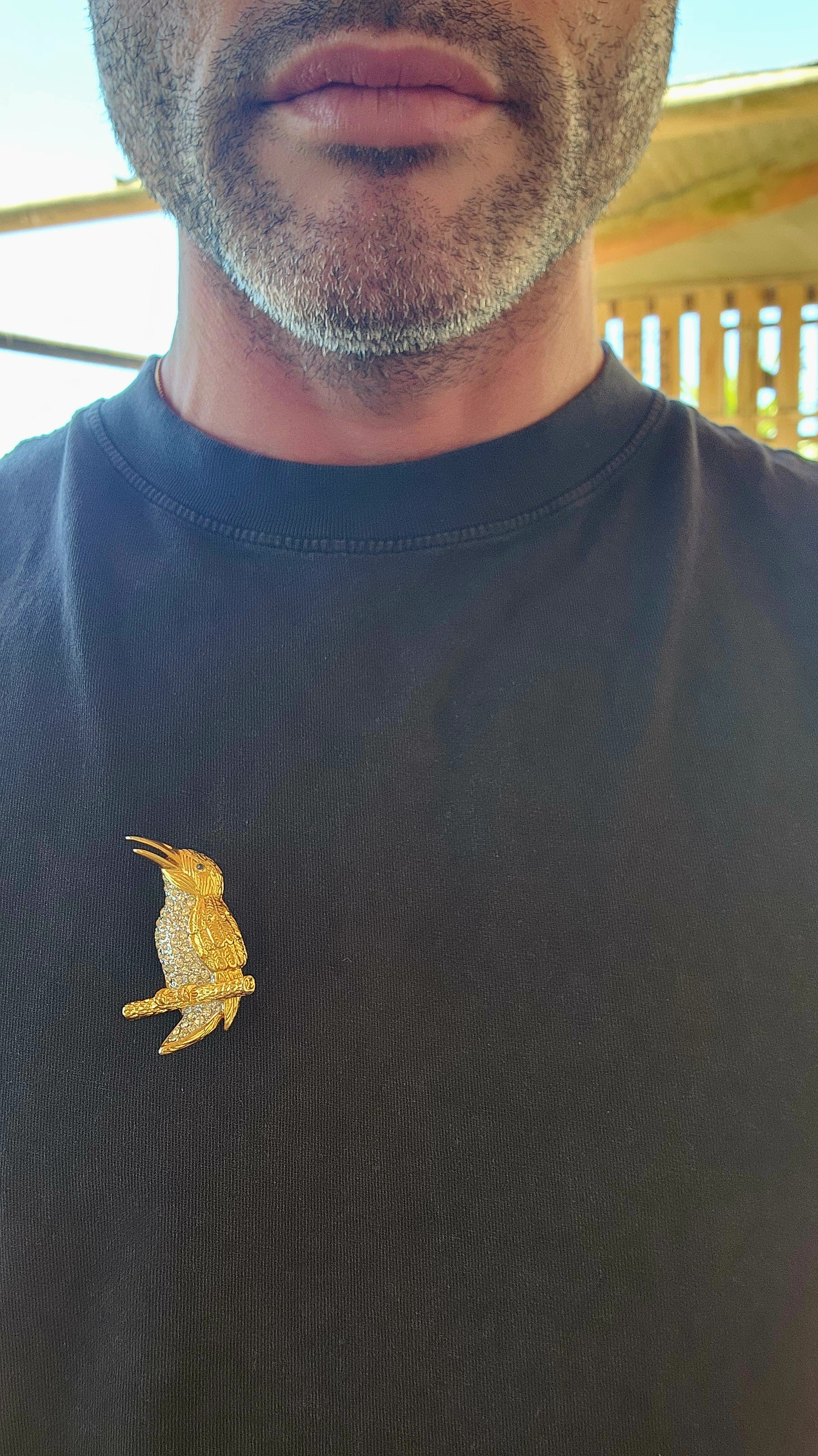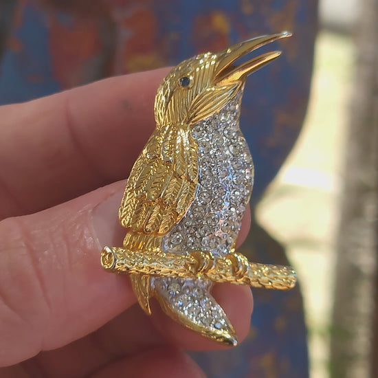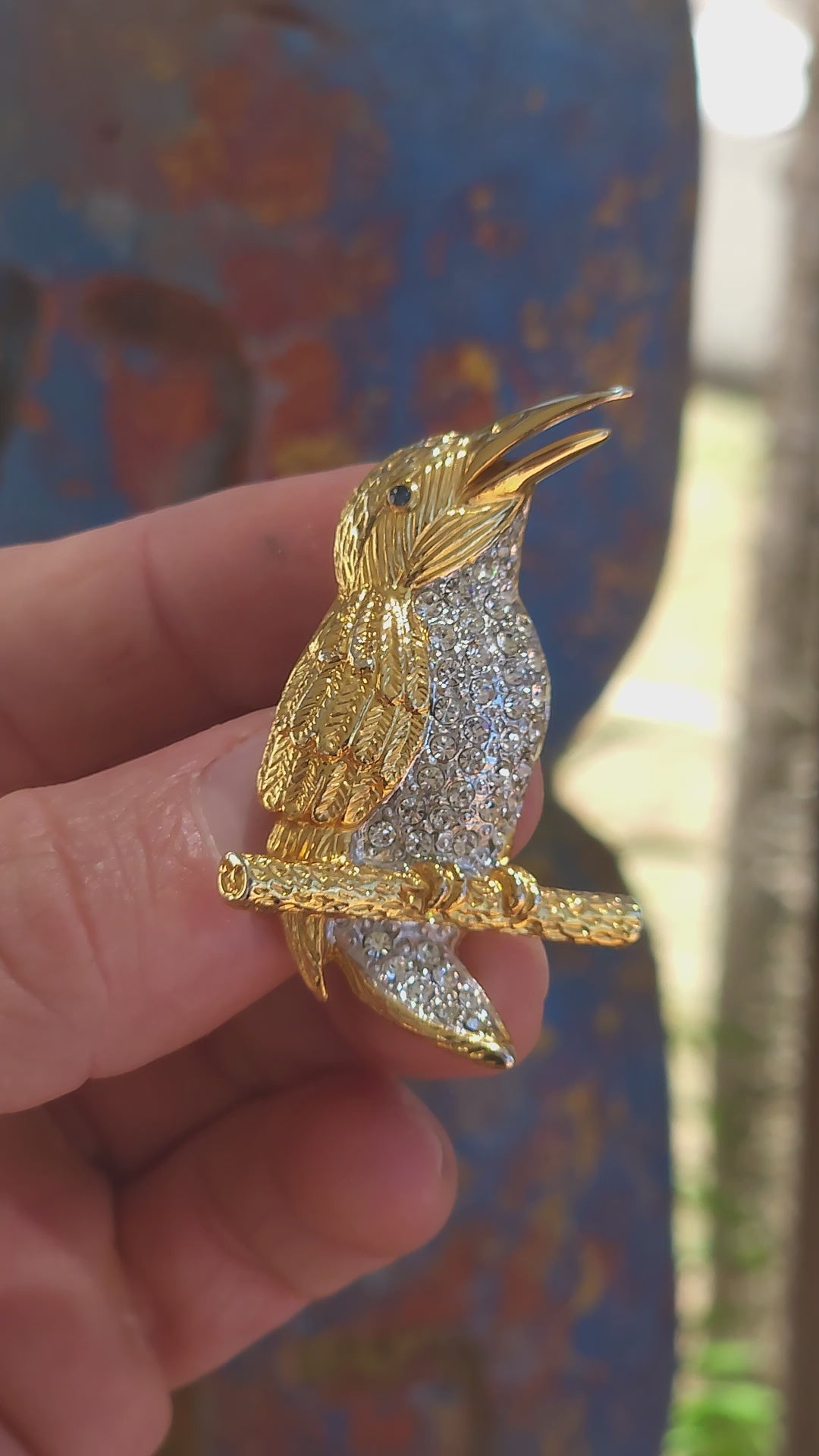 This brooch is a gold and silver-plated wonder, encrusted with hand-applied Swarovski crystal rhinestones that bring its feathered beauty to life.