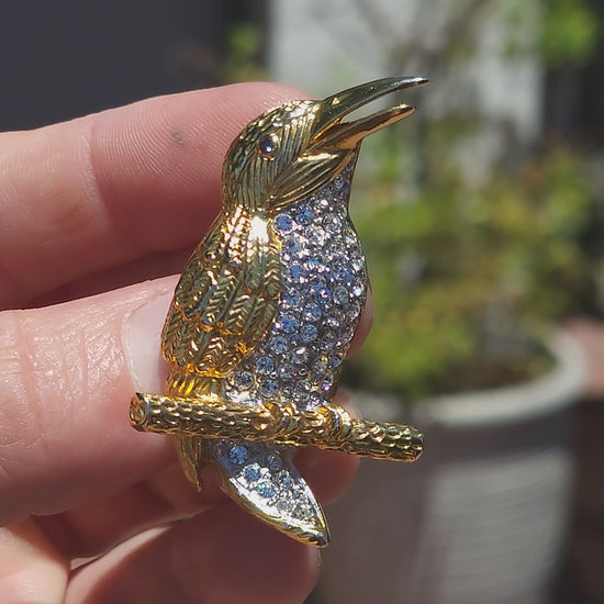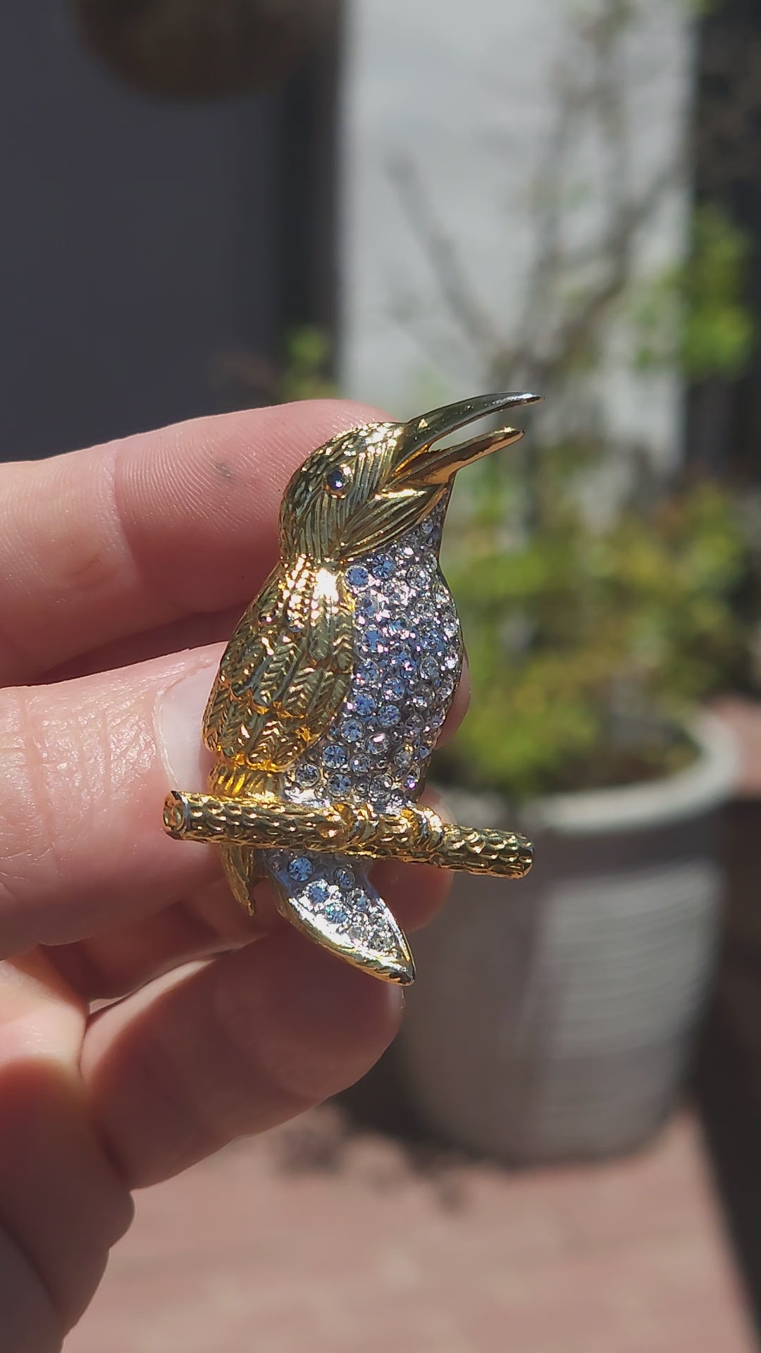The bird’s shimmering belly is fully adorned in clear crystals, while its intricately textured wings and head are finished in warm gold-tone metal. The final, mesmerizing detail, A brilliant blue rhinestone eye, capturing the kingfisher’s signature piercing gaze.