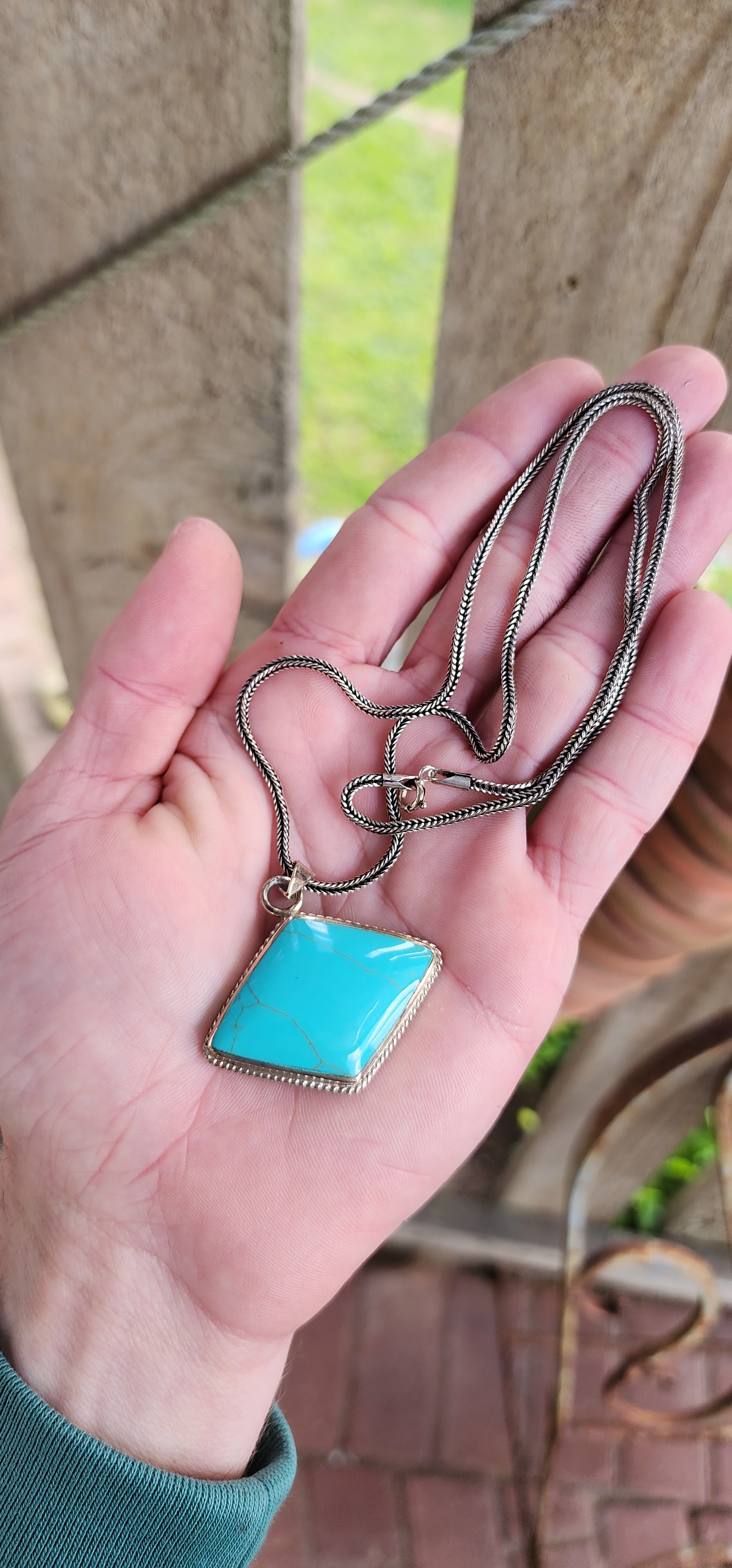 Perfectly unisex ! Beautiful Artisan made Sterling Silver and bezel/tube set Diamond/Lozenge shaped Blue Howlite Gemstone pendant , fitted on a extra length Sterling Silver Foxtail chain.
