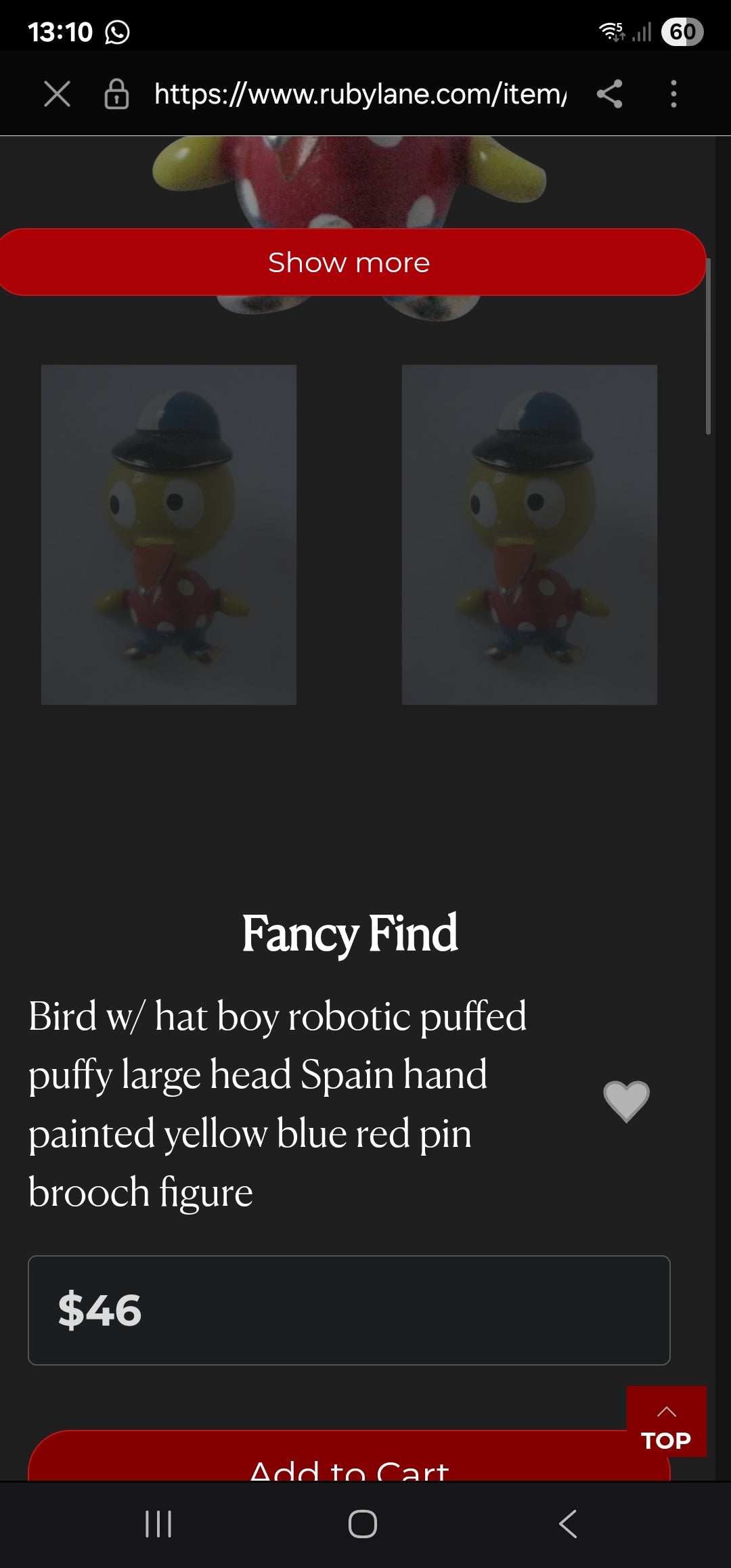 They’re not just cute — they’re scarce survivors of early European novelty jewellery, still in amazing condition for their age! Similar examples are known to sell between $38 (≈ R650) and $46 (≈ R790) each, making this complete set an absolute treasure for any collector of early enamel or figural brooches.