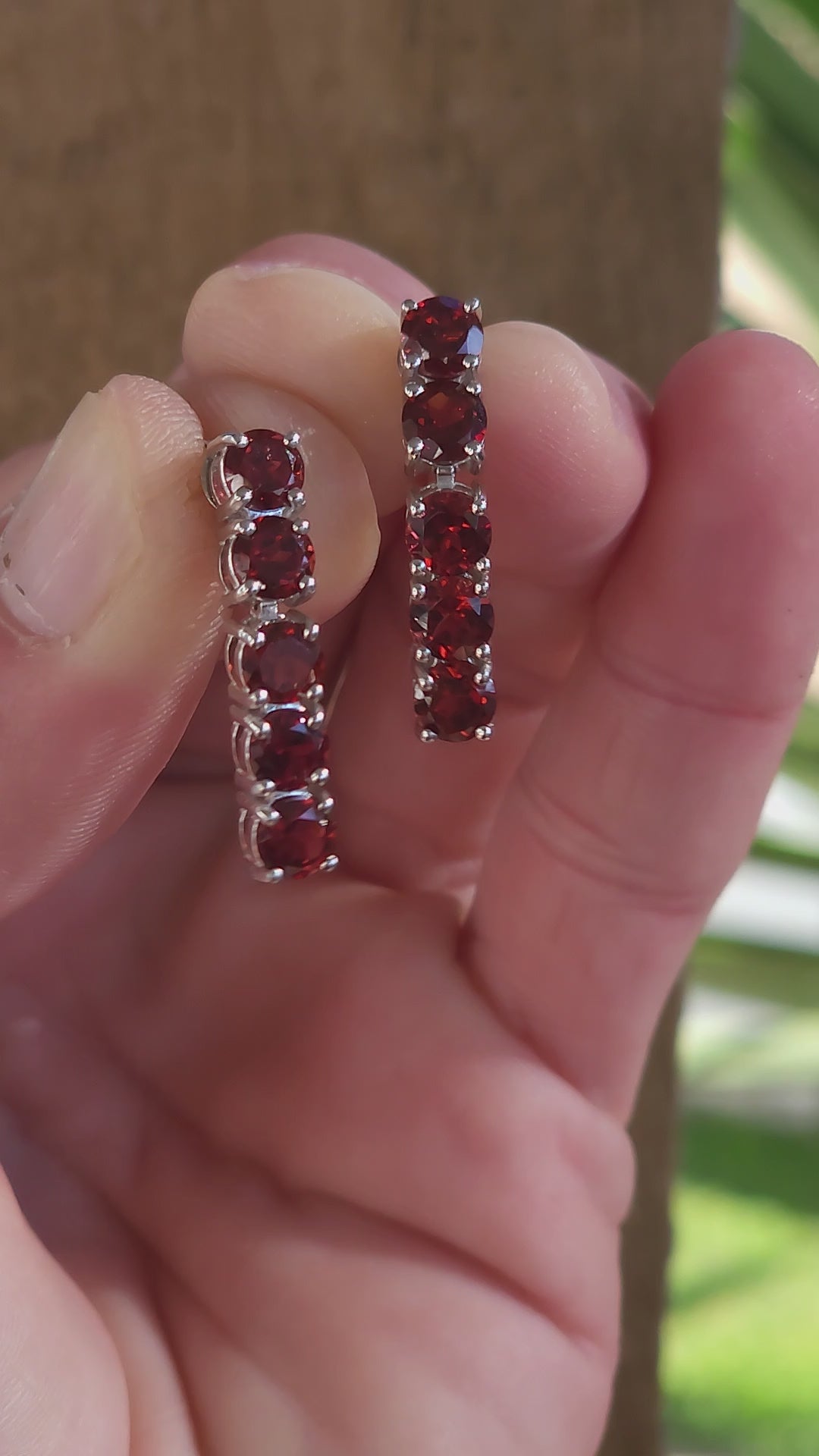 Pretty and elegant Sterling Silver and Garnets push-in dangle earrings each prong set with 5x Round cut Garnets in open gallery settings.The Garnets each measure 5mm in diameter.The earrings come with Sterling Silver studs/butterflies.