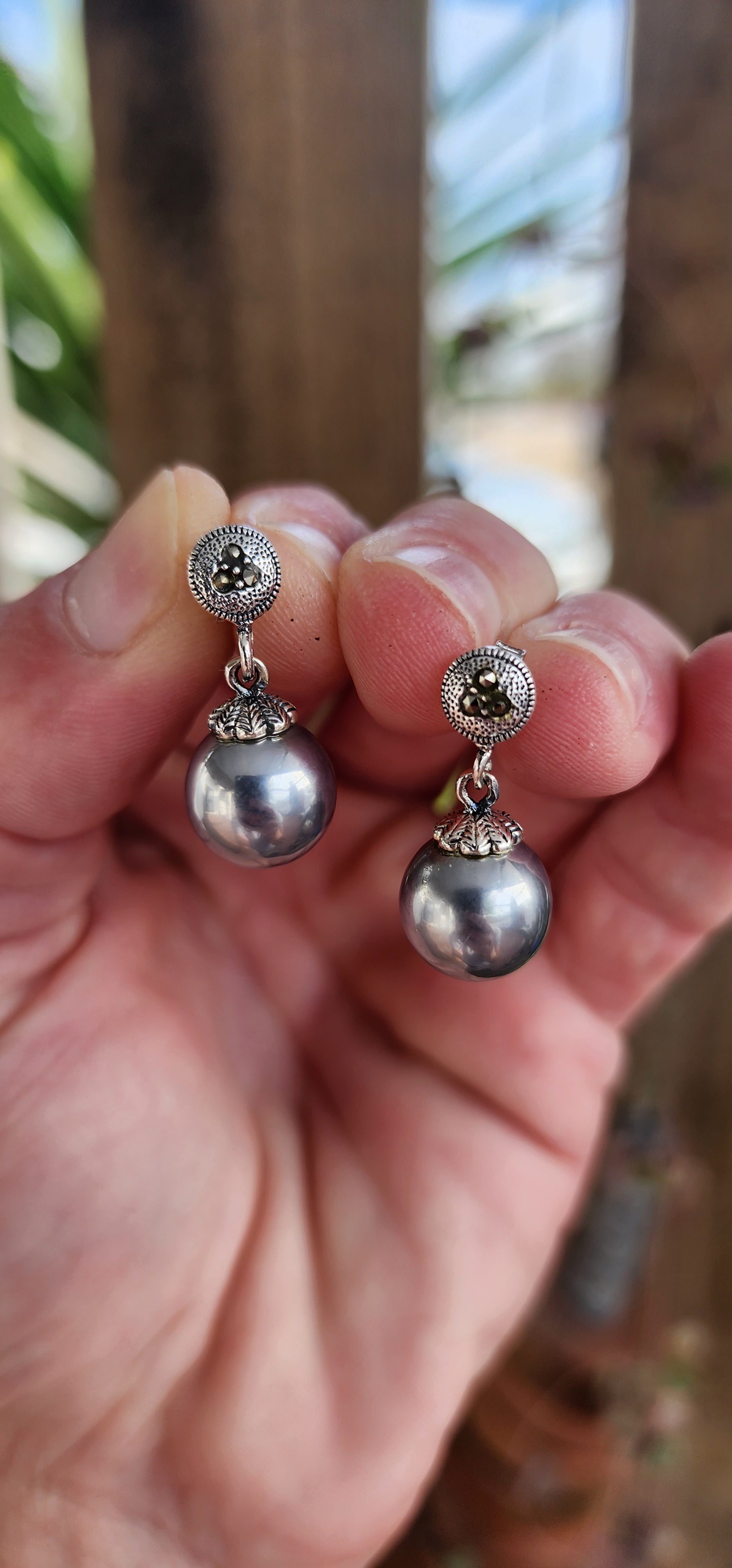 Pretty pair of Sterling Silver push-in drop earrings - Each set with Grey Faux Pearl dangles and sparkly Marcasite accents.
