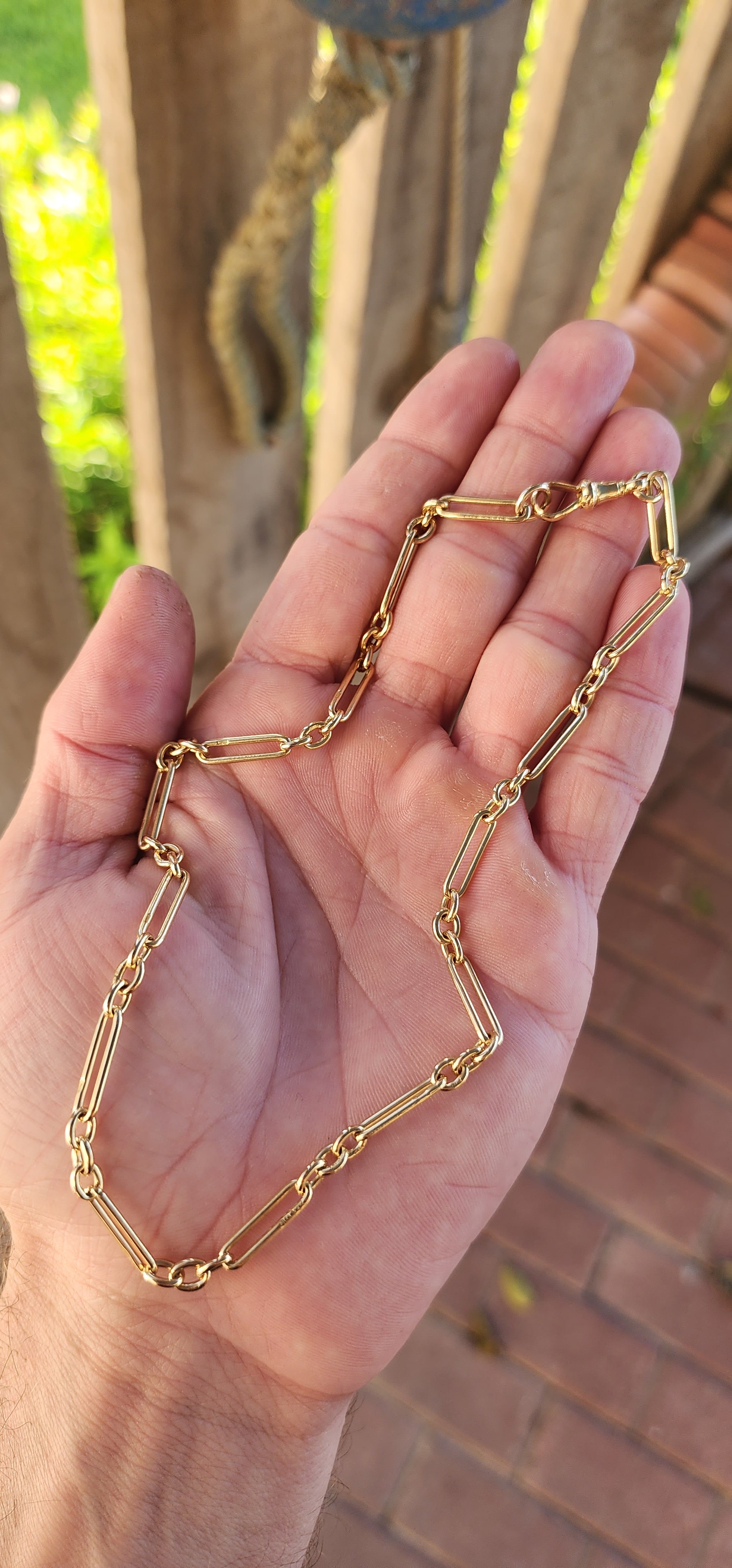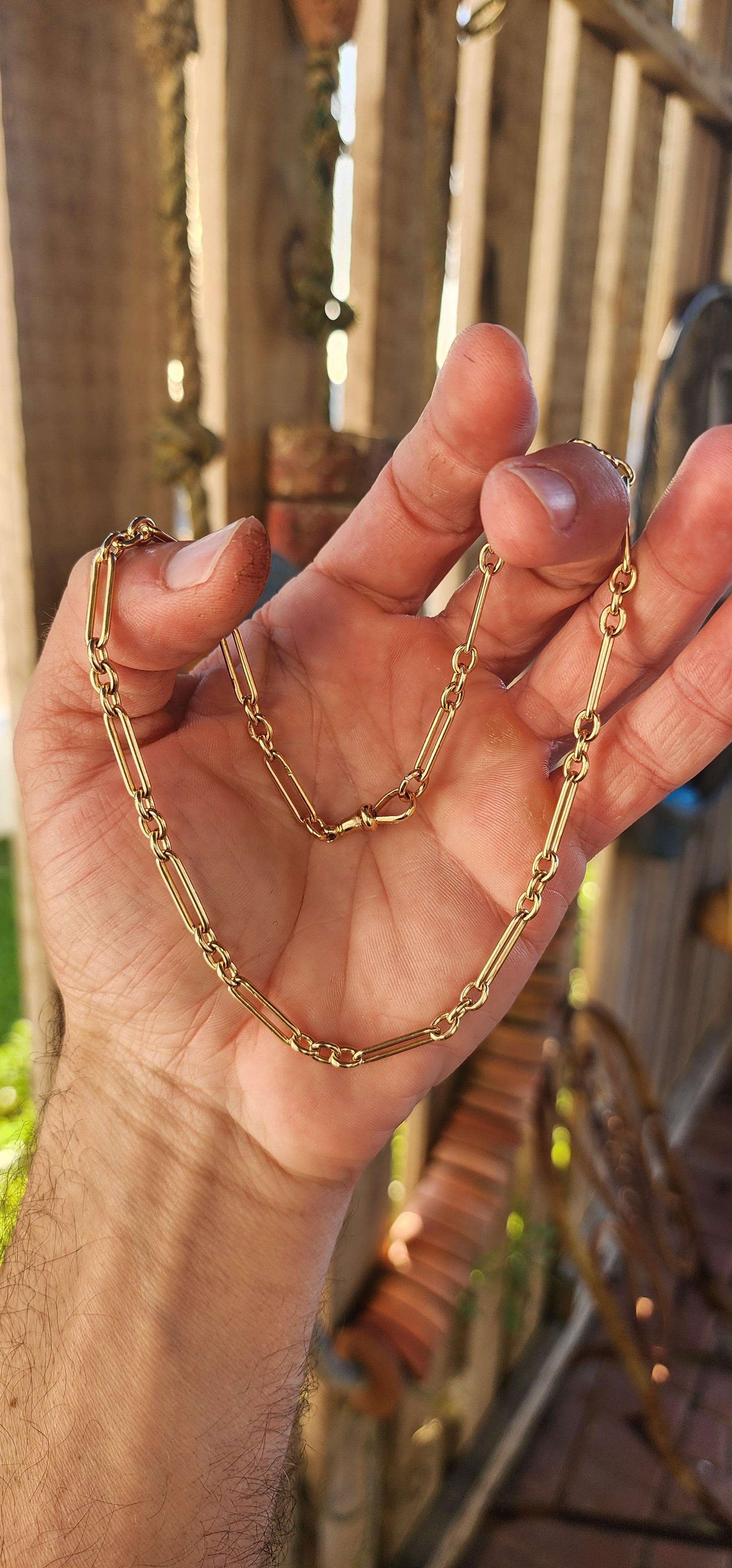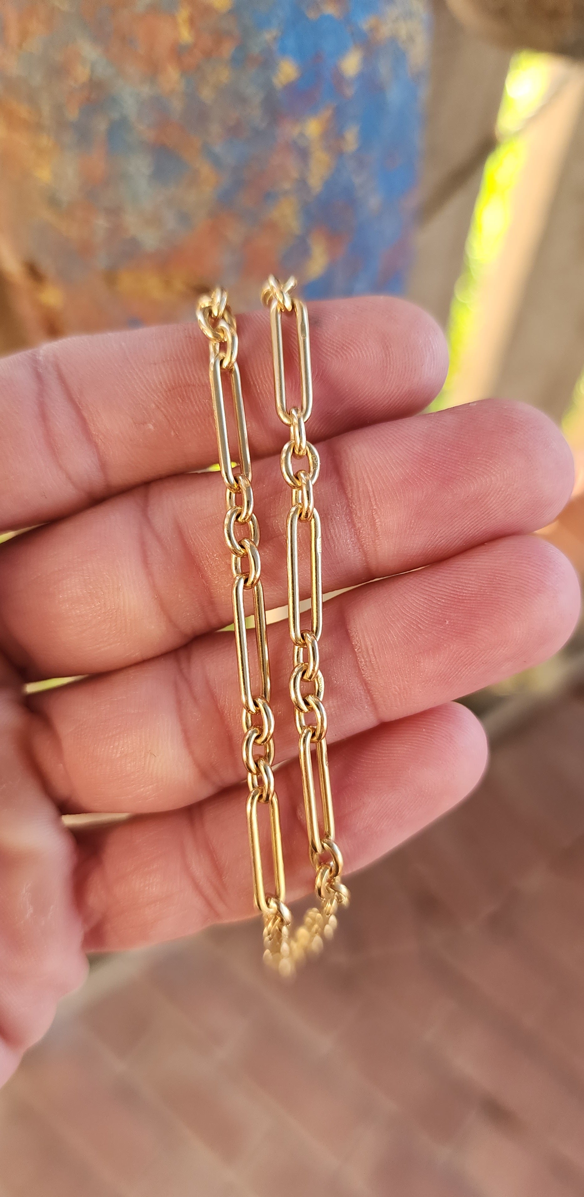 This striking beauty is composed entirely of solid 18ct buttery yellow gold — not just gold-plated, but the real-deal, glowing with that warm, deep honey hue only high-karat gold can deliver. Every elongated paperclip link has been carefully formed and connected by smaller oval links, creating a rhythmic dance of shape and shine across your wrist or neckline. It’s bold, it’s clean, and it has just the right amount of old-world swagger.