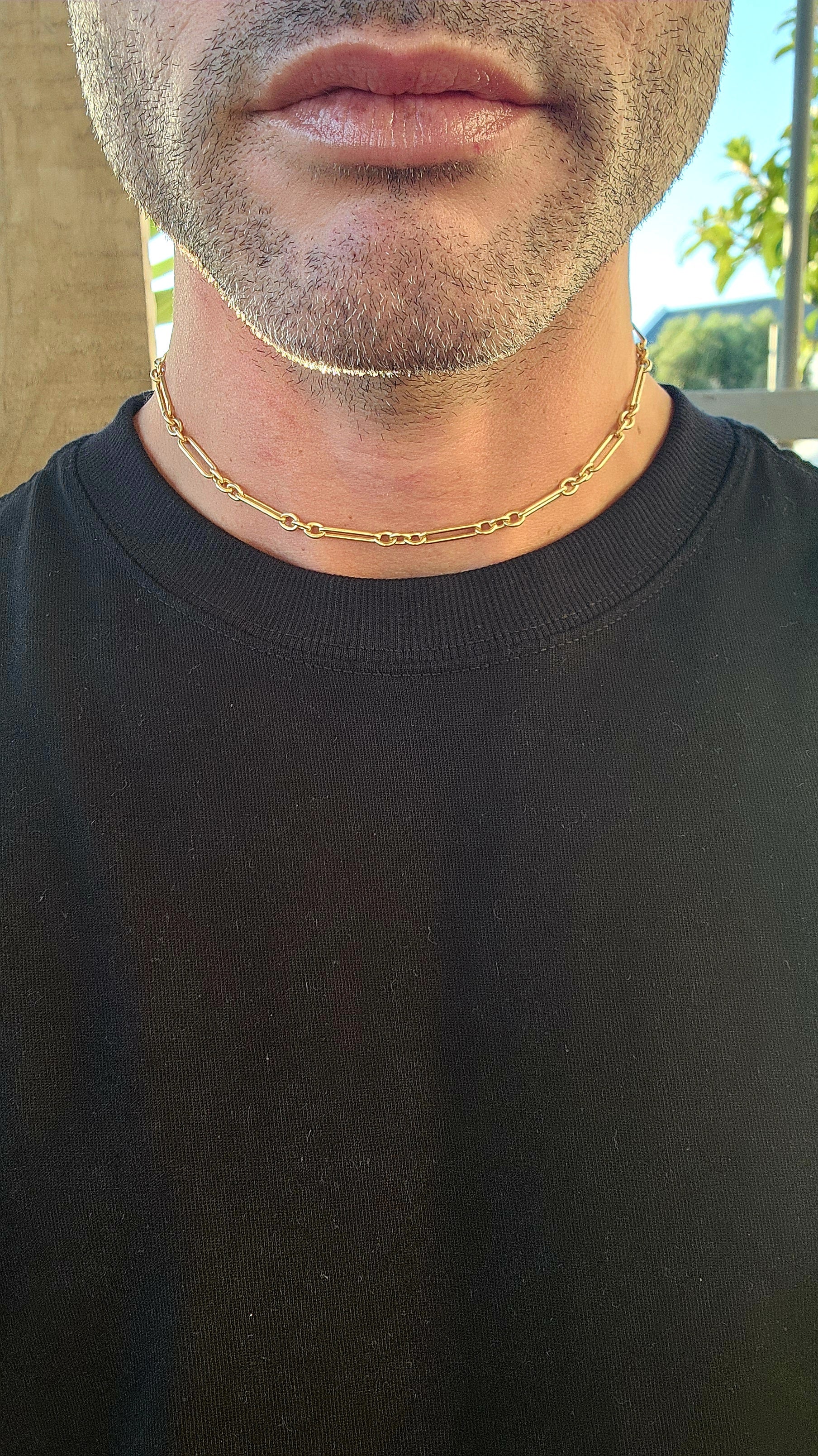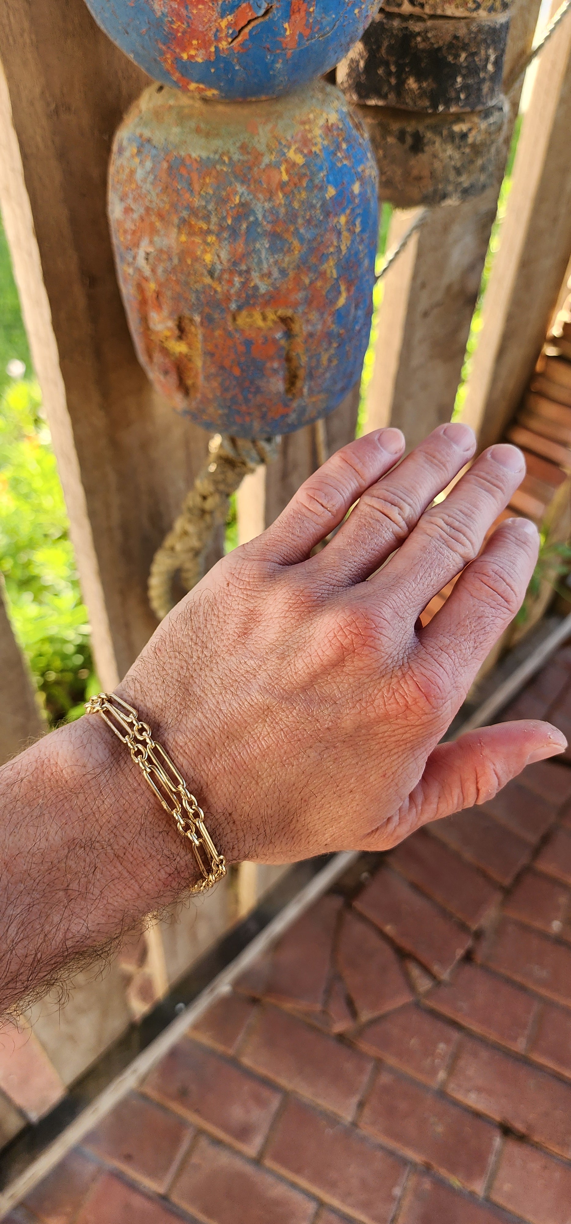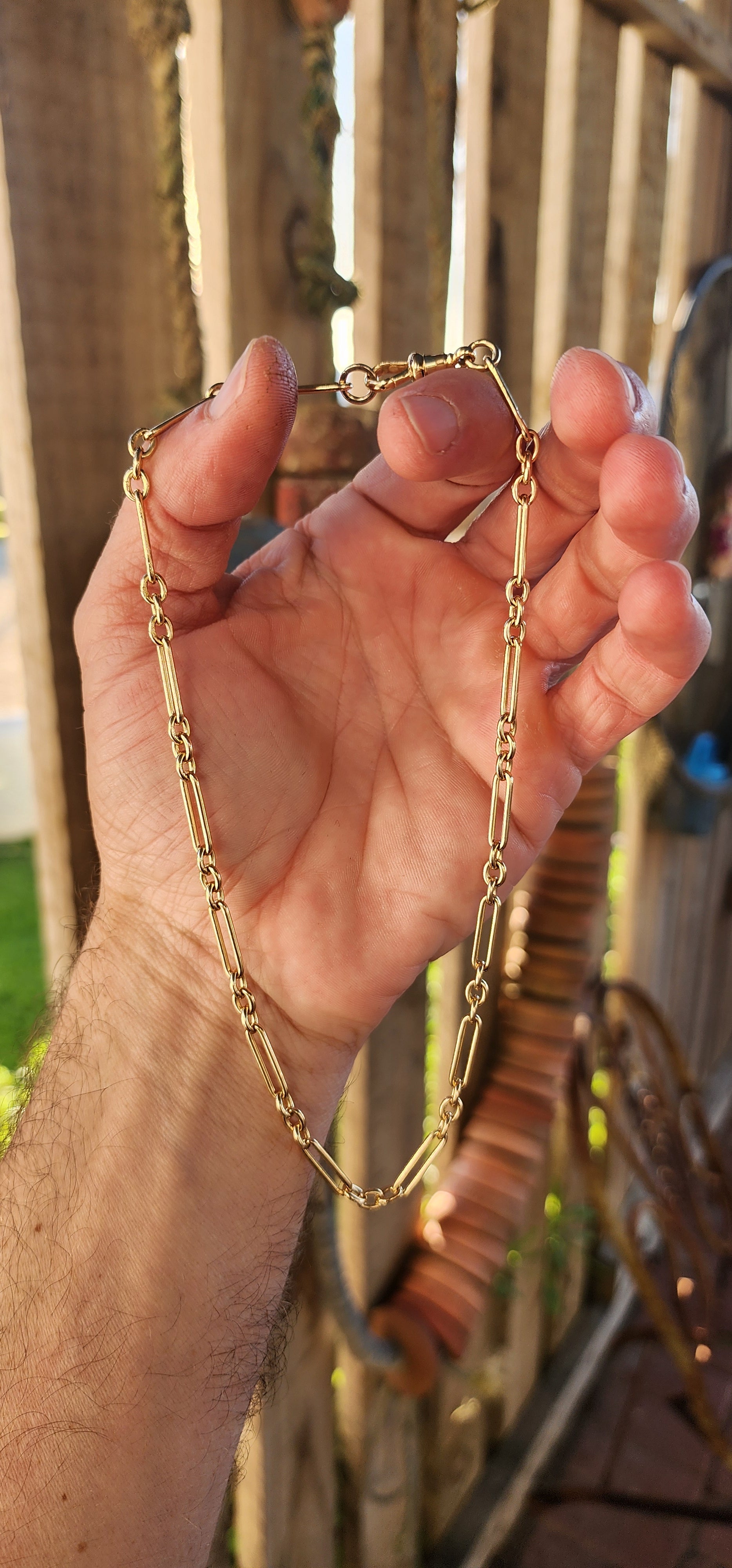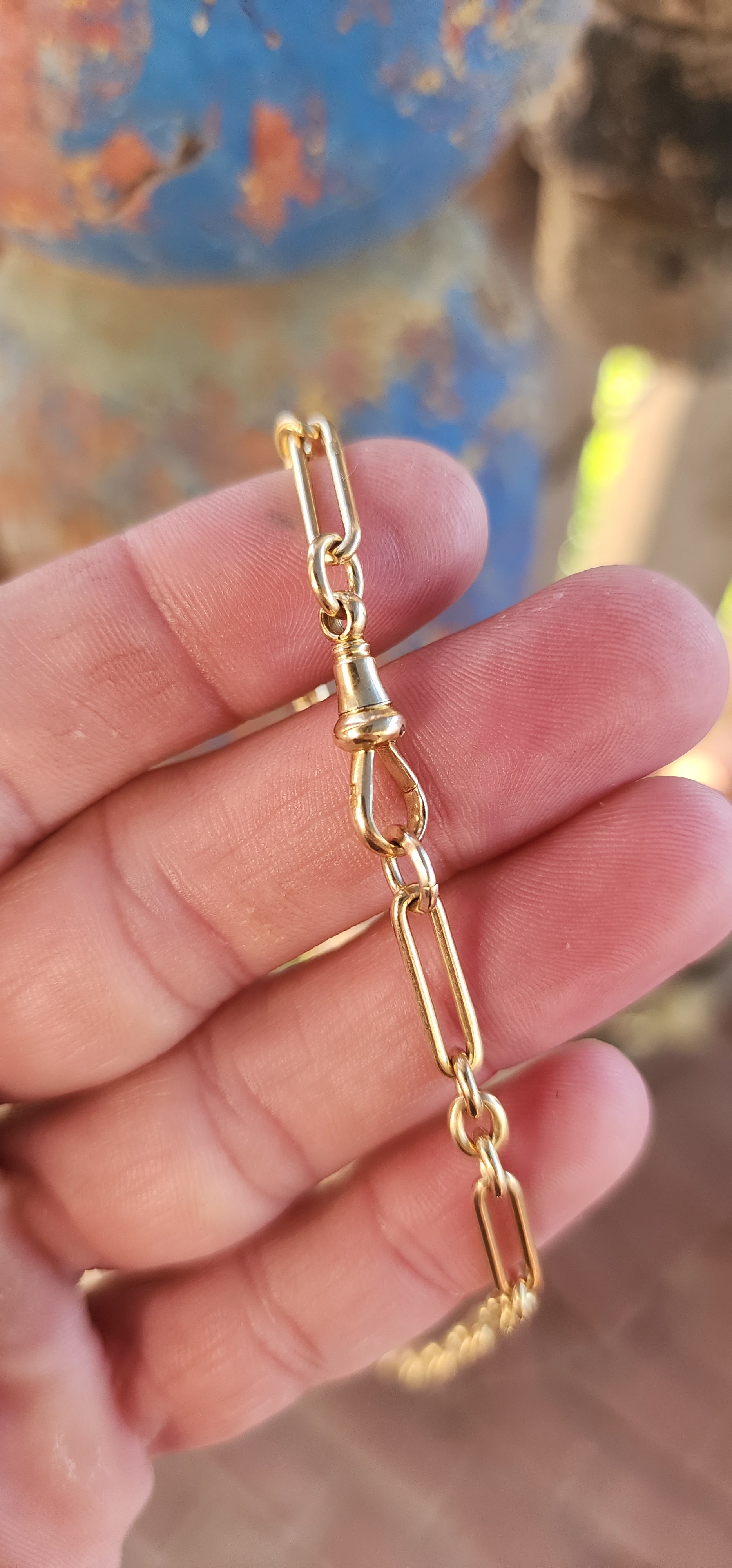 This striking beauty is composed entirely of solid 18ct buttery yellow gold — not just gold-plated, but the real-deal, glowing with that warm, deep honey hue only high-karat gold can deliver. Every elongated paperclip link has been carefully formed and connected by smaller oval links, creating a rhythmic dance of shape and shine across your wrist or neckline. It’s bold, it’s clean, and it has just the right amount of old-world swagger.