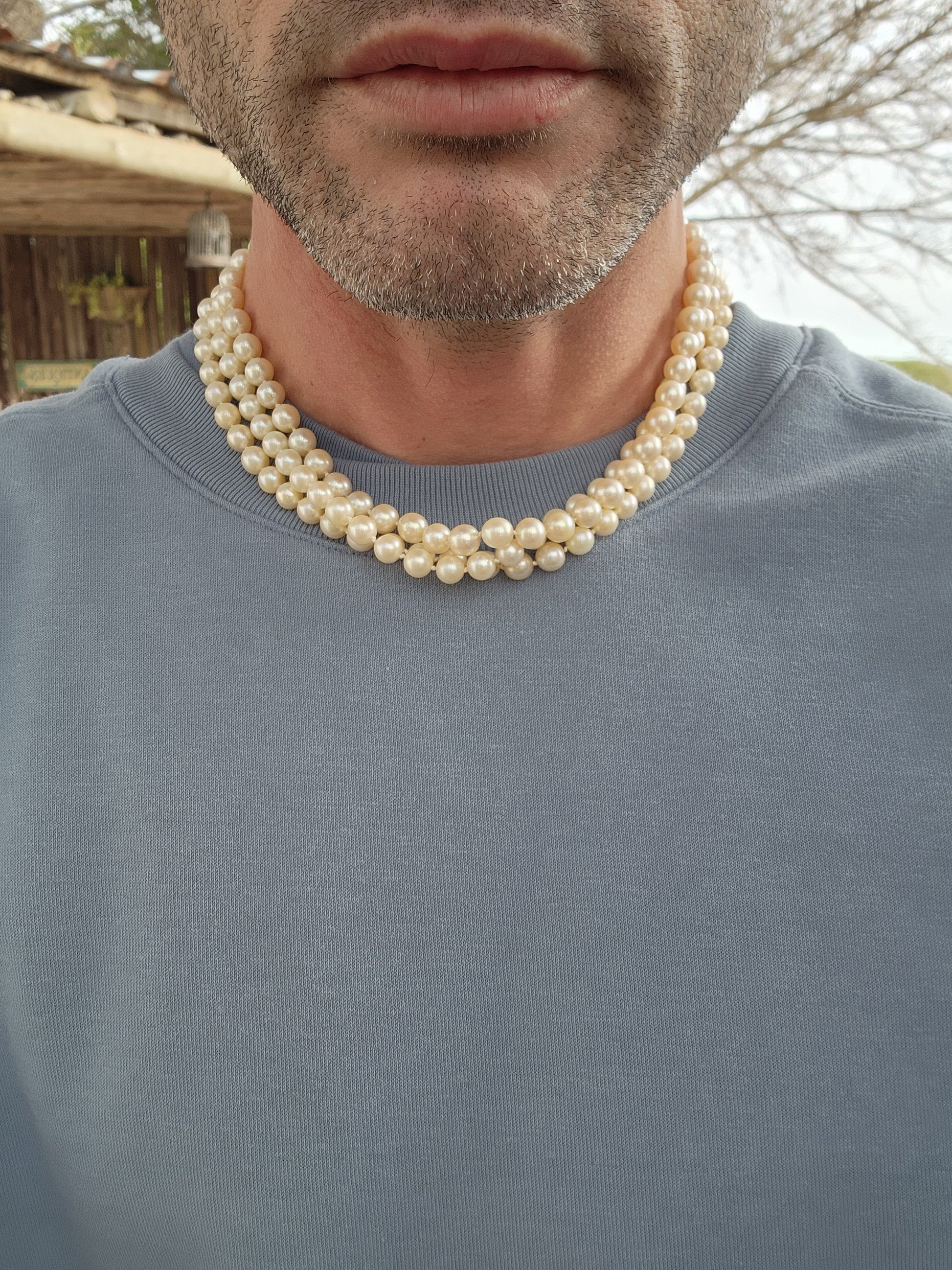 Measurements :The shortest strand with a length of 42 cm , second strand with a length of 42.5cm and third strand 44cm.The Pearls differ slighly in size with the largest Pearl 7.70mm in diameter and smallest Pearl 7mm in diameter.The Emerald/Pearl clasp with a diameter of 1.4cm.Necklace with a total weight of 89grams.