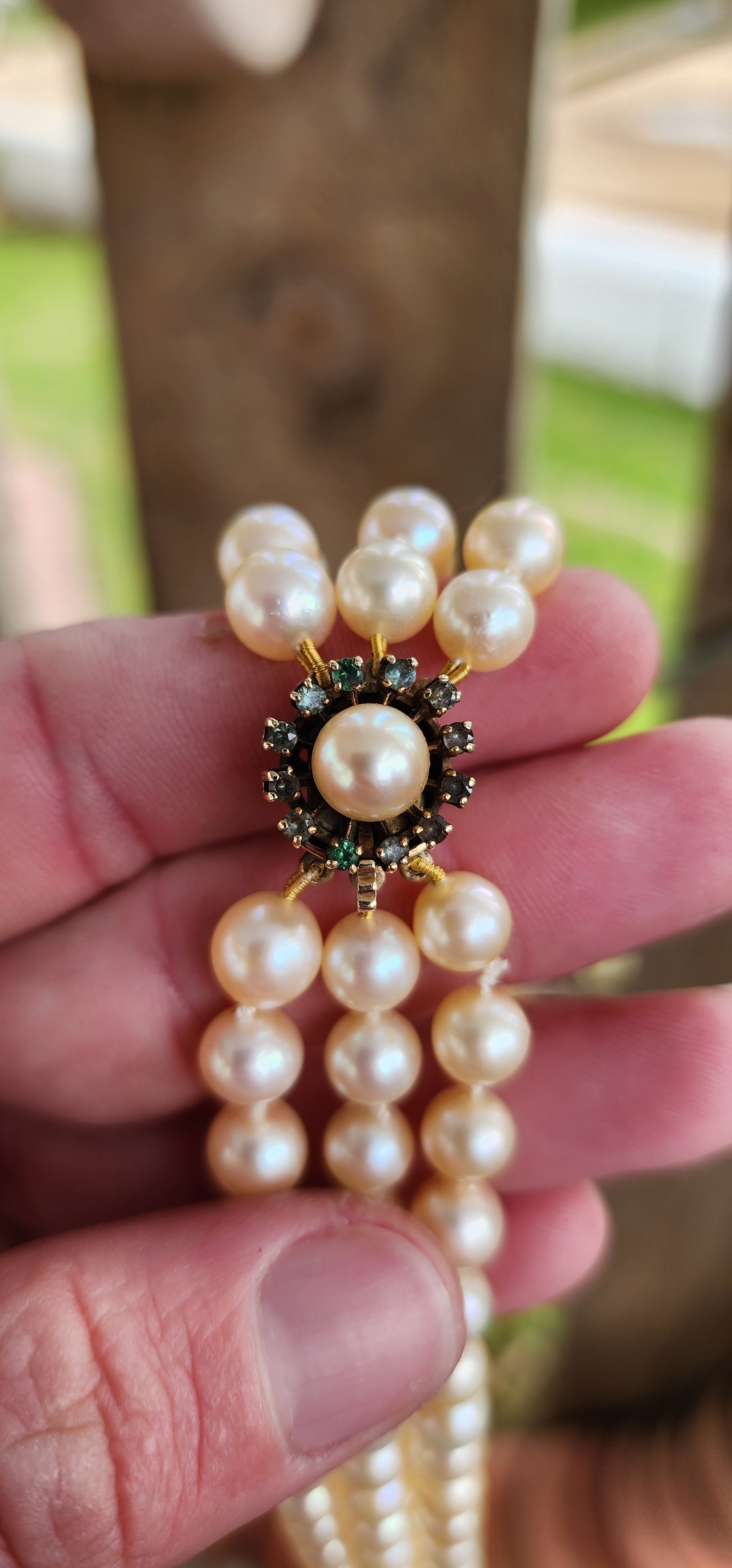 Sensational Vintage 1940's 3 strand Marine Cultured Pearl necklace fitted with a 9ct Yellow Gold,Round cut Emeralds and Pearl clasp.