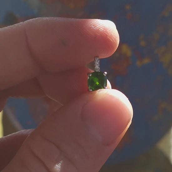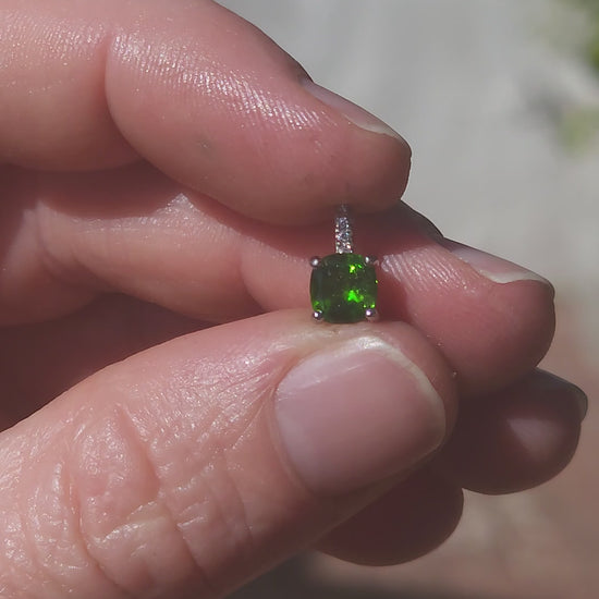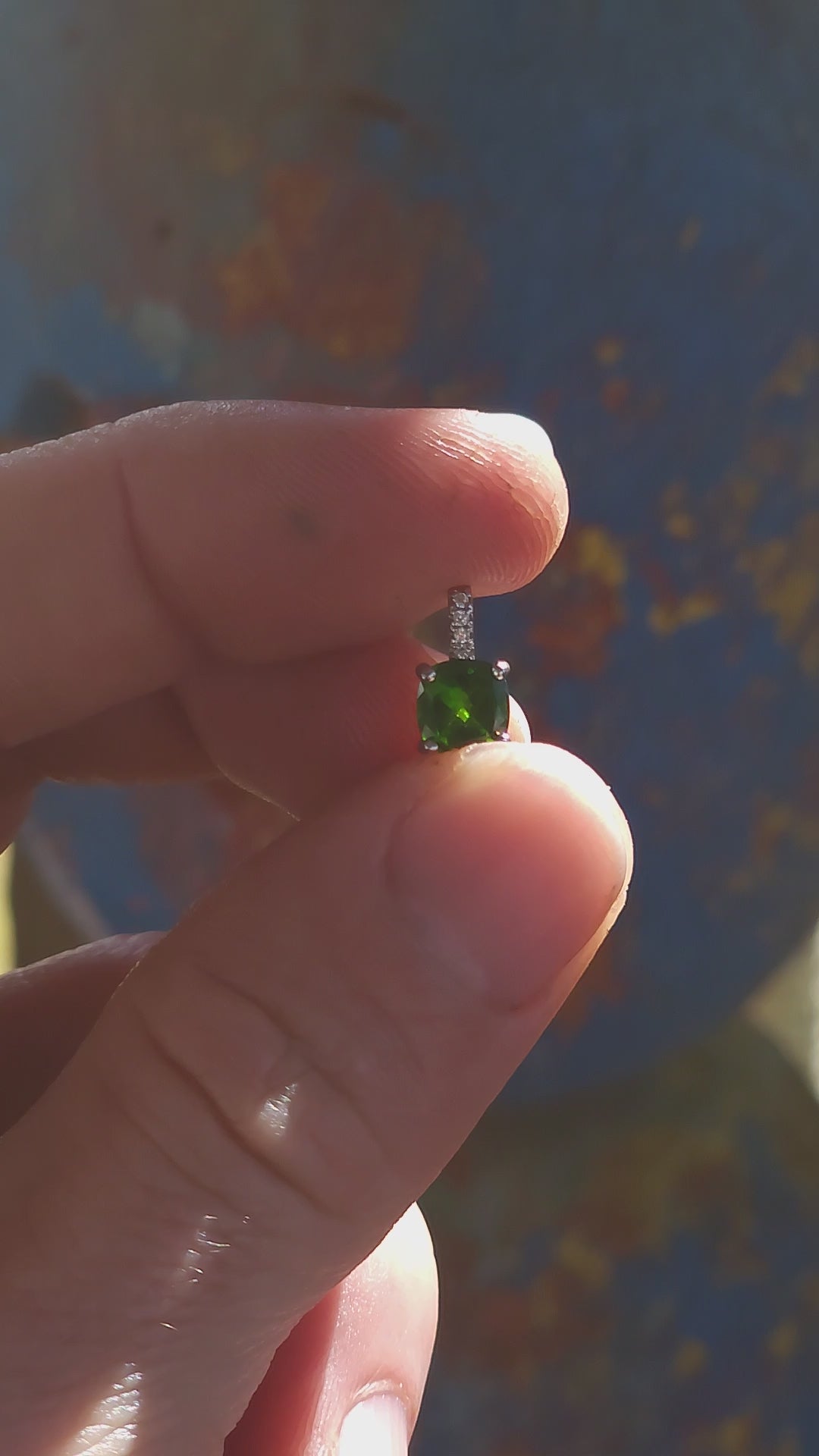 The gem is set in a secure four-prong cradle and suspended from a pavé CZ-adorned bail, adding just the right amount of icy sparkle to contrast the gem’s rich forest-green fire. Whether worn alone or paired with silver chains, this pendant adds a refined, collector-grade pop of colour.