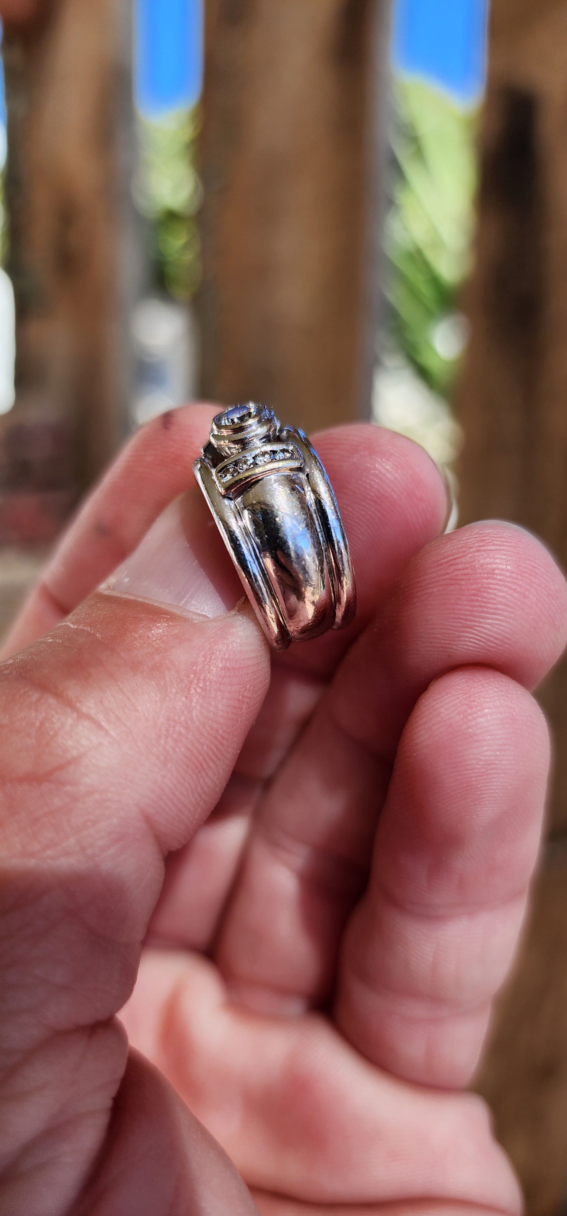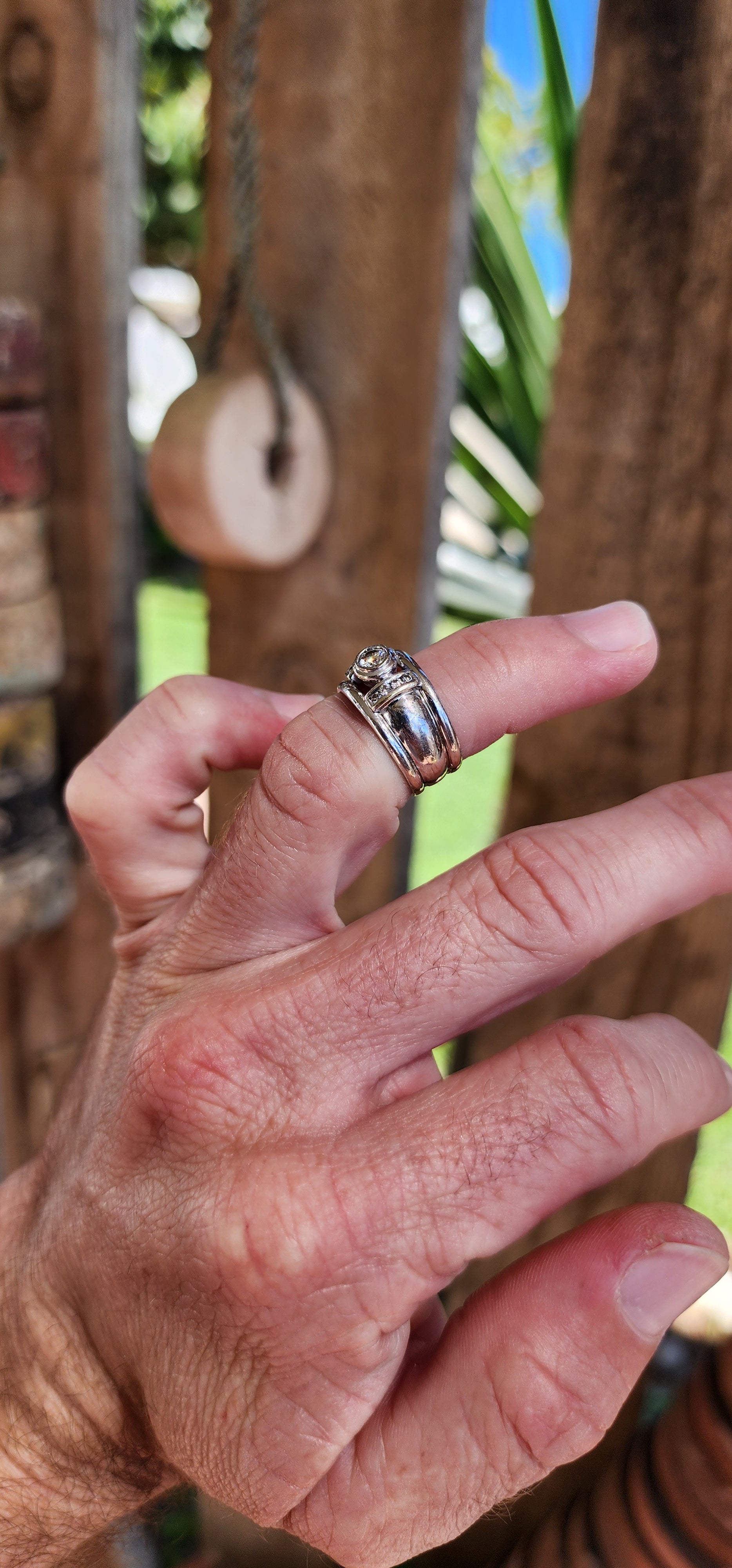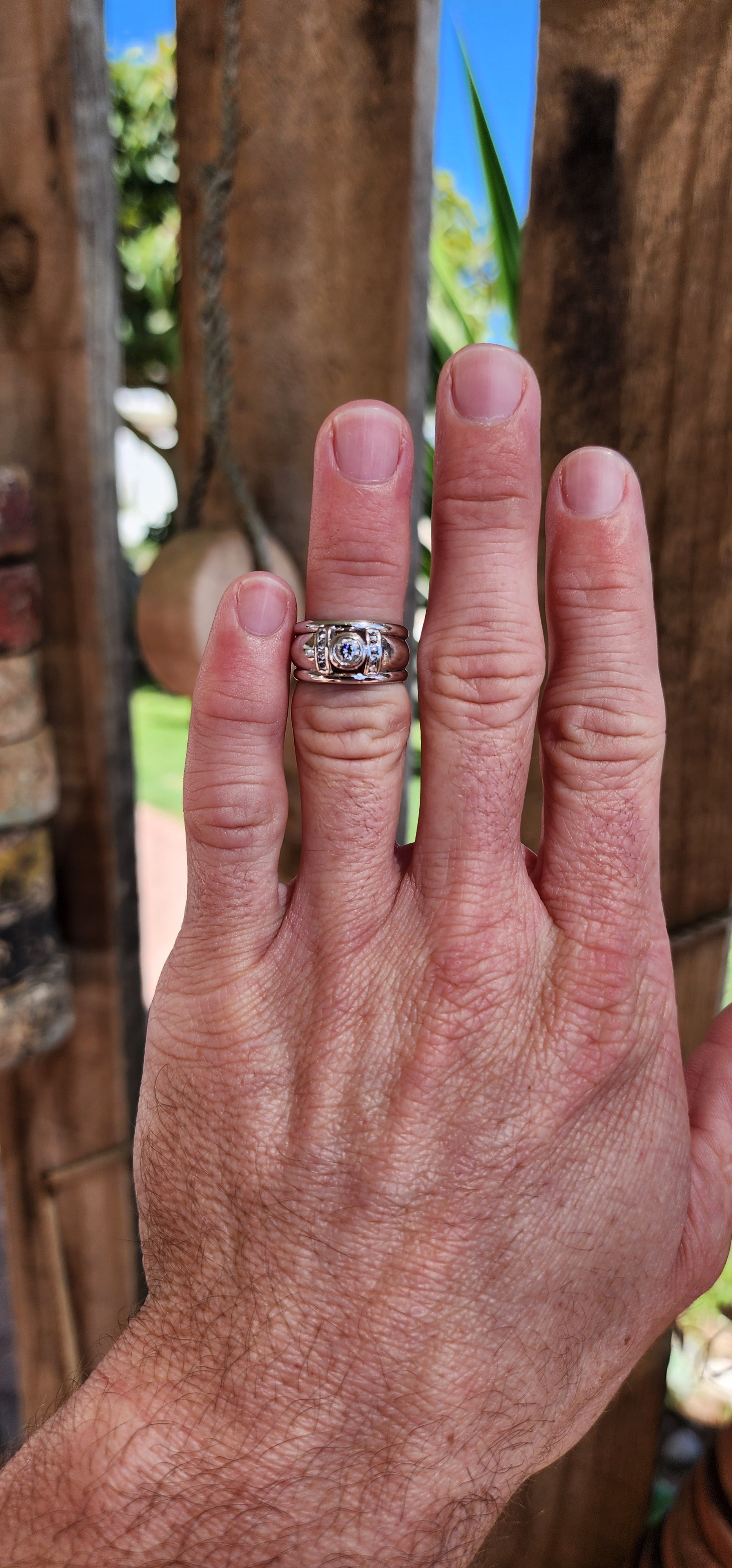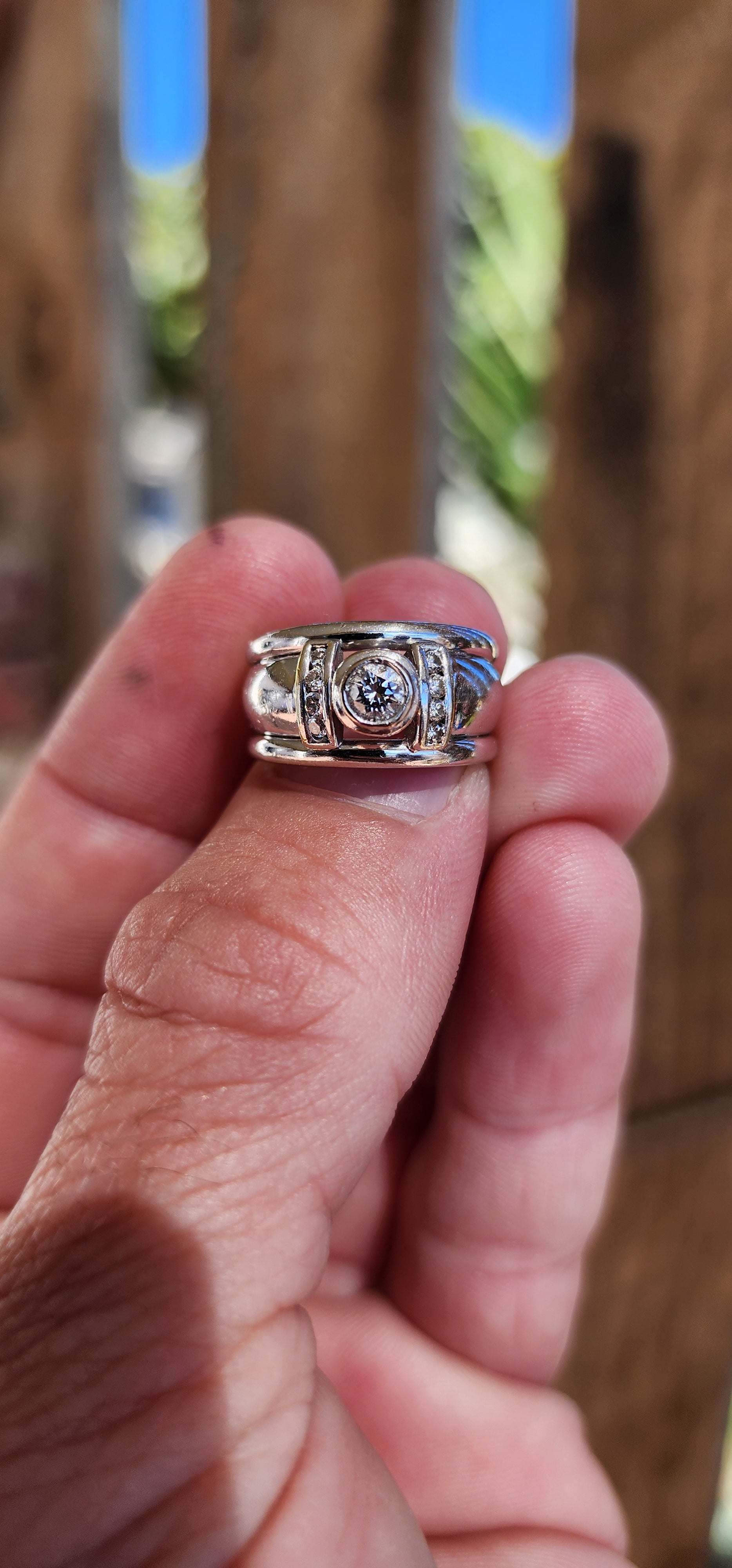 Chunky and solid 18ct White Gold dress ring-Bezel set with an generous in size Brilliant Round cut centre Diamond and furthermore channel set with 8x smaller Diamonds ( 4x on each shoulder ).