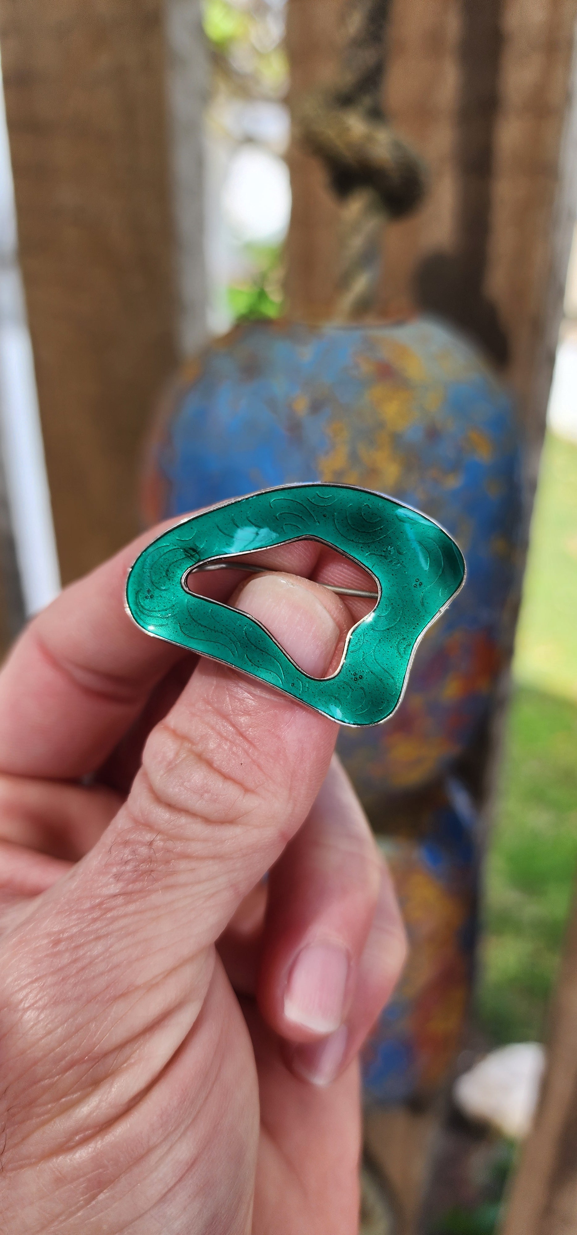 Sought after Scandinavian beauty - Vintage 1960's Modernist Designer Sterling Silver and Green Enamel Guilloché brooch.