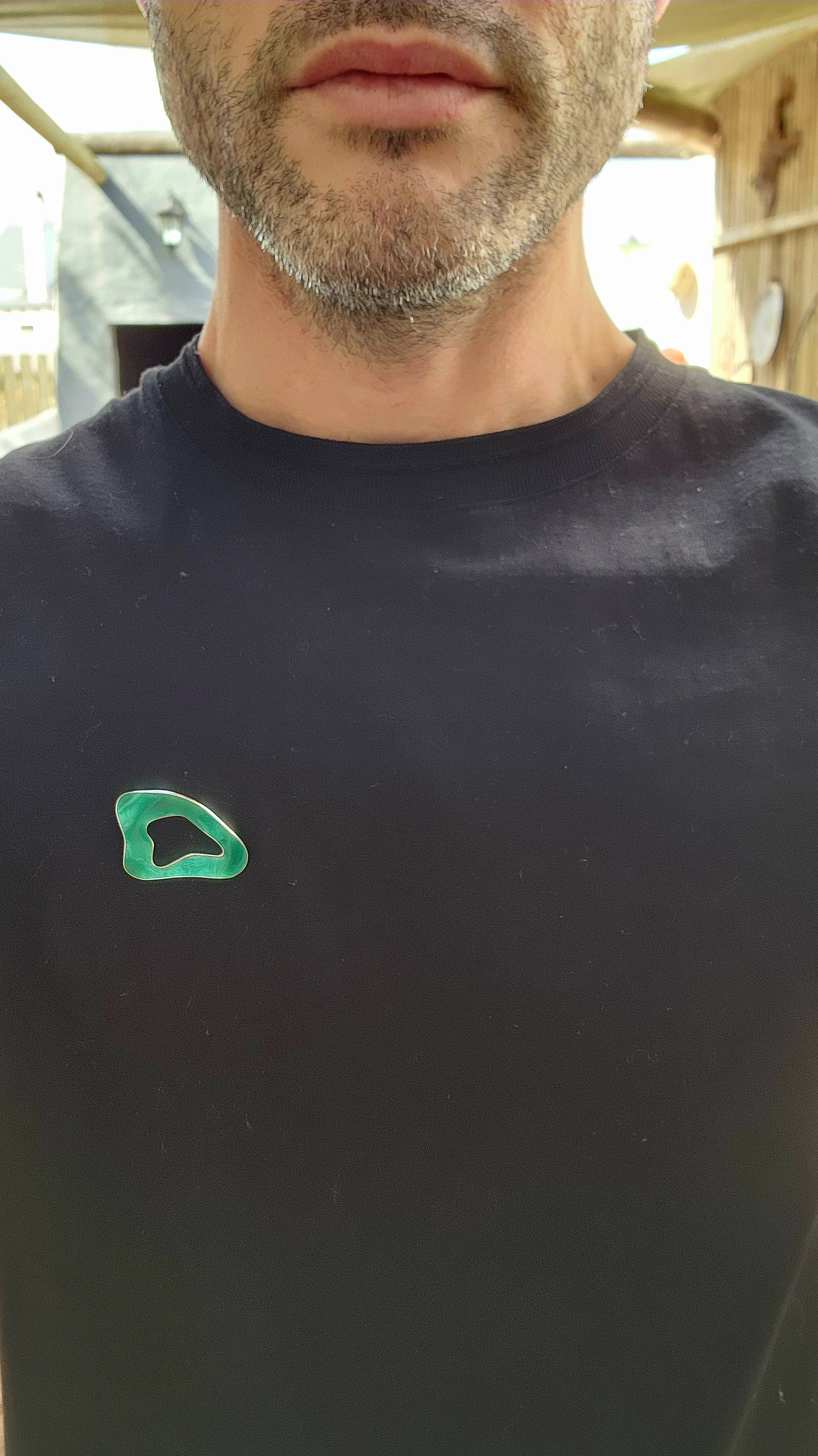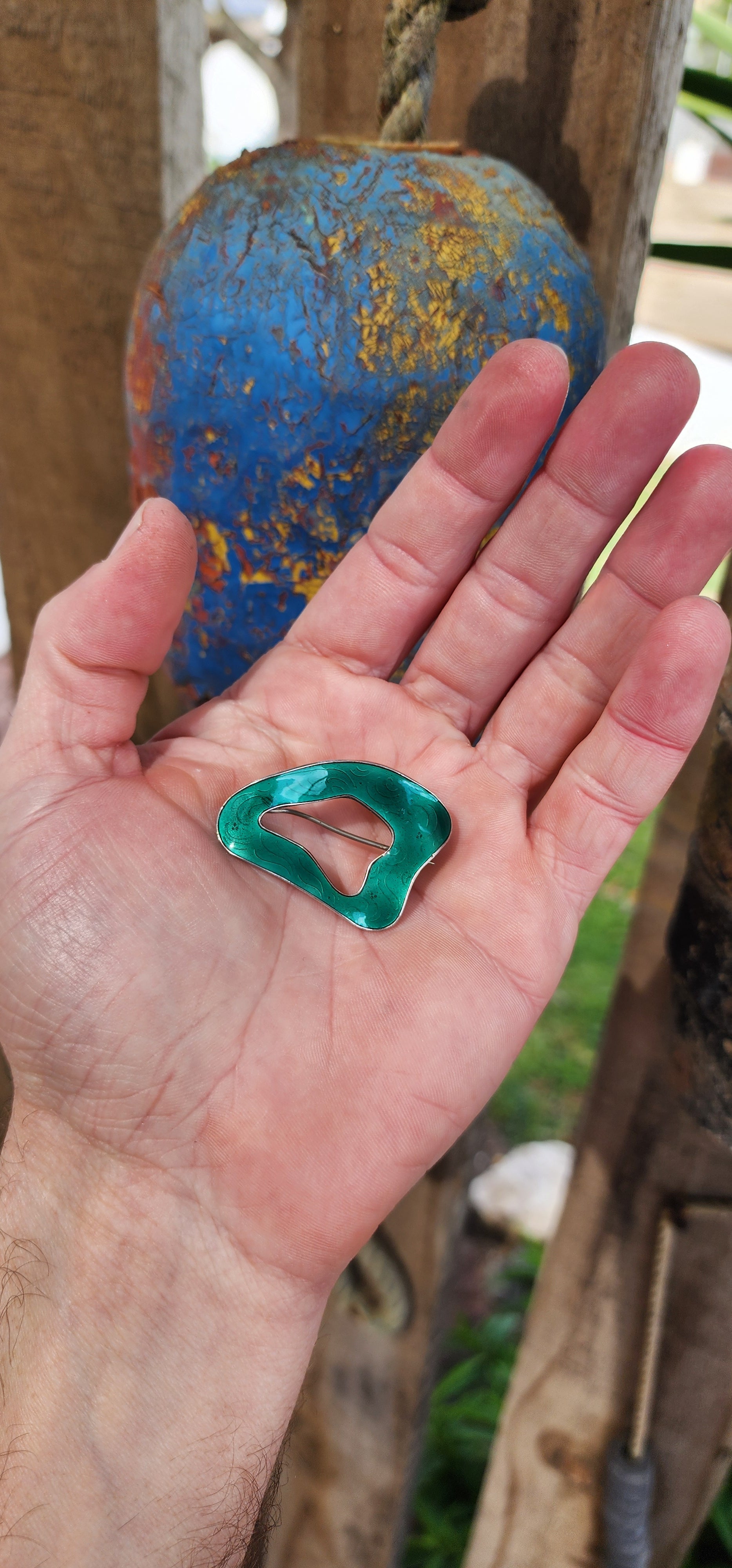 The design of the brooch is asymmetrical and abstract, reflecting the modernist trend of the 1960s that emphasized geometric and organic forms. The smooth, flowing edges combined with the detailed guilloché pattern lend a harmonious balance between simplicity and sophistication. The green color, vibrant and eye-catching, pairs elegantly with the silver frame, highlighting the artisan’s skill in color selection and enamel application.