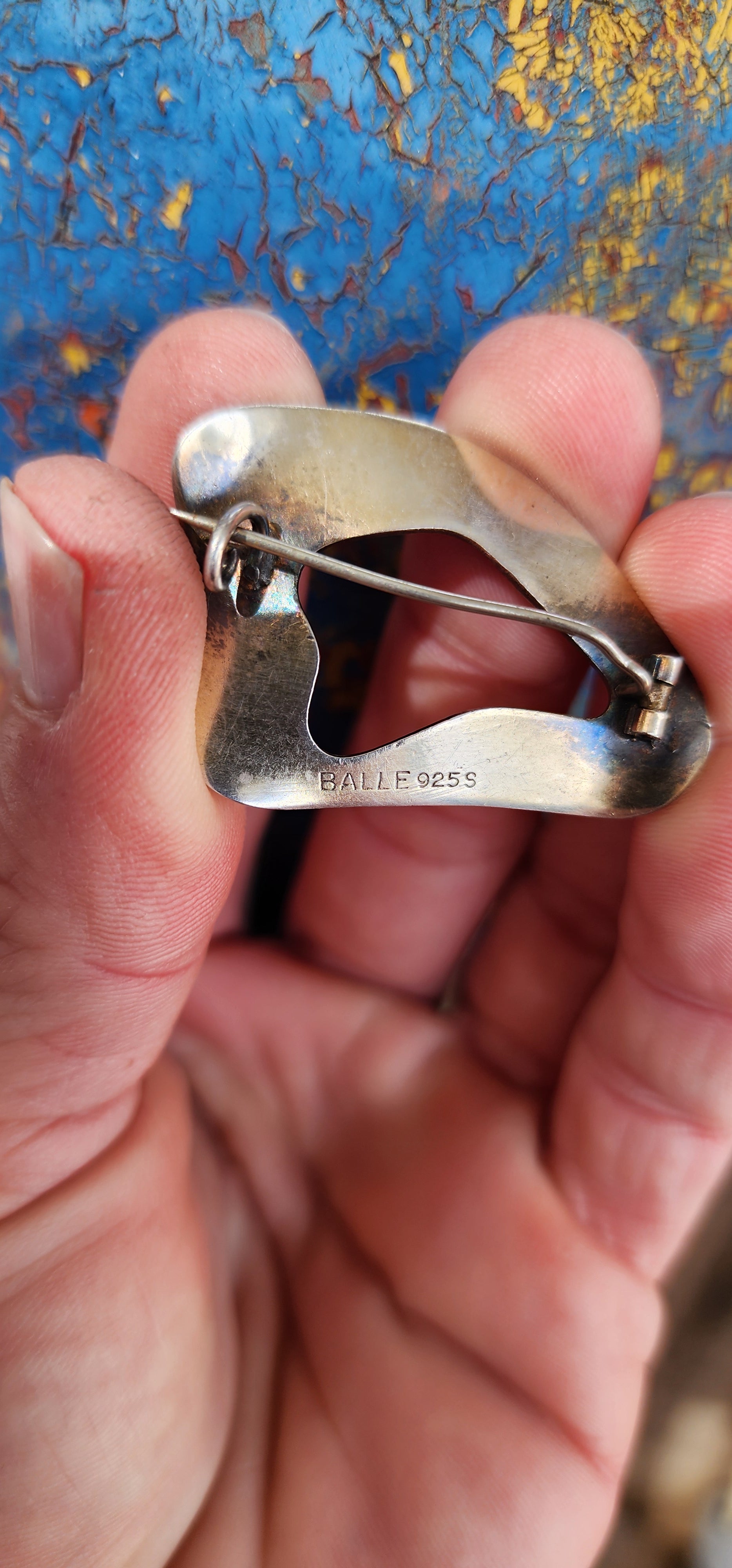 This brooch is a beautiful example of mid-20th-century Scandinavian design, showcasing the distinctive work of Oystein Balle, a renowned Norwegian silversmith known for his modernist approach and use of bold colors and intricate enamel work.