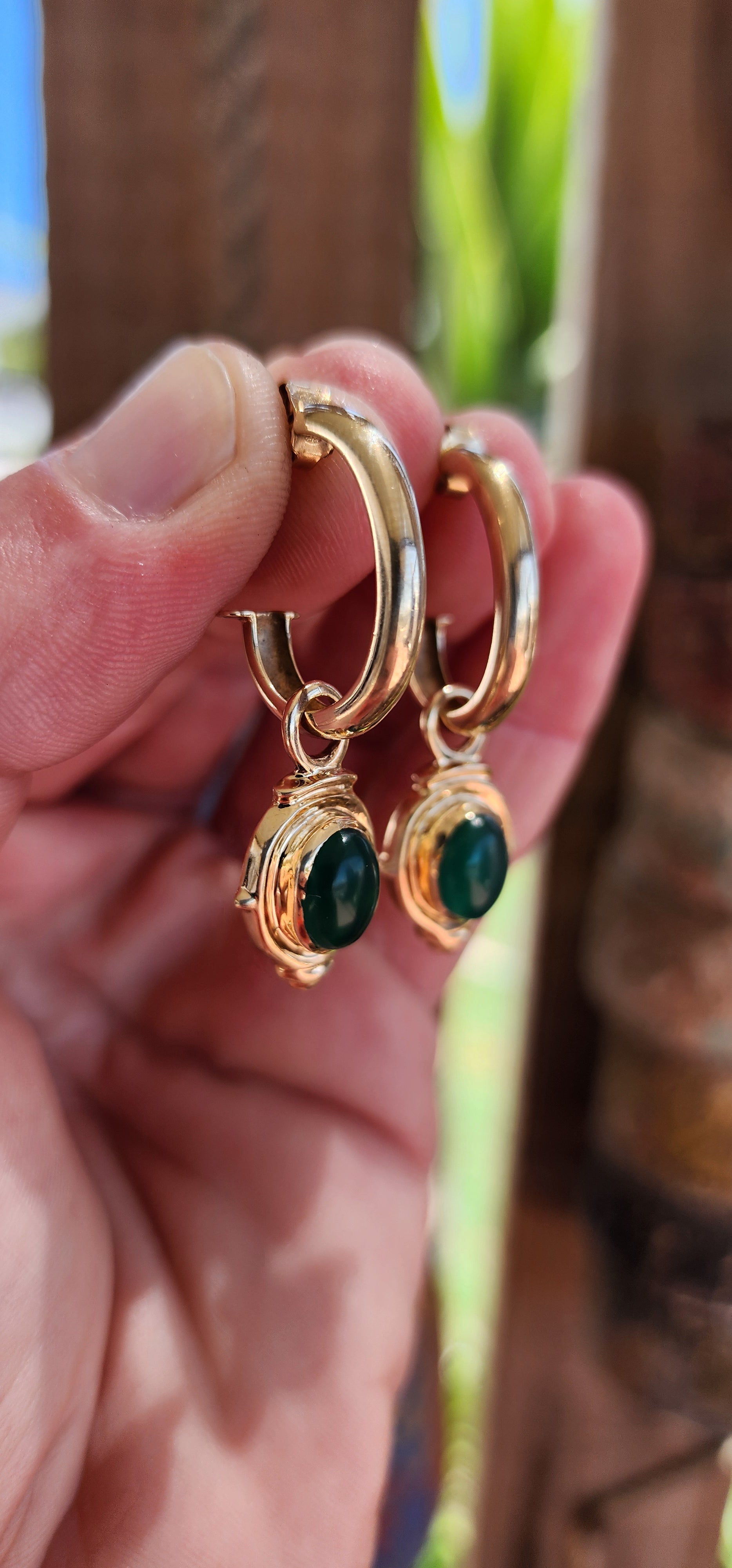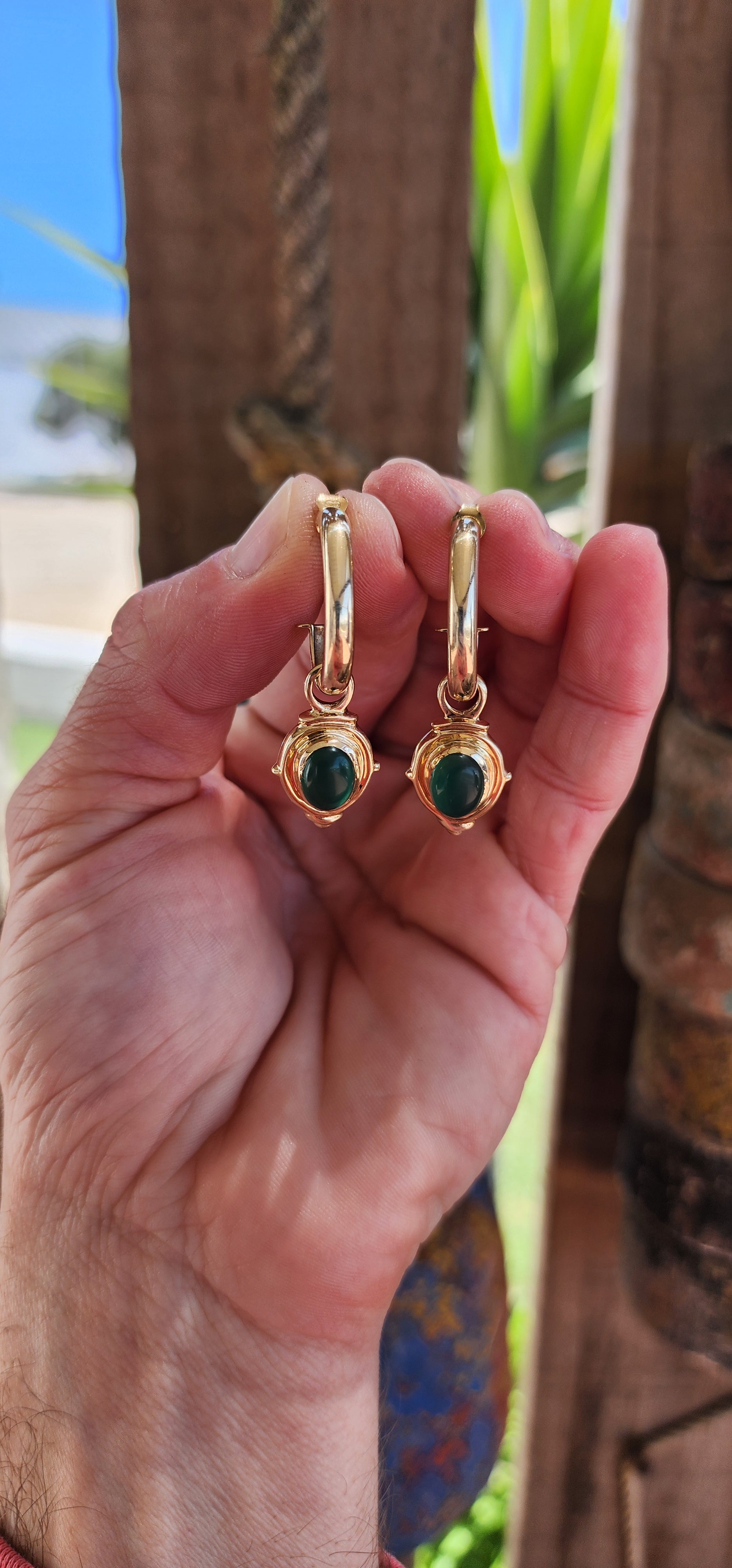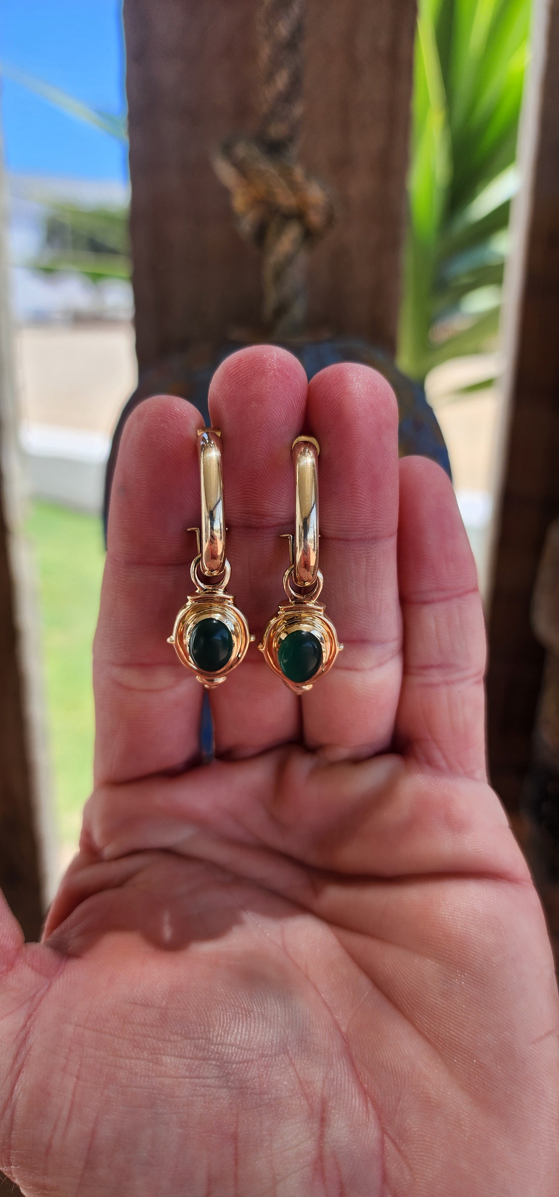 Measurements :The hoops each measure 2.3cm x 1.8cm x 3.8mm wide excluding the dangles. Each of the dangles measure 2.3cm x 1.4cm.Each half hoop including the dangle with a drop of 4.2cm.Each of the oval cut chalcedony cabochons measure 9mm x 7mm.Earrings with a combined weight of 8grams
