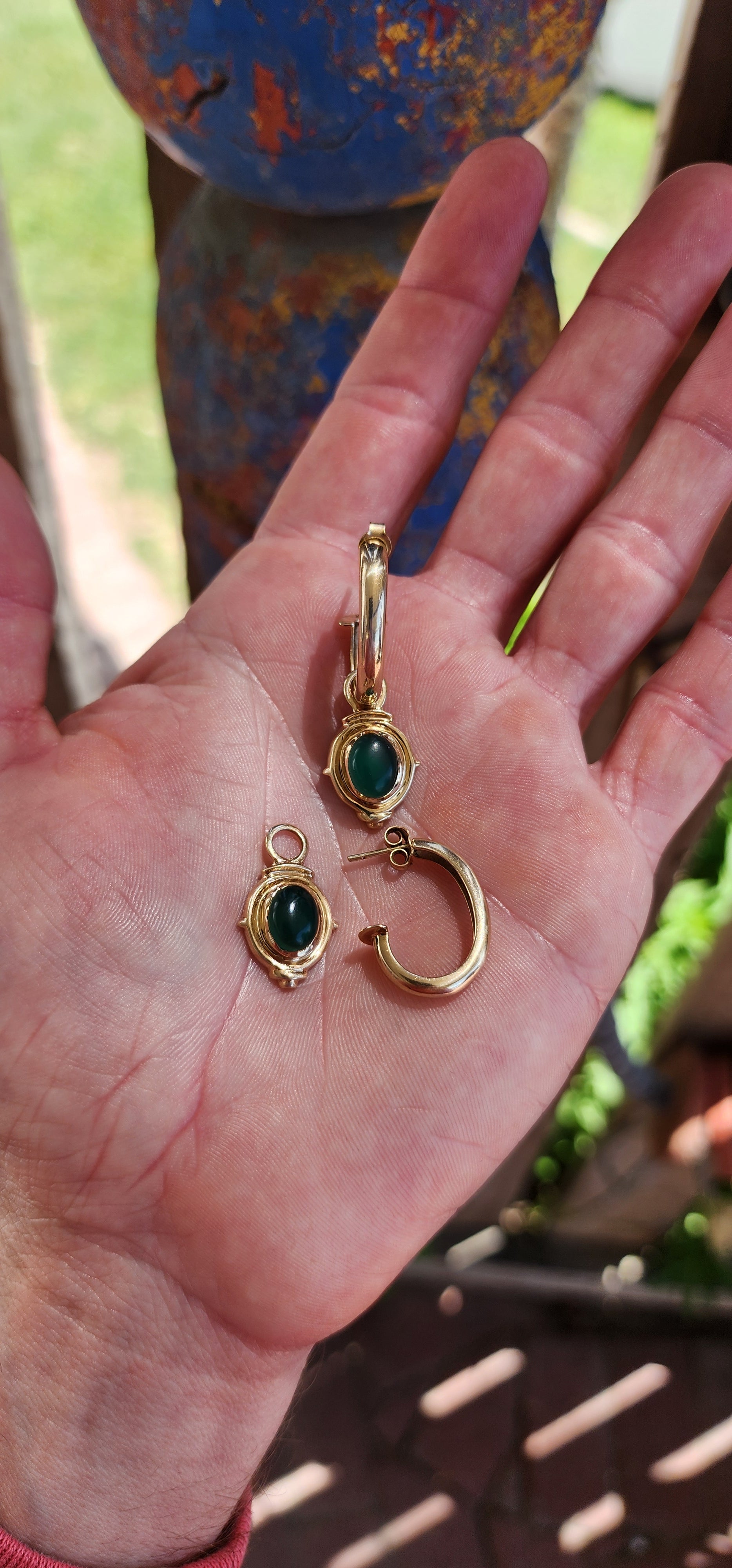 The detachable dangles are a true work of art. Encased in intricate goldwork reminiscent of ancient Roman motifs, each dangle is tube-set with a vibrant oval green chalcedony cabochon.