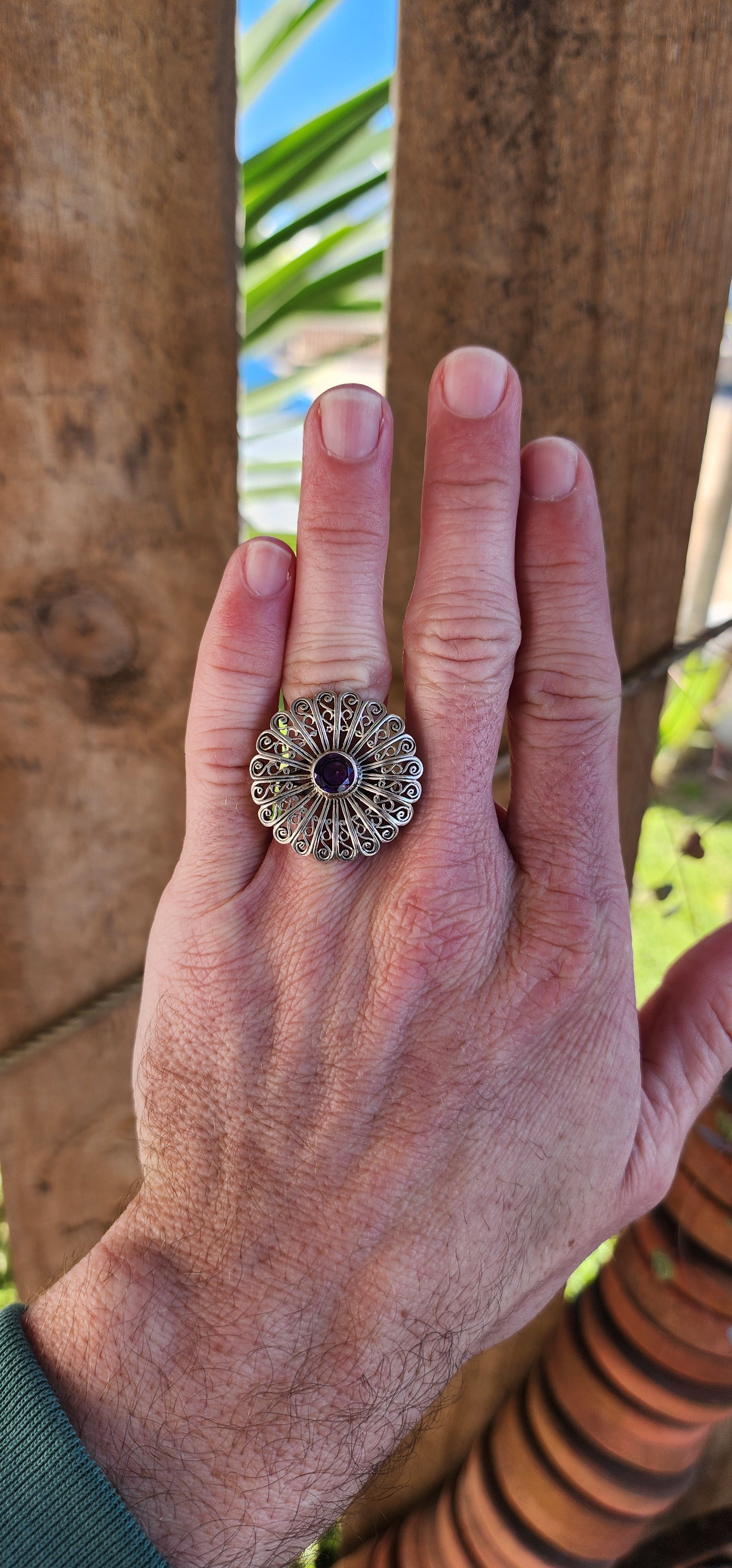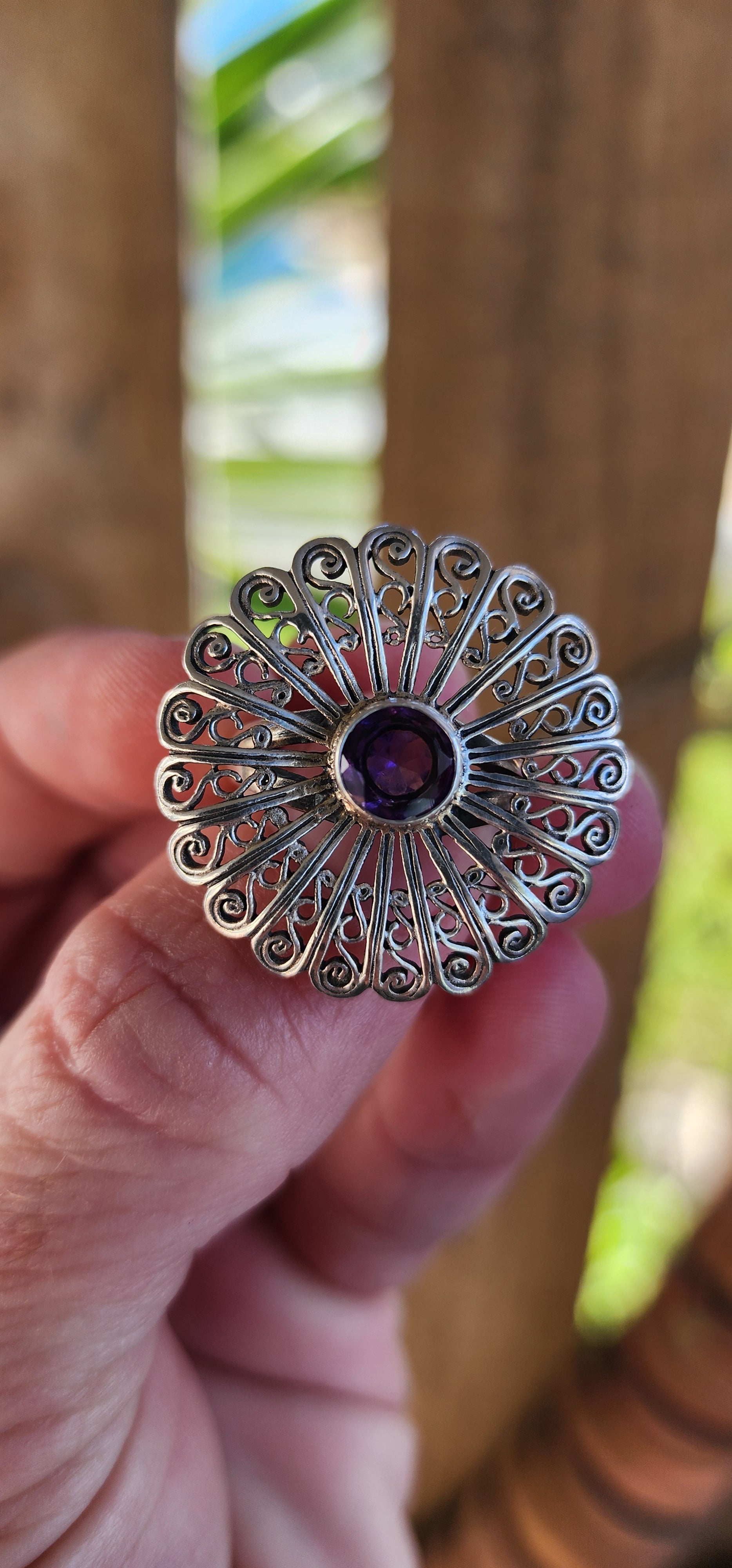 Beautiful and chunky Sterling Silver and Amethyst openwork Floral Coktail/dress ring.