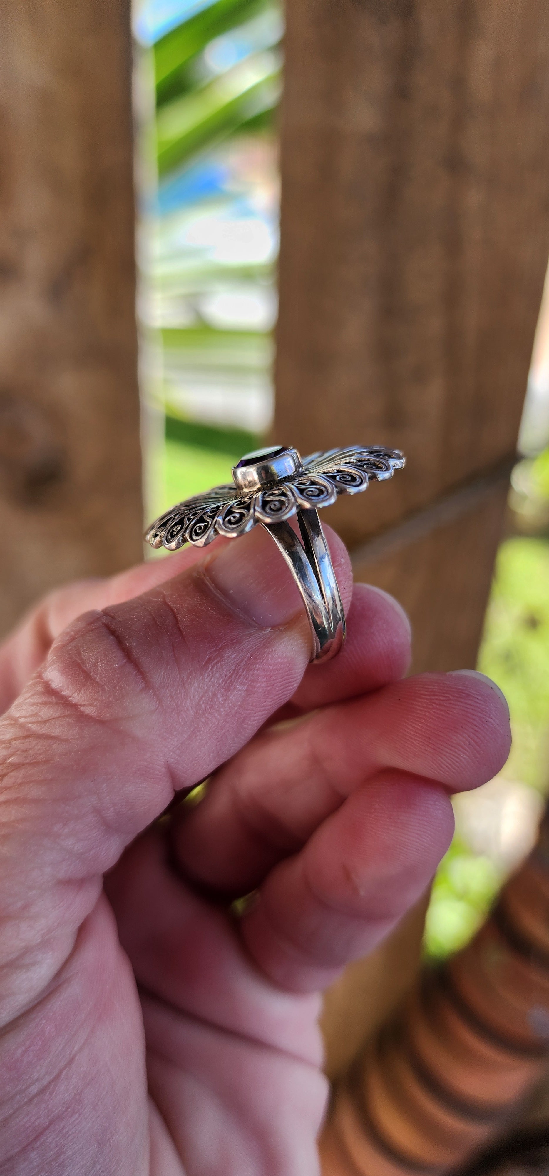 Sterling Silver and Amethyst openwork Floral Coktail/dress ring. A Sparkling Purple Amethyst forms the center of a large statement flower. The intricate petals offer an eye-catching allure.