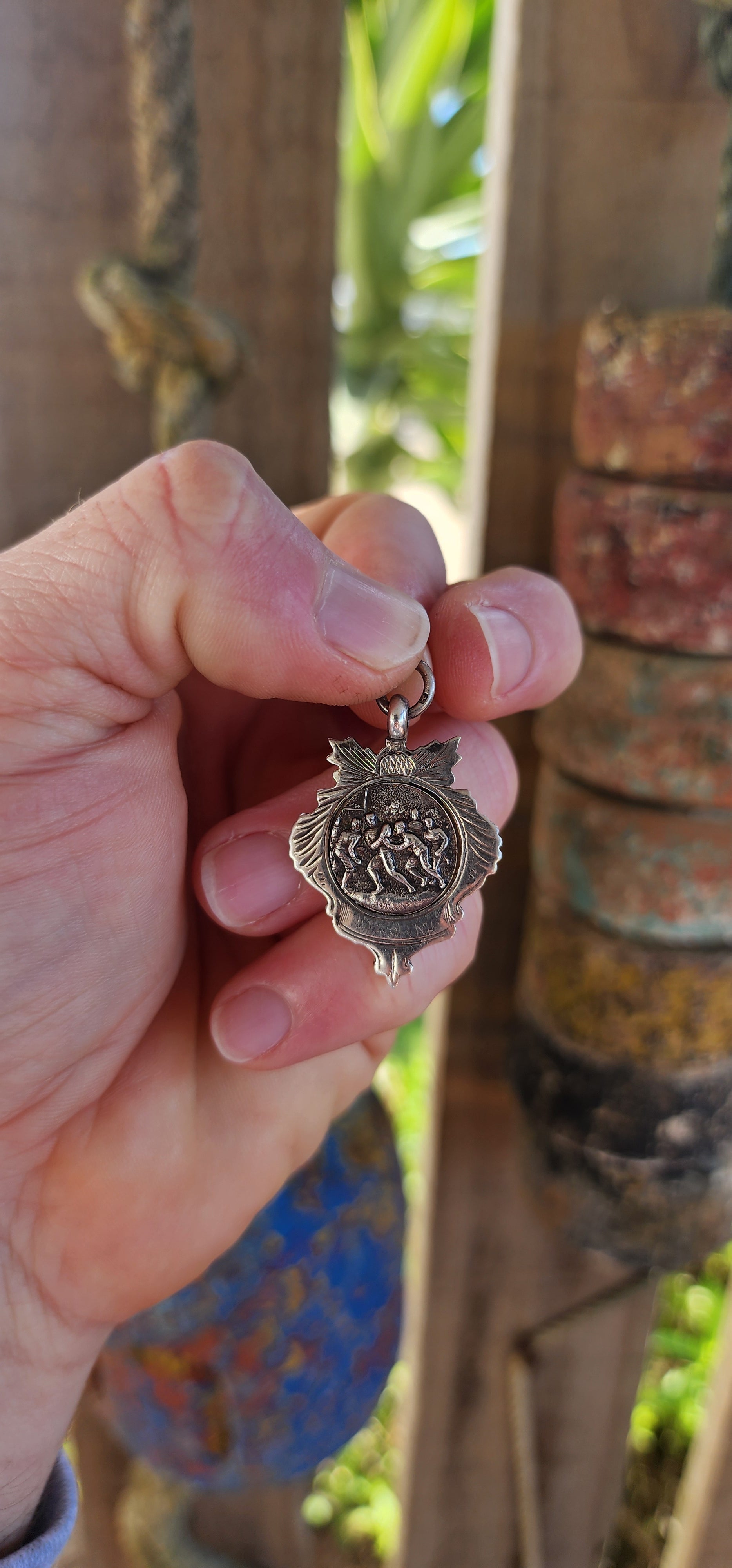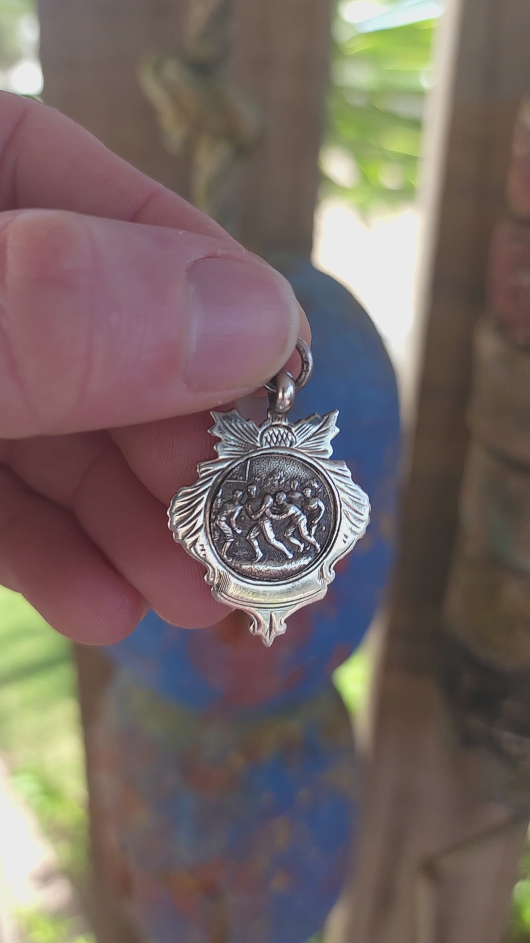 A marvelous survivor from the golden age of sport! This hallmarked sterling silver fob shield pendant carries with it nearly a century of history, crafted with fine detail by one of Birmingham’s most respected silversmithing firms.