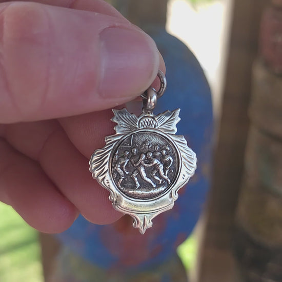 The fob is shaped as a shield medal, its outer edge adorned with foliate flourishes and crowned with a thistle-inspired finial. At its heart rests a raised circular medallion in deep relief, capturing a vigorous sporting scene of rugby/football players in full motion—muscular figures frozen mid-battle for possession, their energy and determination immortalized in silver.