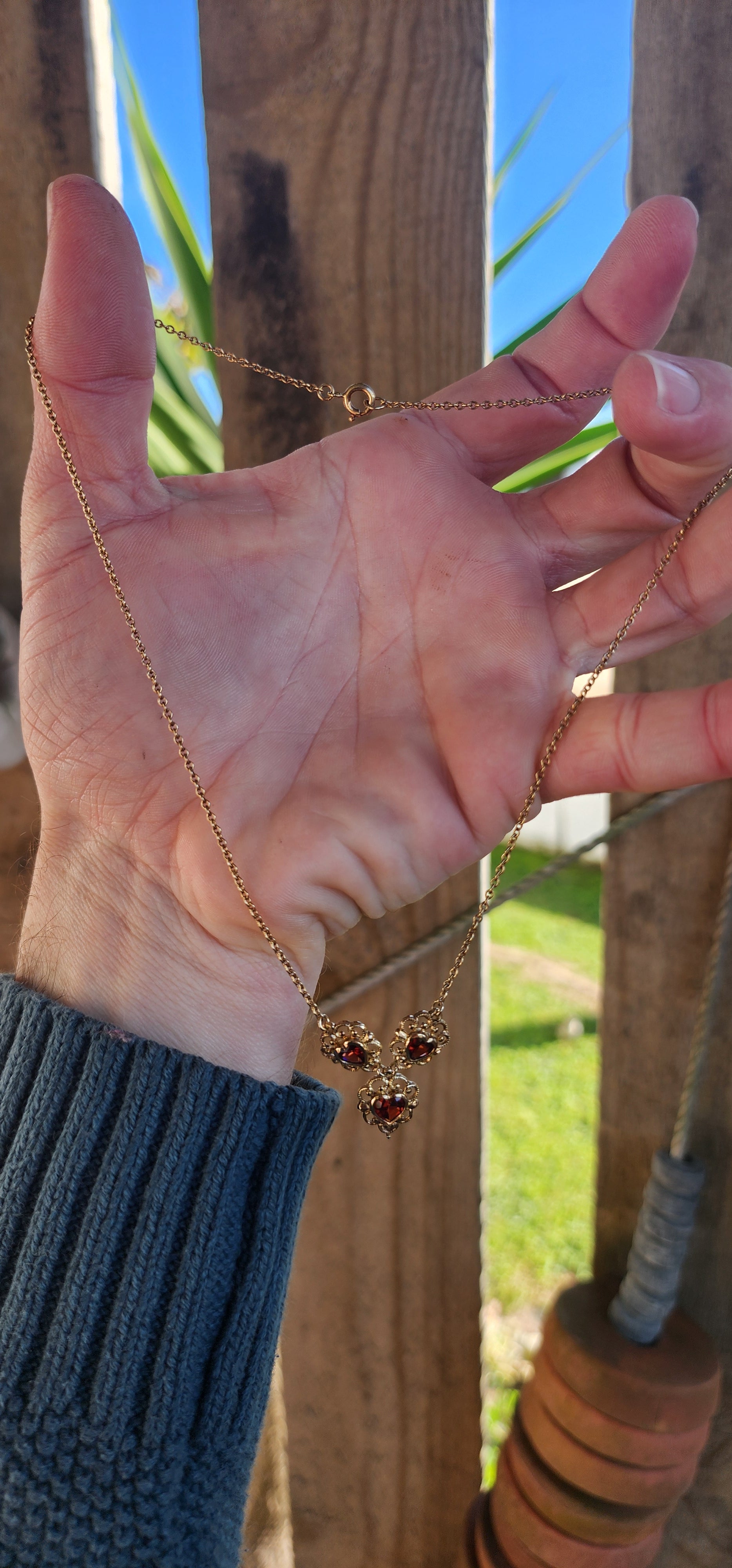 Measurements :Necklace with a total length of 43cm.Each of the Heart shaped pendants measure 1.2cm x 1.2cm.Each of the Heart cut Garnet Gemstones measure 6mm x 5mm.Necklace with a total weight of 4.8grams.