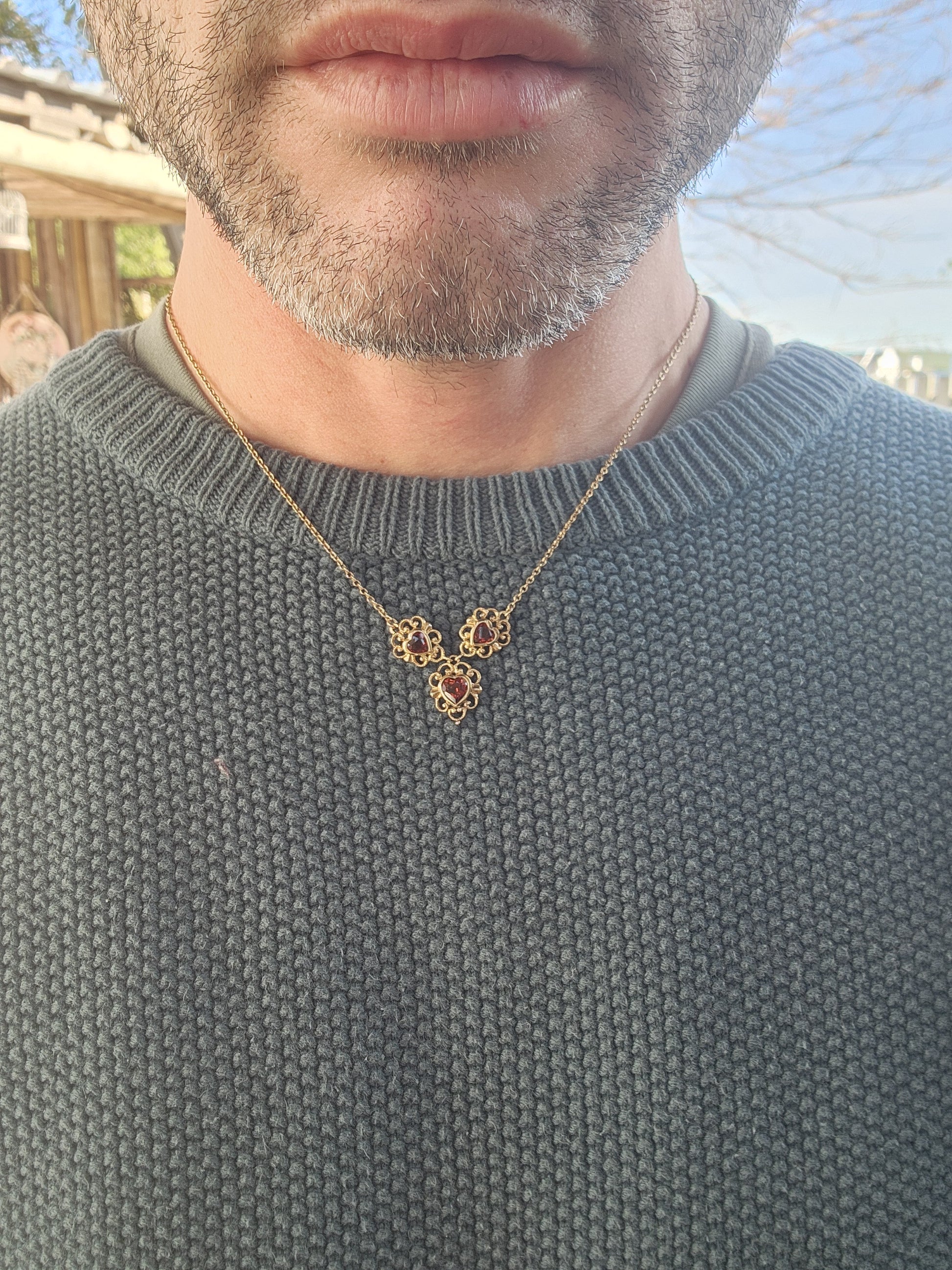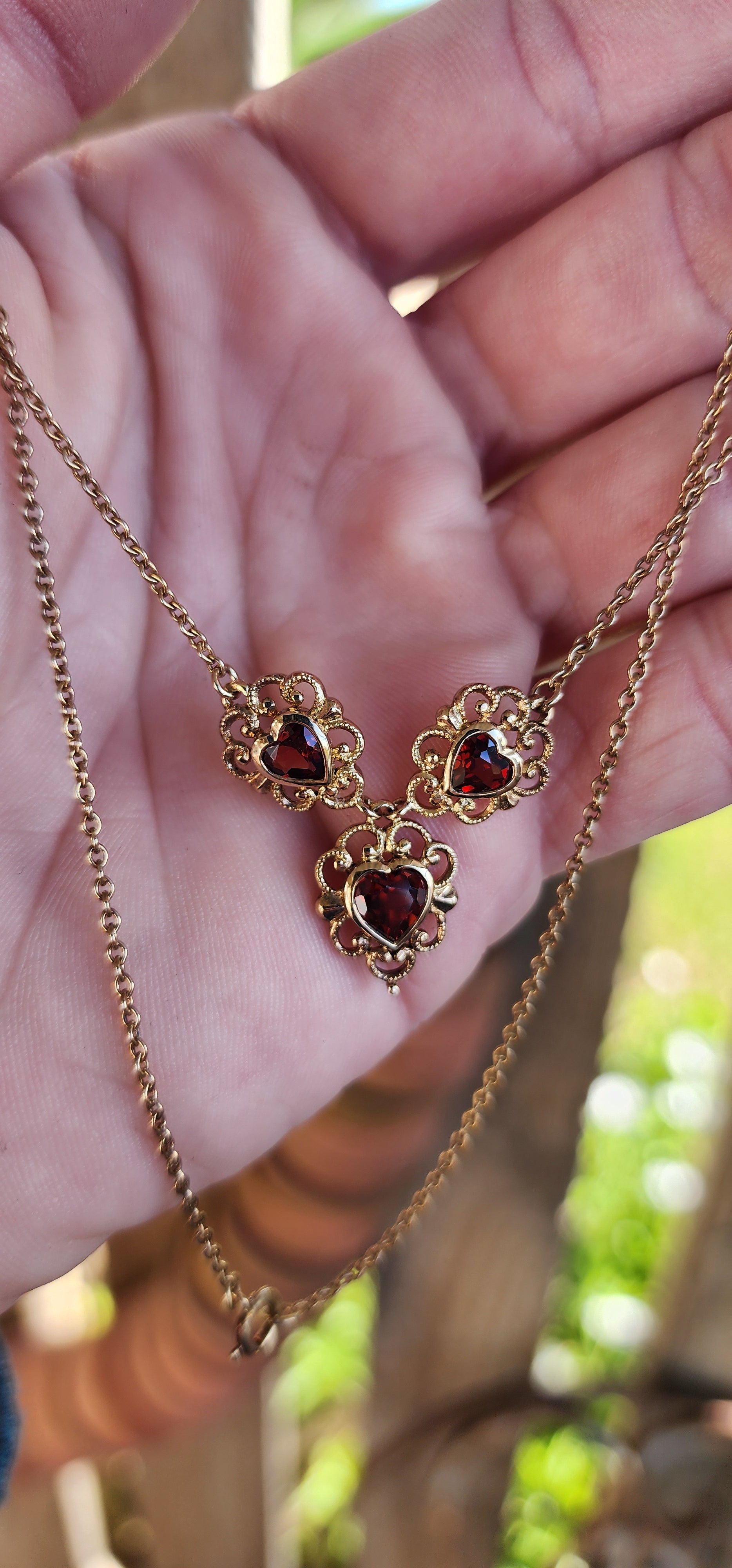 The most beautiful and petite necklace designed in a glorious Antique style. Crafted in Sterling Silver with 18ct Yellow Gold plating, the necklace features triple jointed Heart pendants ,each pendant bezel/tube set with a fancy Heart cut Garnet.