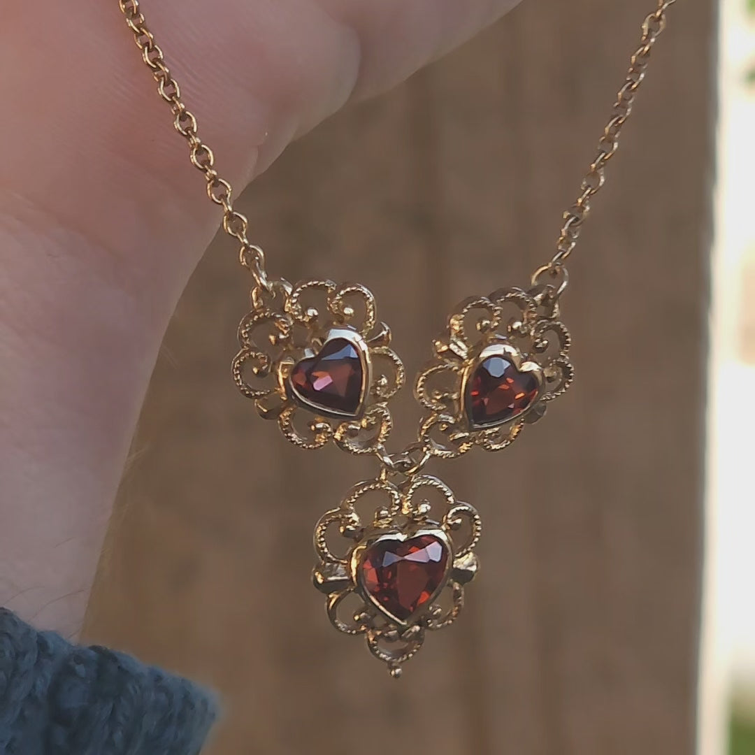 Crafted in Sterling Silver with 18ct Yellow Gold plating, the necklace features triple jointed Heart pendants ,each pendant bezel/tube set with a fancy Heart cut Alamandine Garnet and framed in a ornate filigree frame.