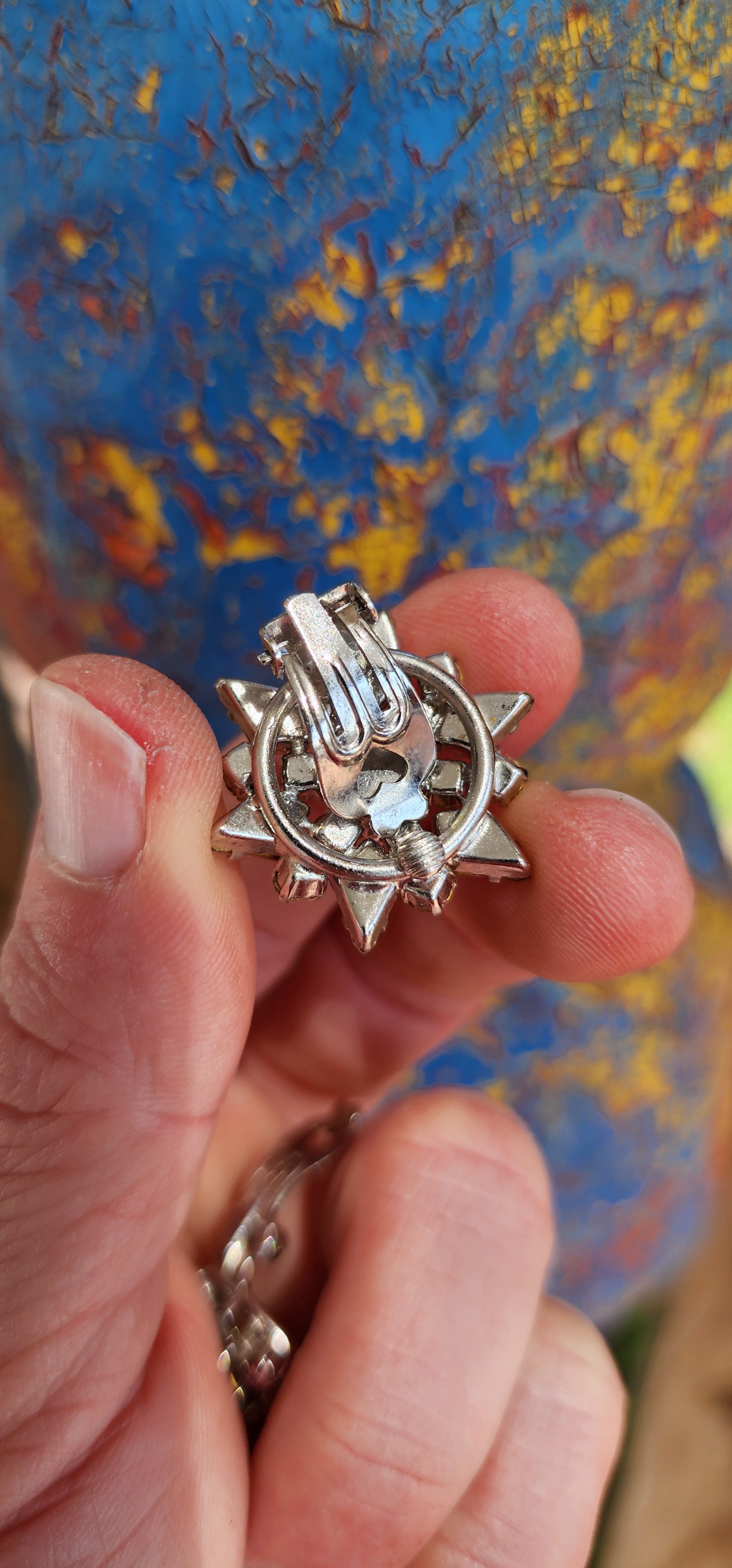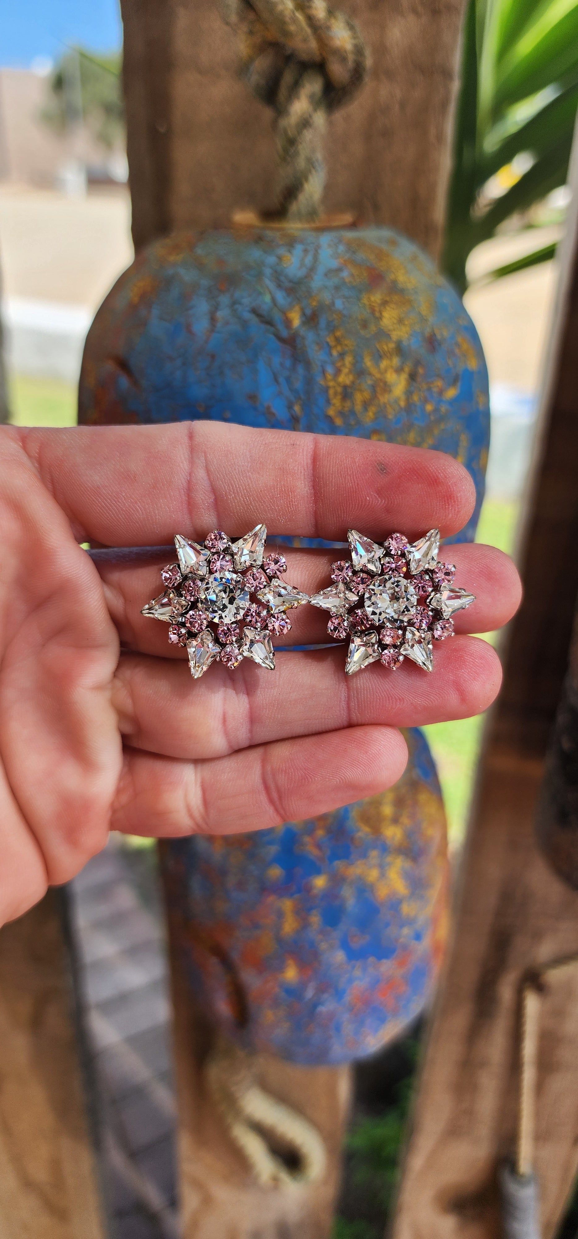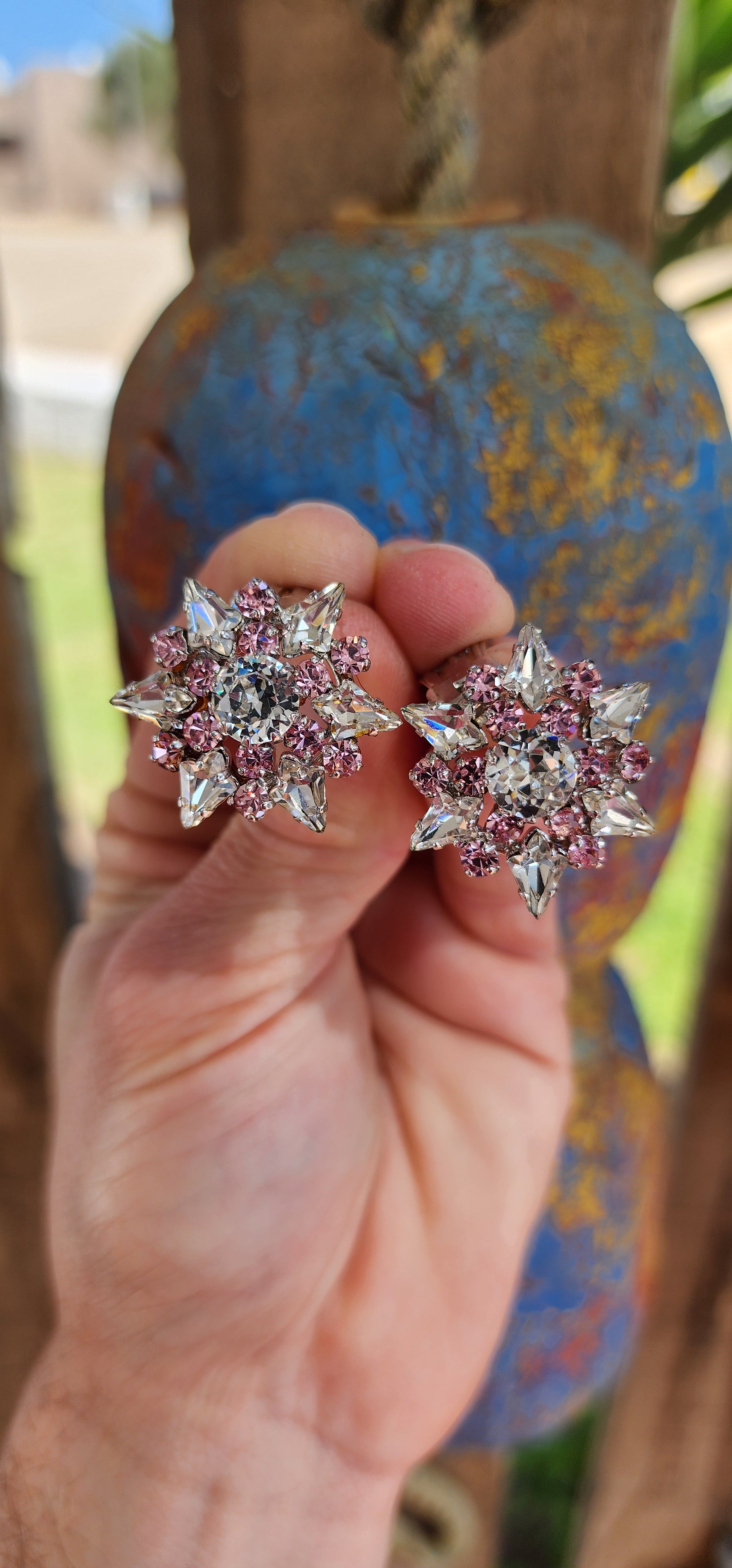 These are extremely pretty ! Vintage pair of Silvertone floral/star shaped Costume clip-on earrings.The earrings flaunting sparkly Austrian Crystal Rhinestones in Pink and Clear , all prong set.