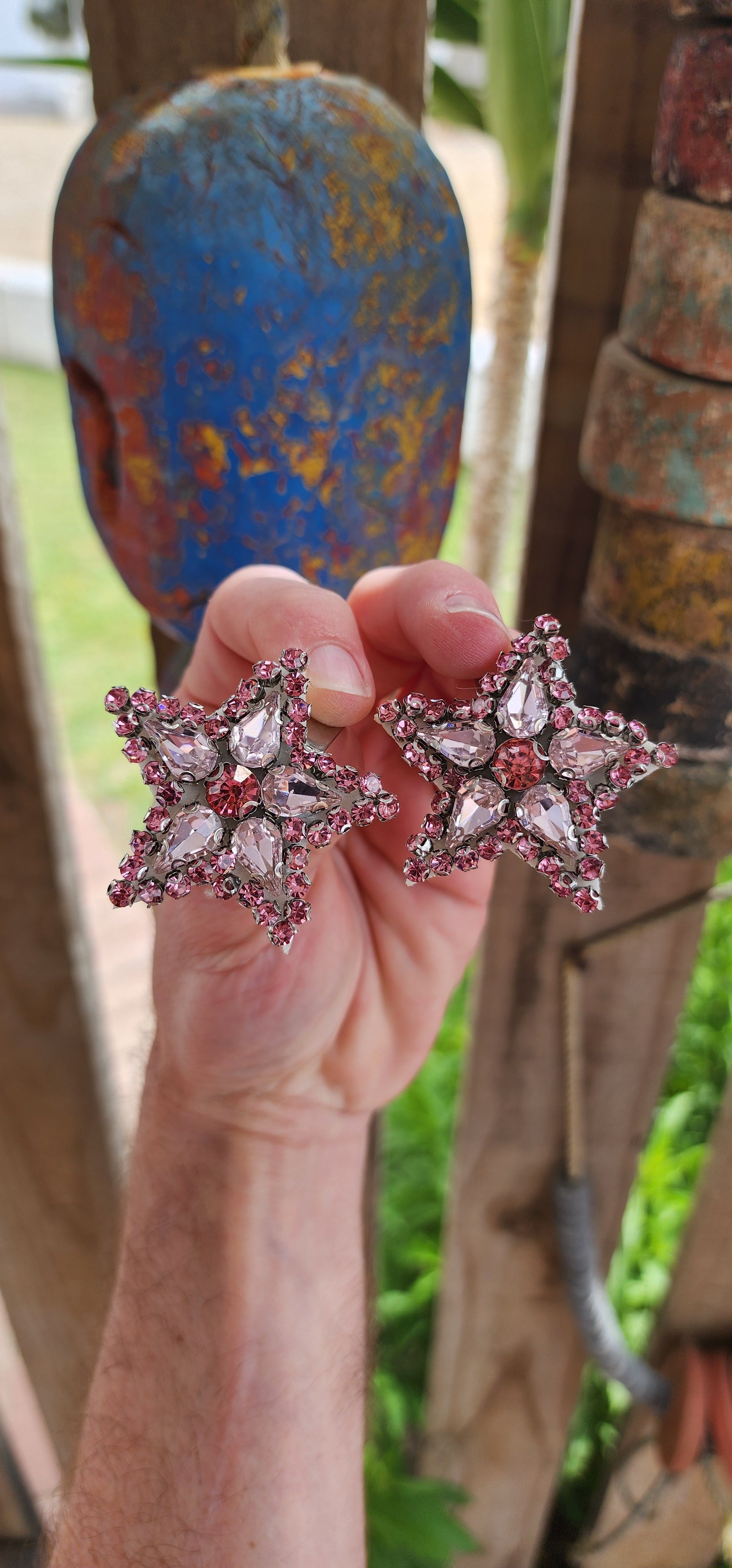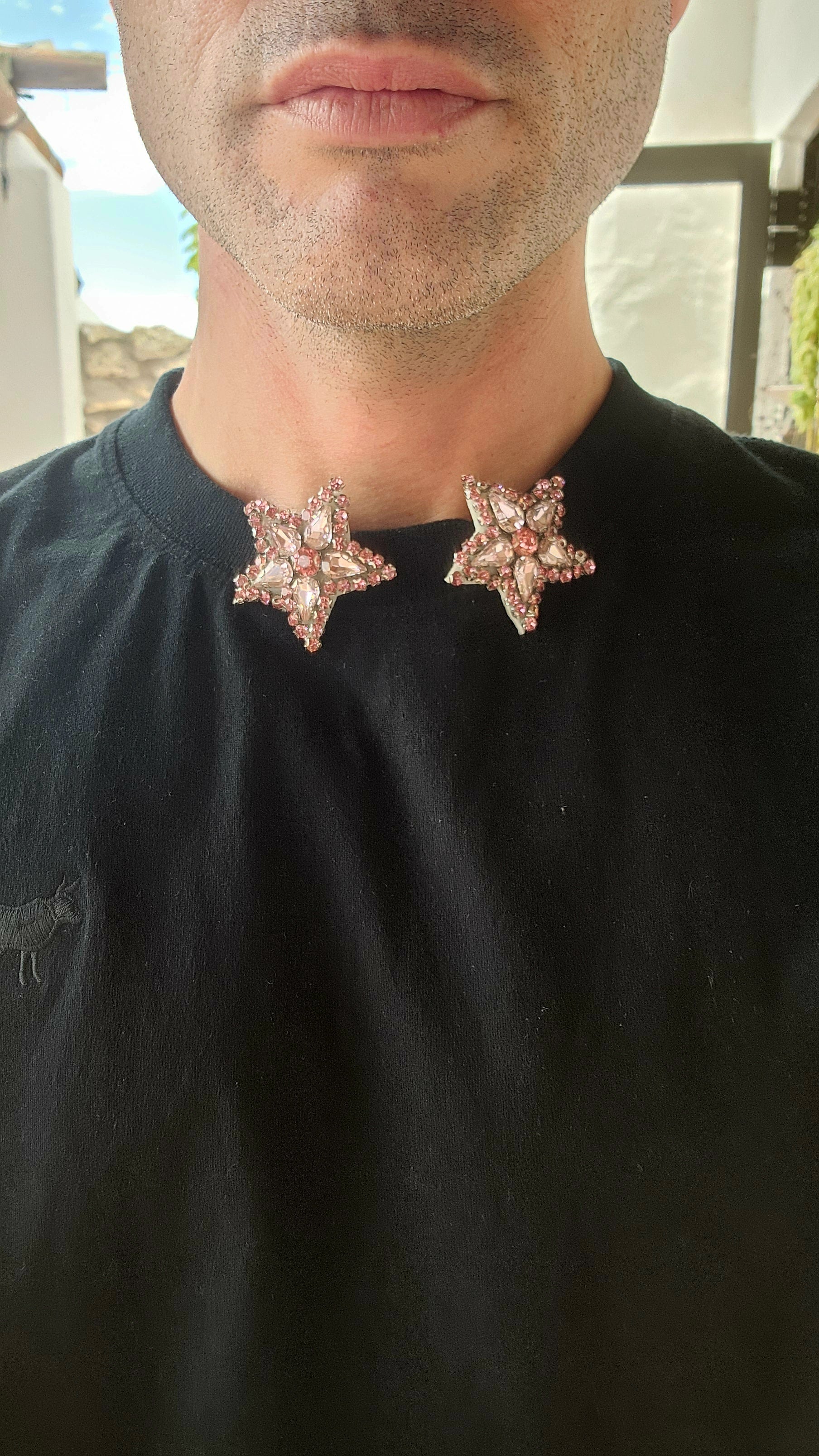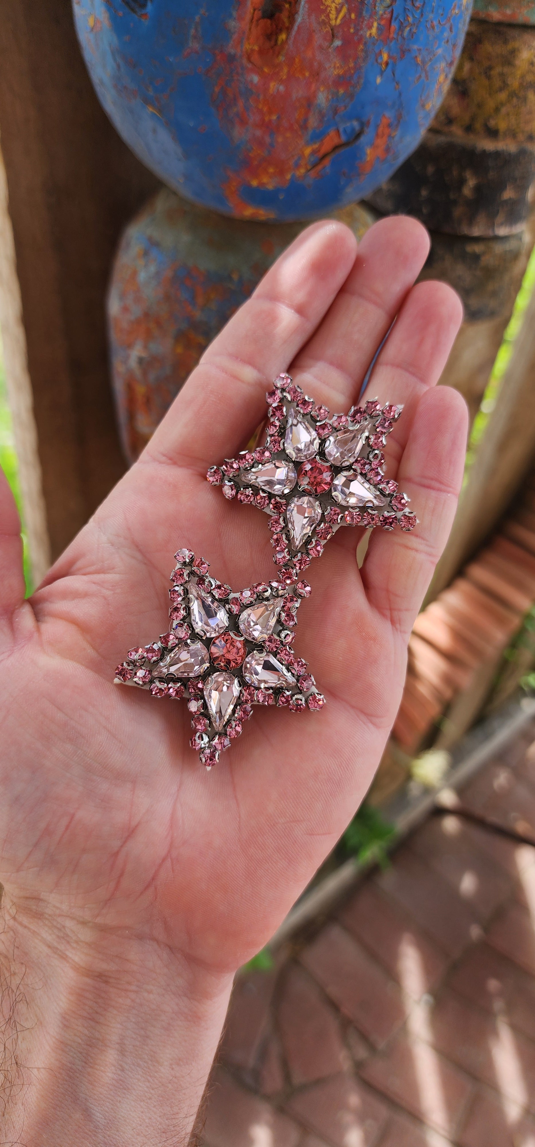 These are fabulous handmade star shaped dress clips that are equal parts dramatic and versatile. Each clip is designed in a bold starburst pattern, featuring a dazzling mix of pink glass rhinestones.