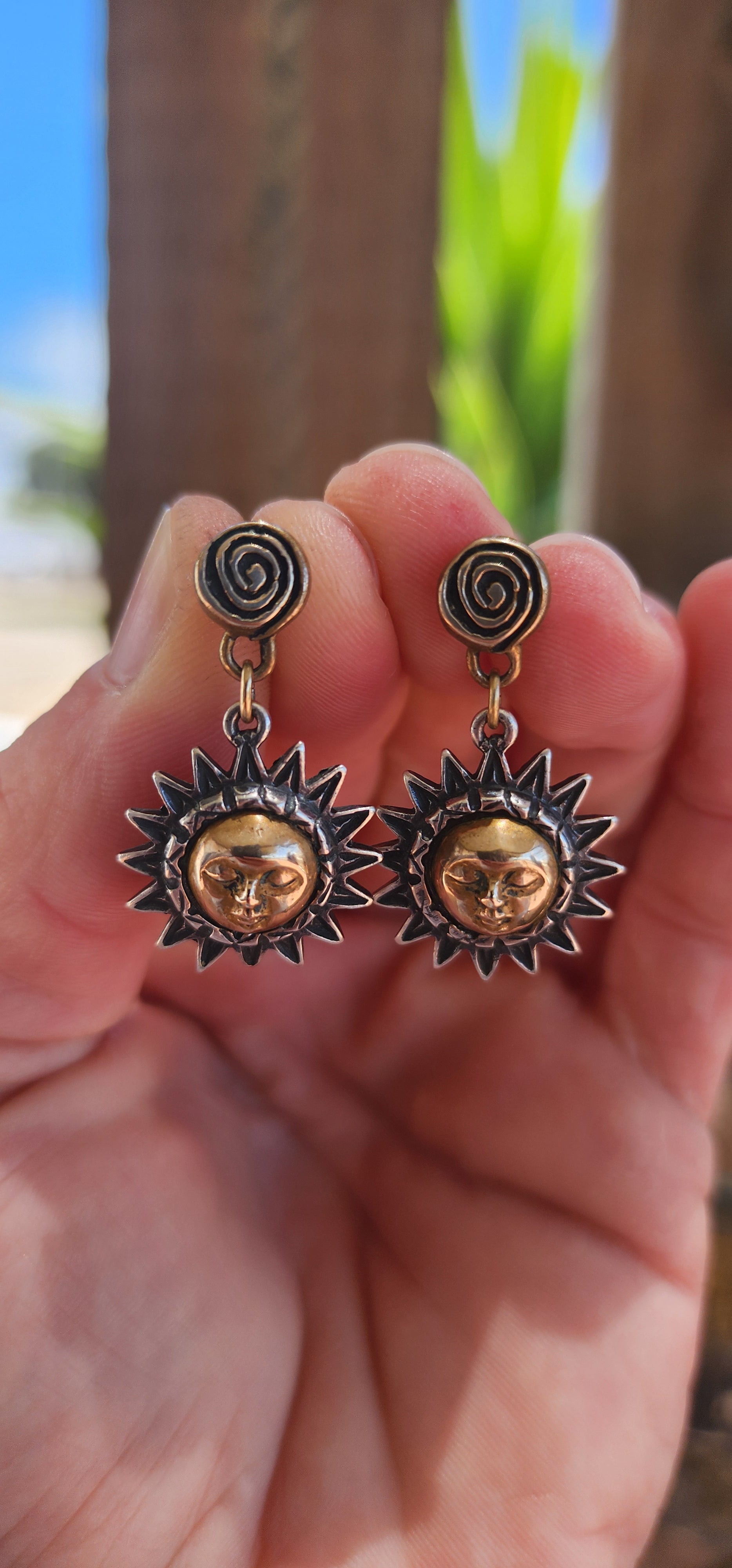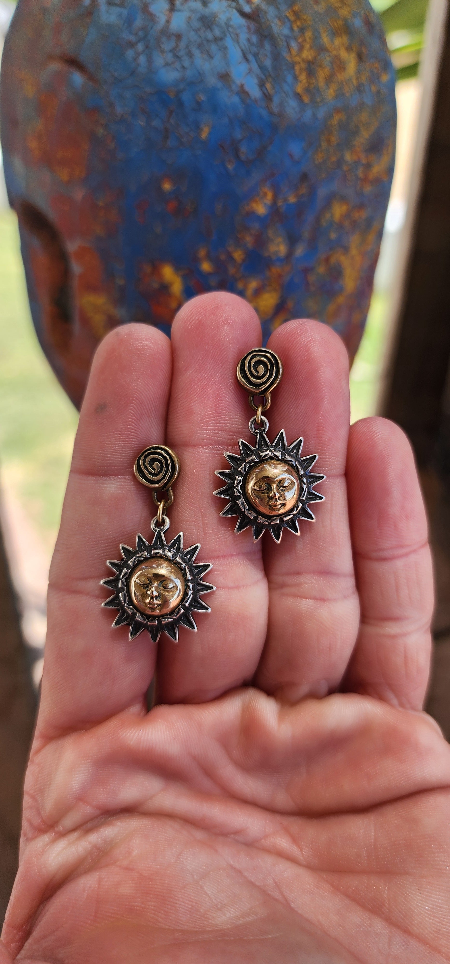 These artisan-crafted vintage push-in earrings are a mesmerizing celebration of celestial beauty. They are composed of two primary elements: sterling silver and brass, working in harmony to create a design rich in texture, symbolism, and contrast.