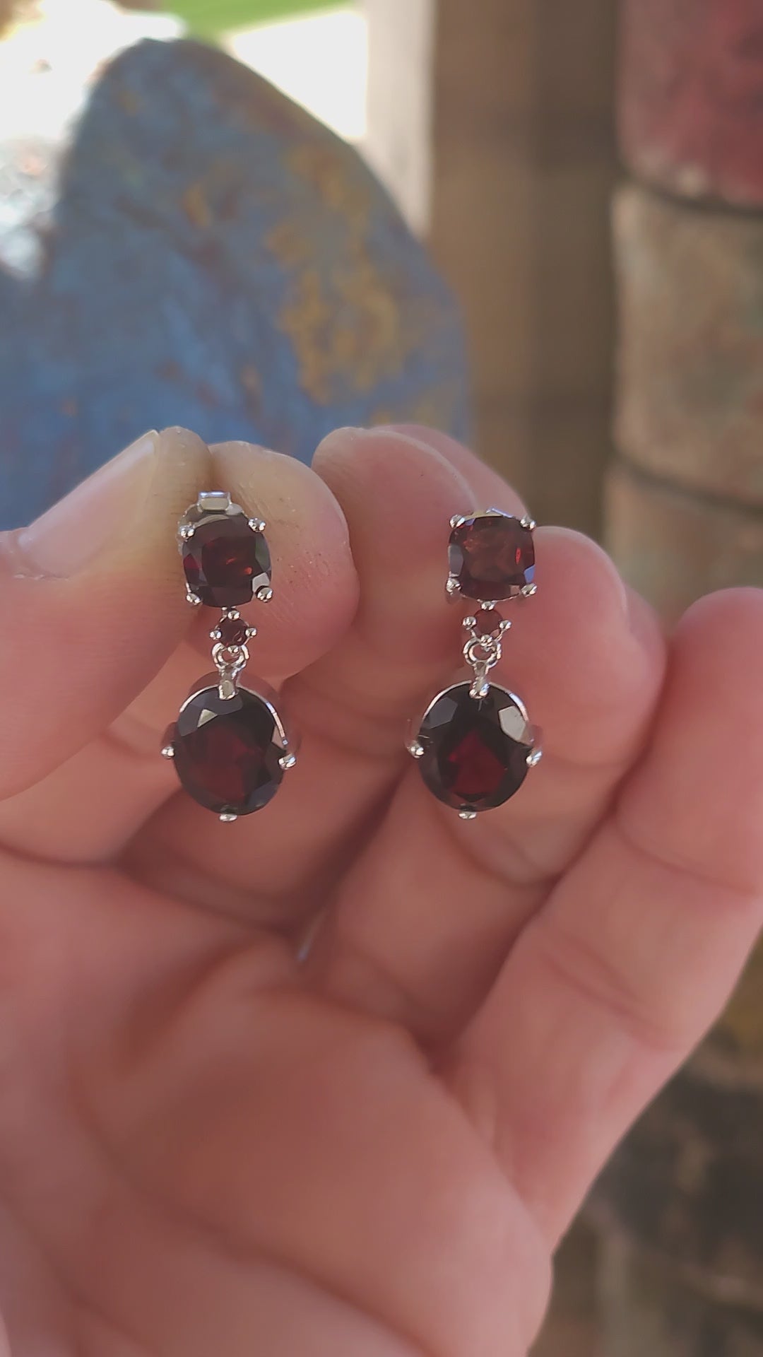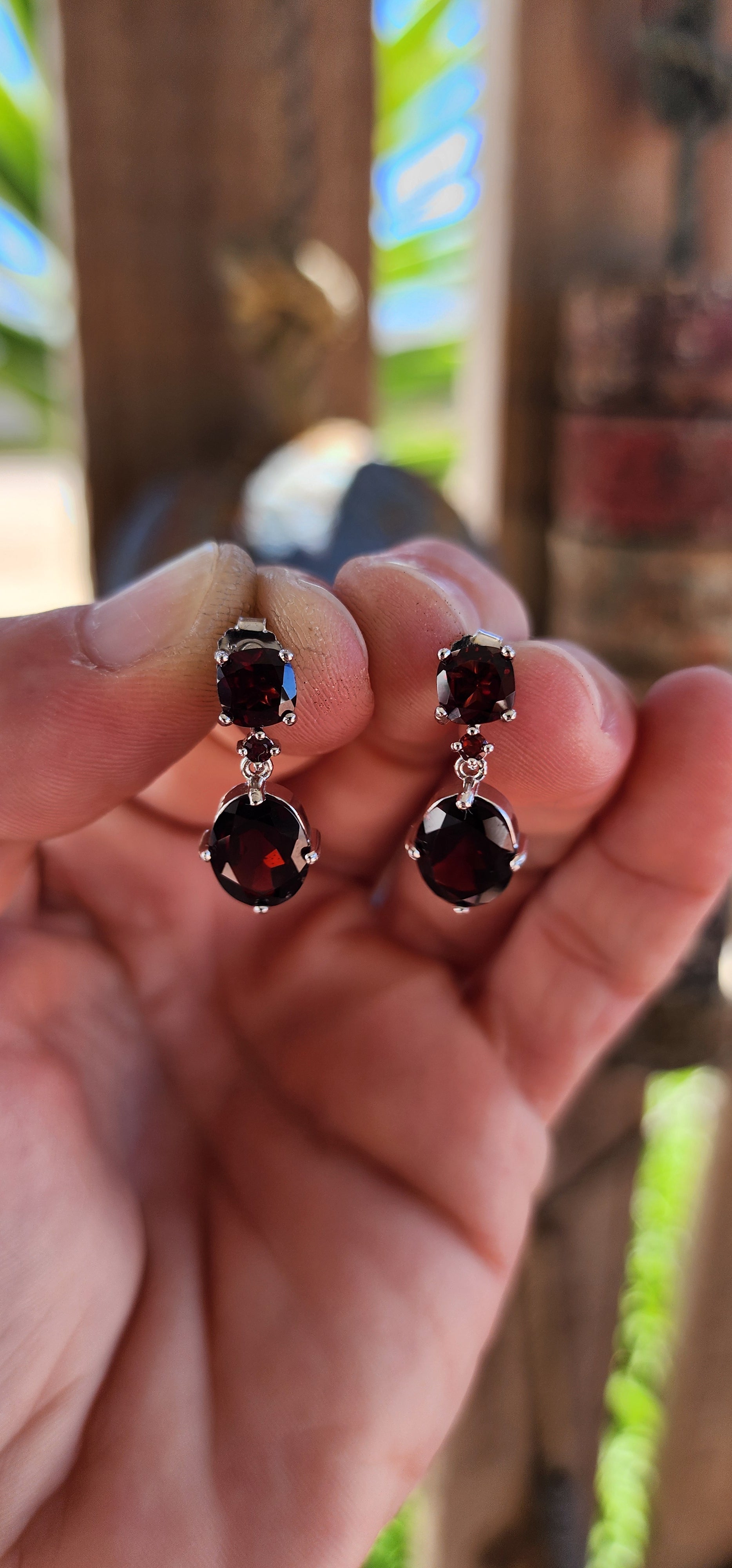 Each garnet is meticulously prong-set to ensure maximum visibility and sparkle, while the sterling silver setting provides a sleek, luminous contrast that enhances the vibrancy of the garnets. The dangling design allows the stones to catch and reflect light with every movement, adding a dynamic and luxurious feel.