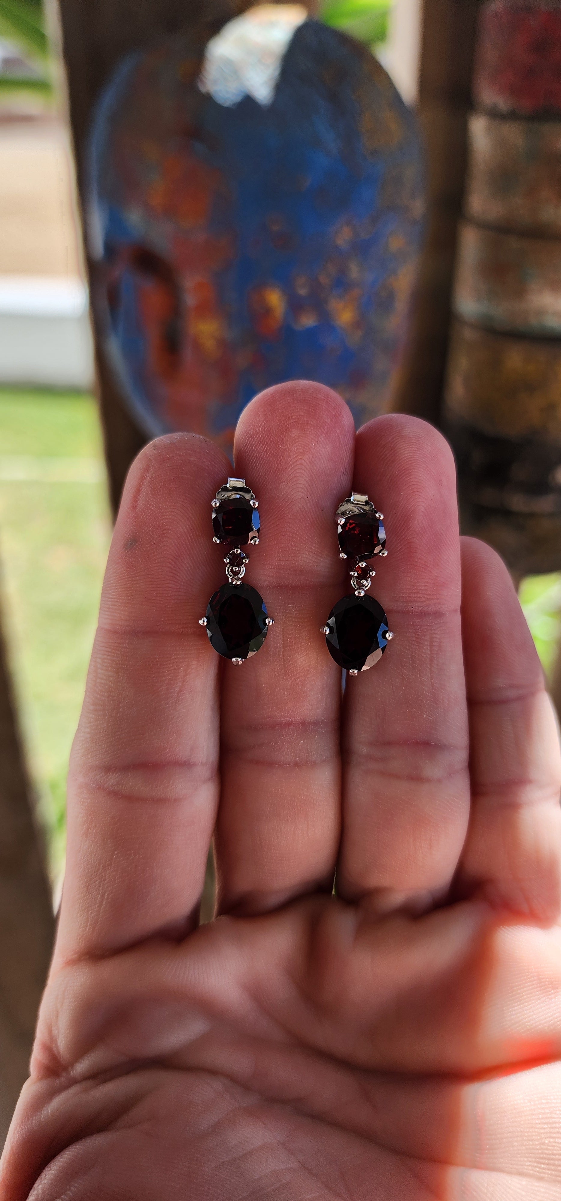 Measurements :Each earring with a drop of 2.1cm x 9.90mm wide.Each of the larger oval cut garnet gemstones measure 1cm x 7.90mm.Earrings with a combined weight of 4.6grams.