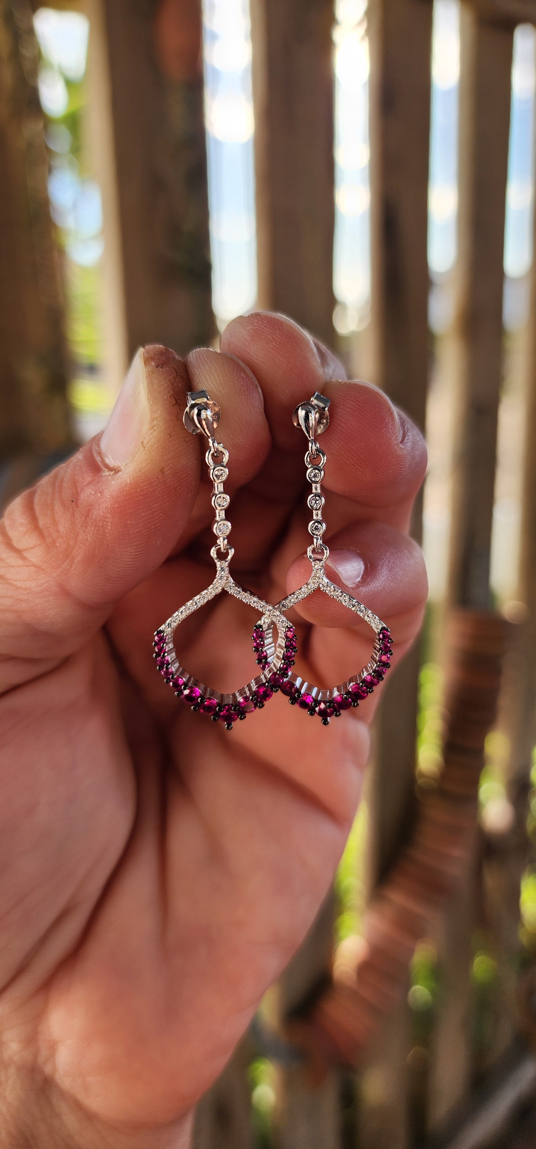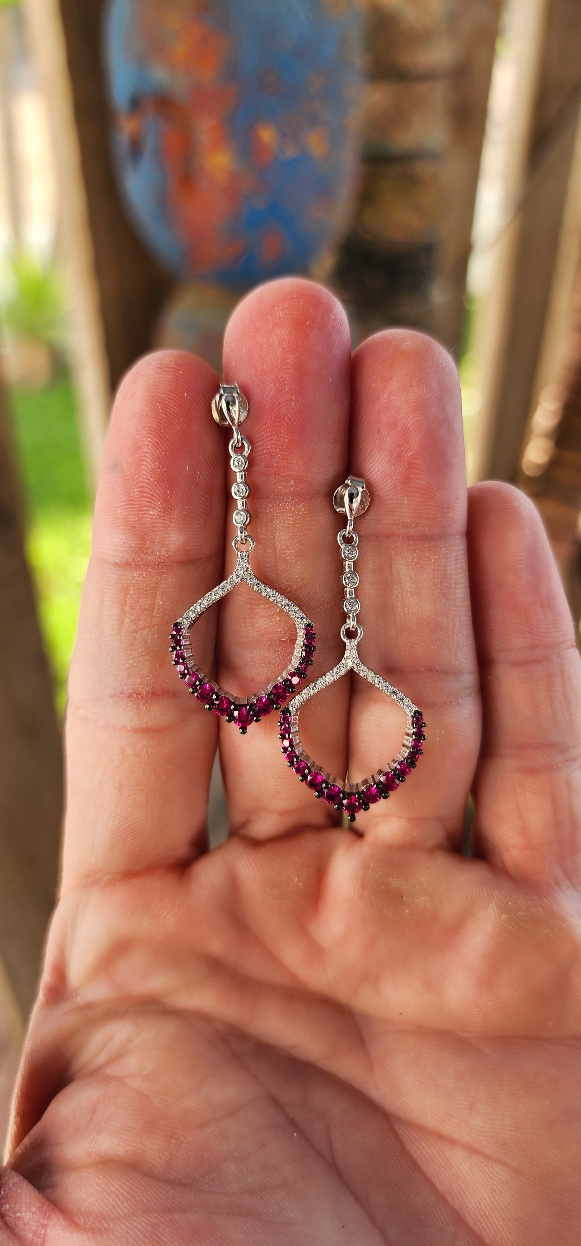 Measurements :Each earring with a drop of 4.2cm x 1.8cm wide.The larger centre pink cz gemstones measure 3mm in diameter.The earrings with a combined weight of 4grams.