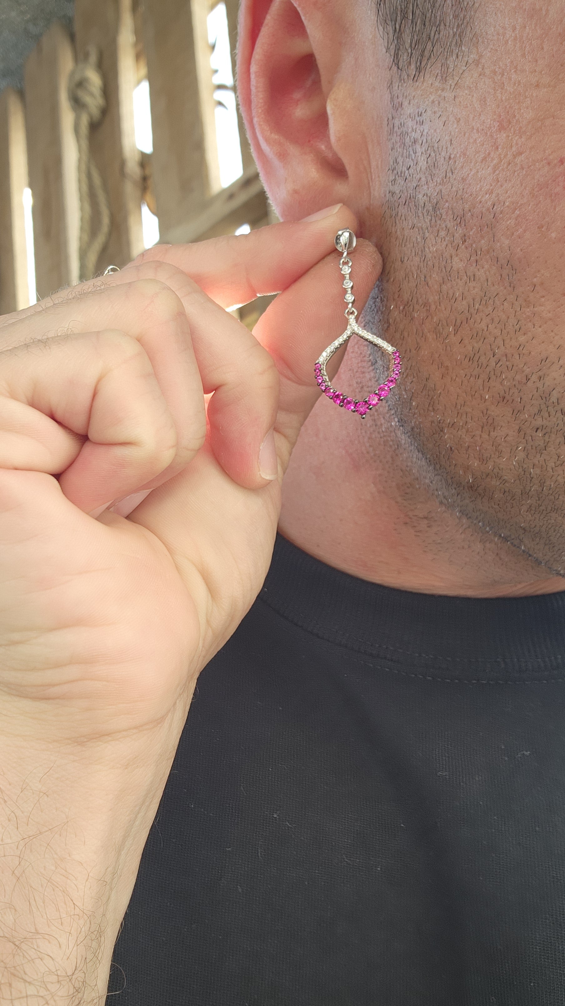 At the base, a striking open teardrop silhouette takes center stage—gracefully curved and prong-set with a vibrant array of cerise pink CZ gemstones. The rich magenta tones radiate with bold energy, adding a flirty pop of color that feels both modern and unapologetically fun. The prongs themselves are detailed with subtle black enamel tips, giving the vivid pink gemstones a sultry contrast that enhances their sparkle and intensity.