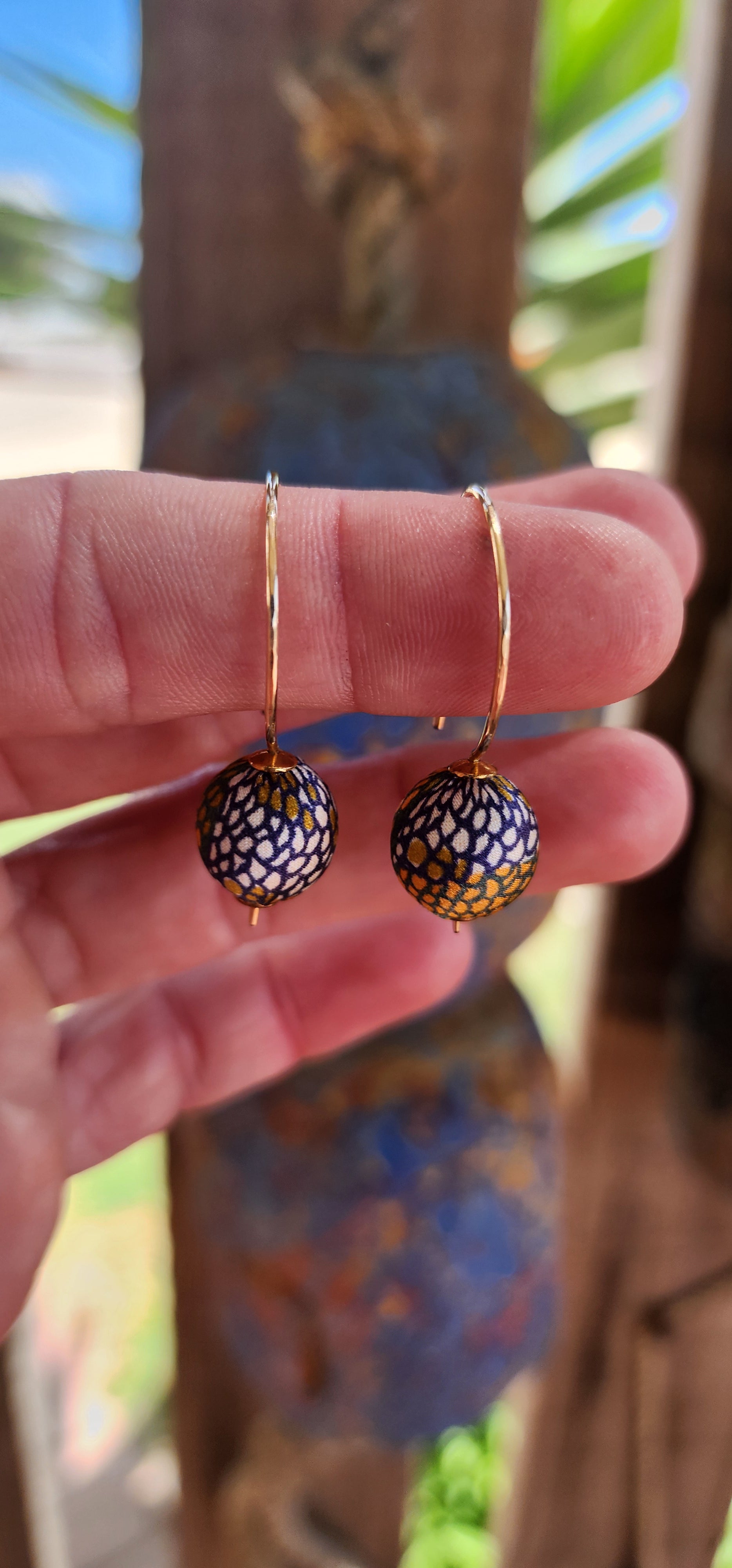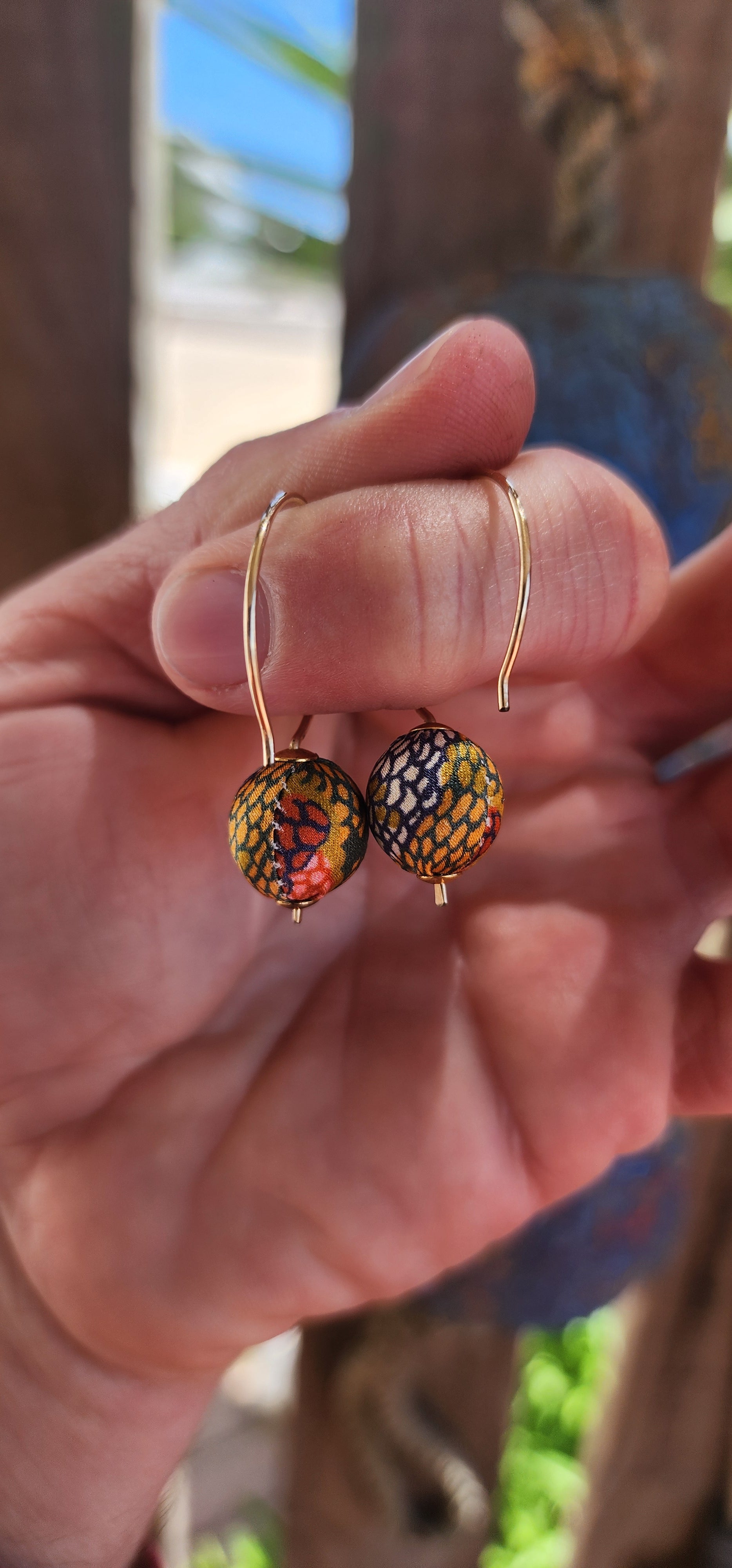 These designer costume earrings are playful and vibrant showstoppers, featuring soft satin fabric spheres in a kaleidoscope of bold colors and patterns.
