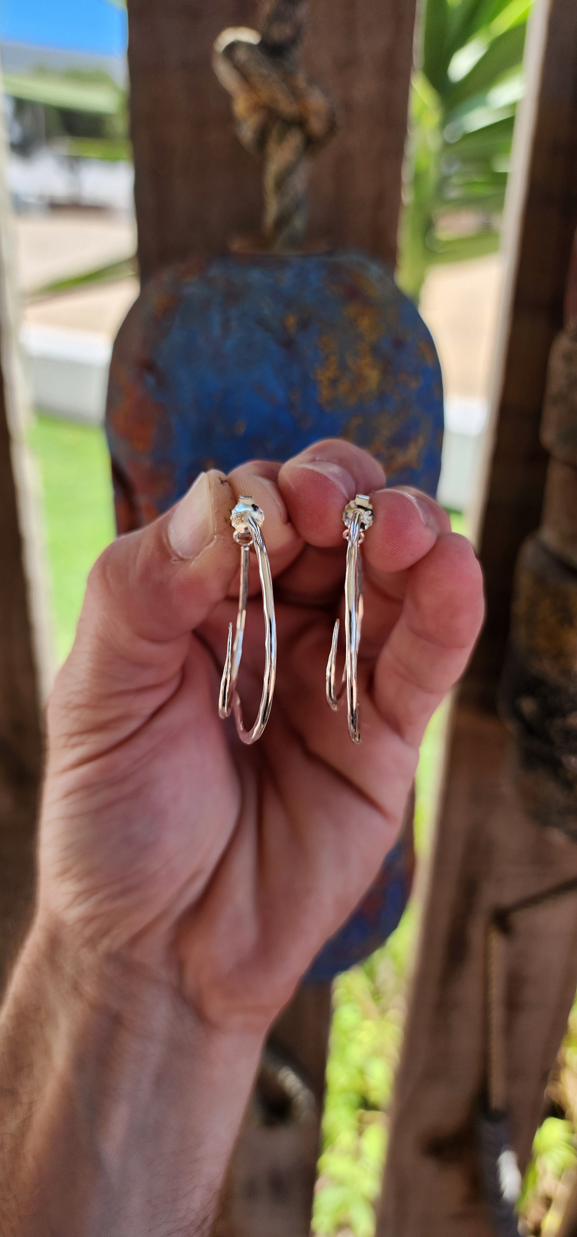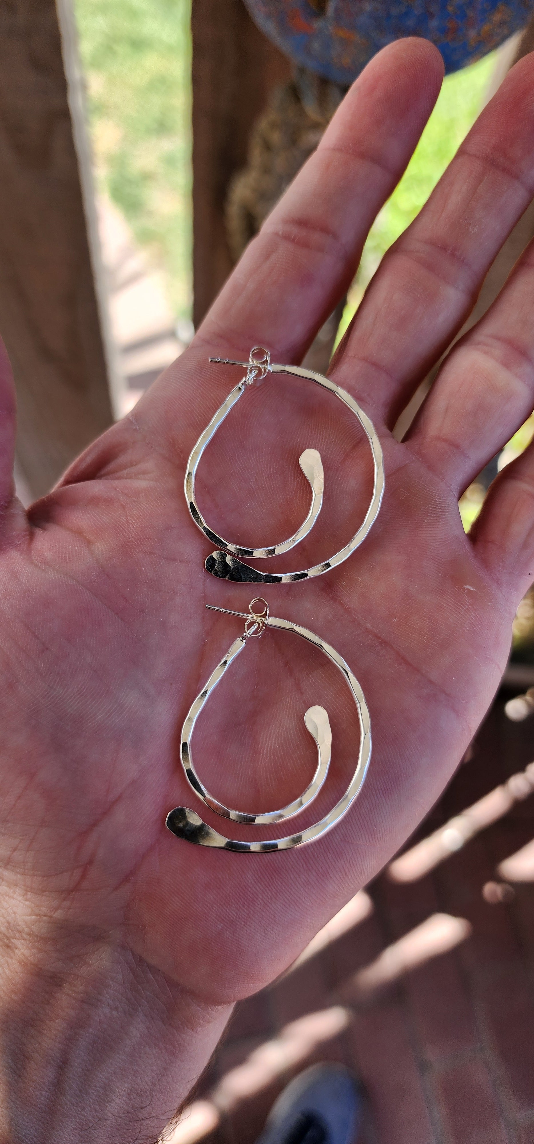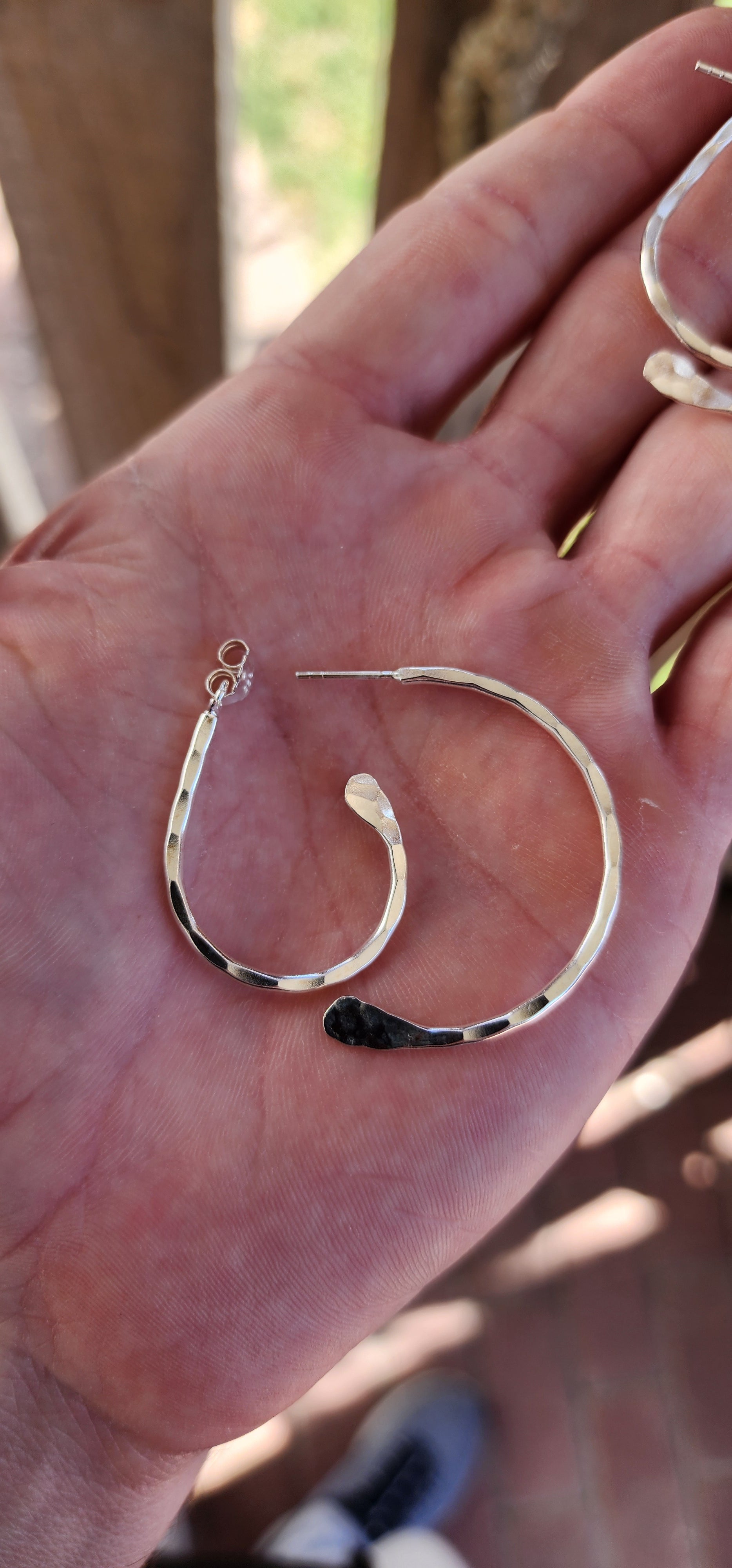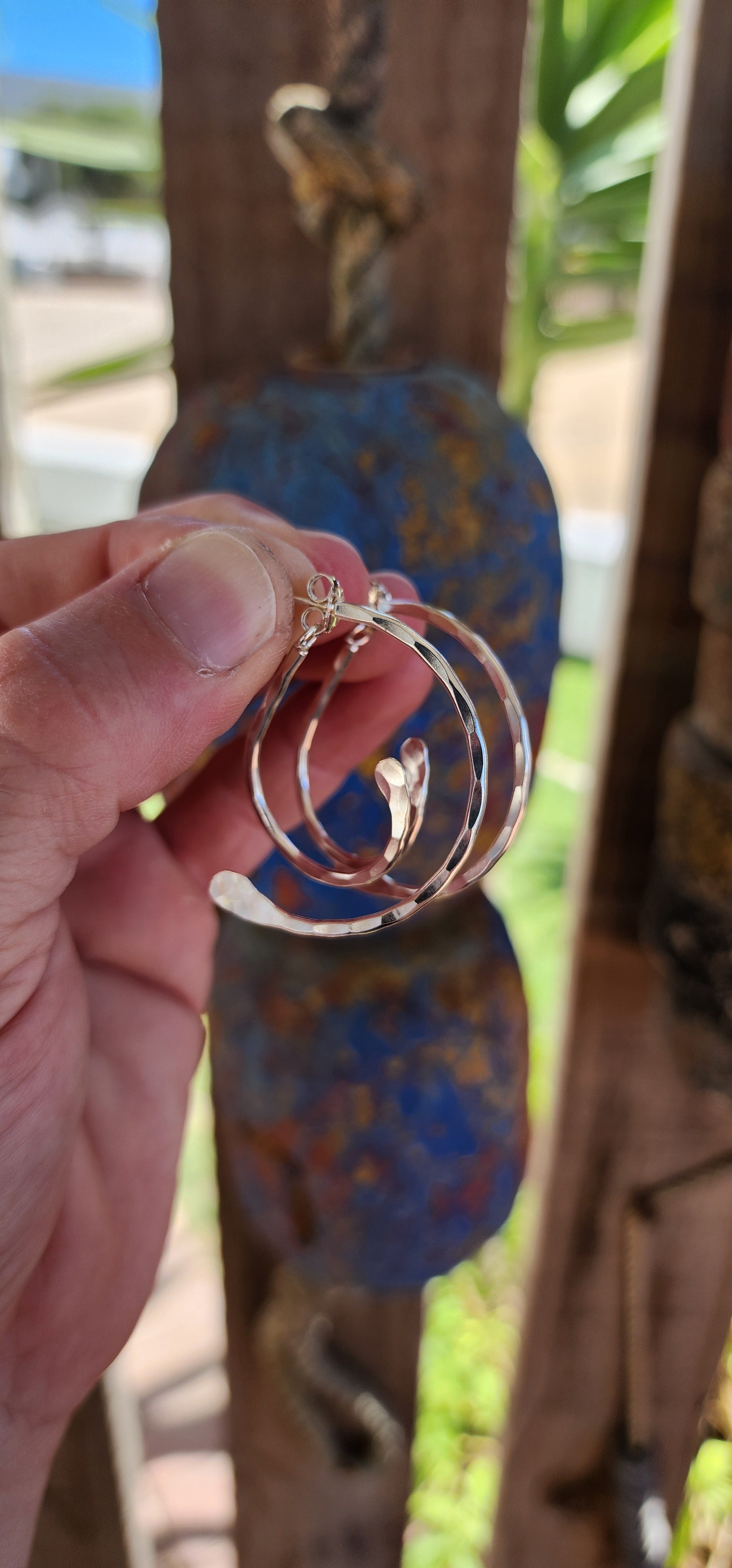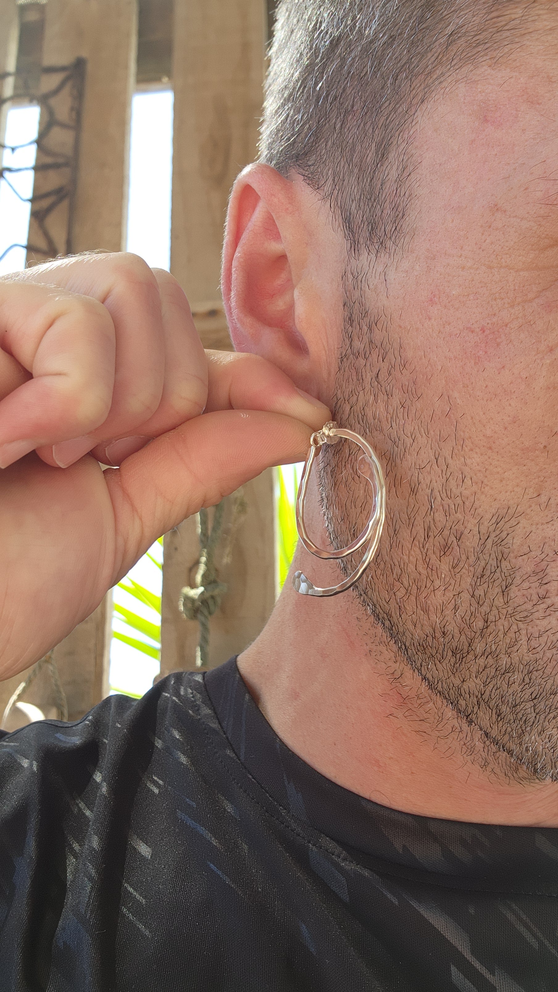 These earrings are a brilliant fusion of contemporary artistry and optical illusion! Crafted from hammered sterling silver, they feature an intriguing twisted double-half hoop design that plays with depth and dimension.