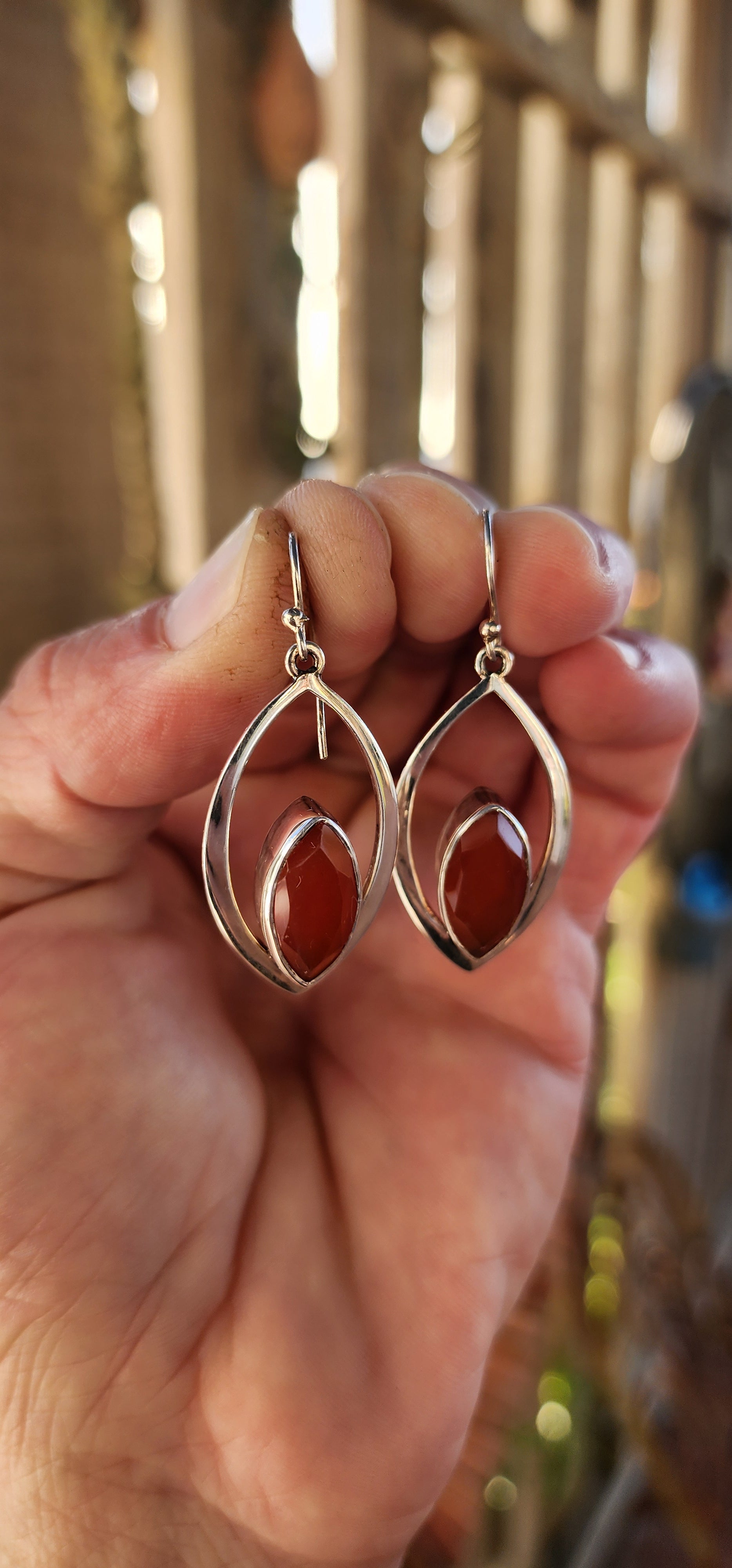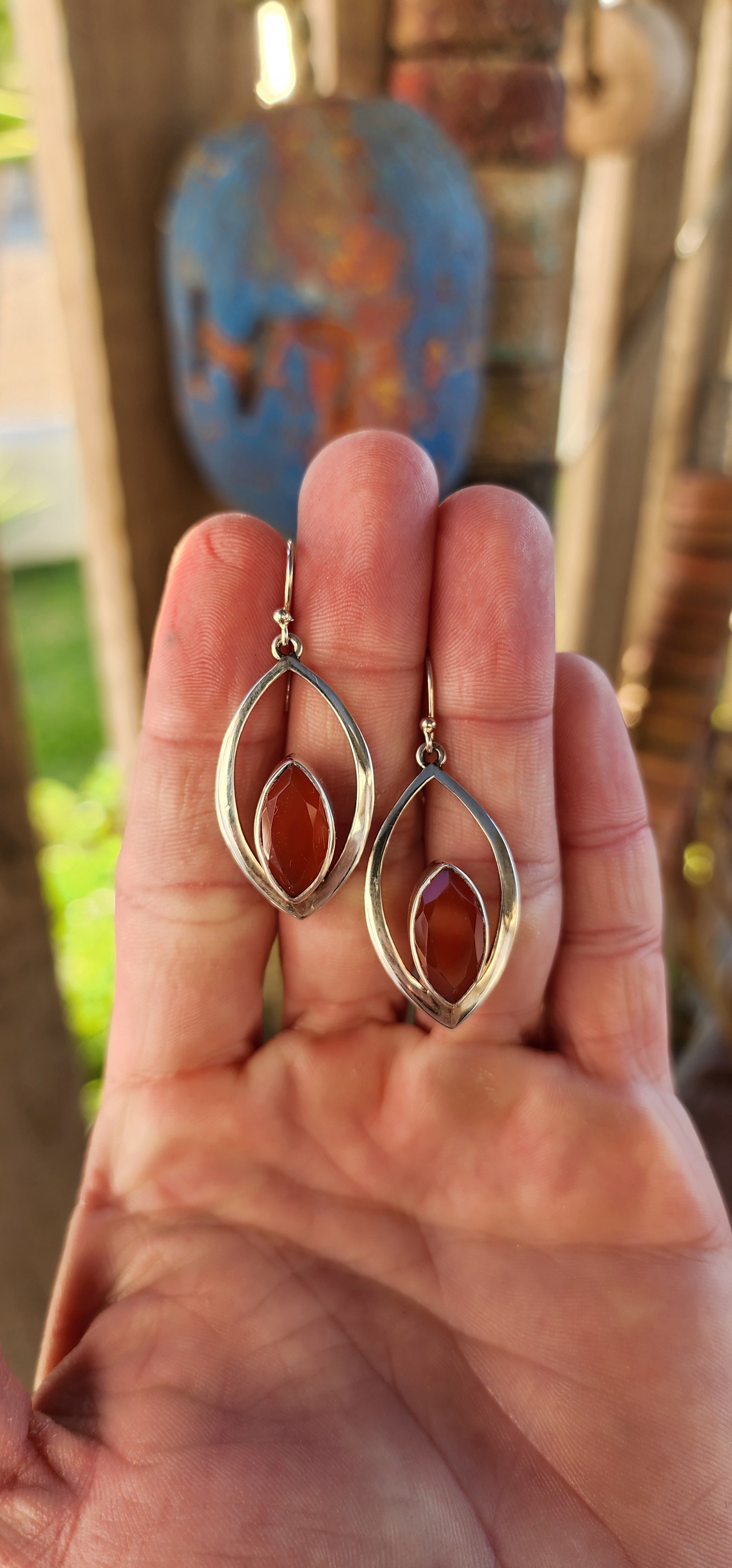 Crafted in sleek sterling silver, each earring showcases a graceful marquise-shaped frame, which gently cradles a floating carnelian gemstone at its center. The carnelian is also cut in a marquise shape, mirroring the silver frame in a poetic visual echo. With their warm, earthy orange glow, the gemstones look like glowing embers—bold, grounding, and utterly captivating.