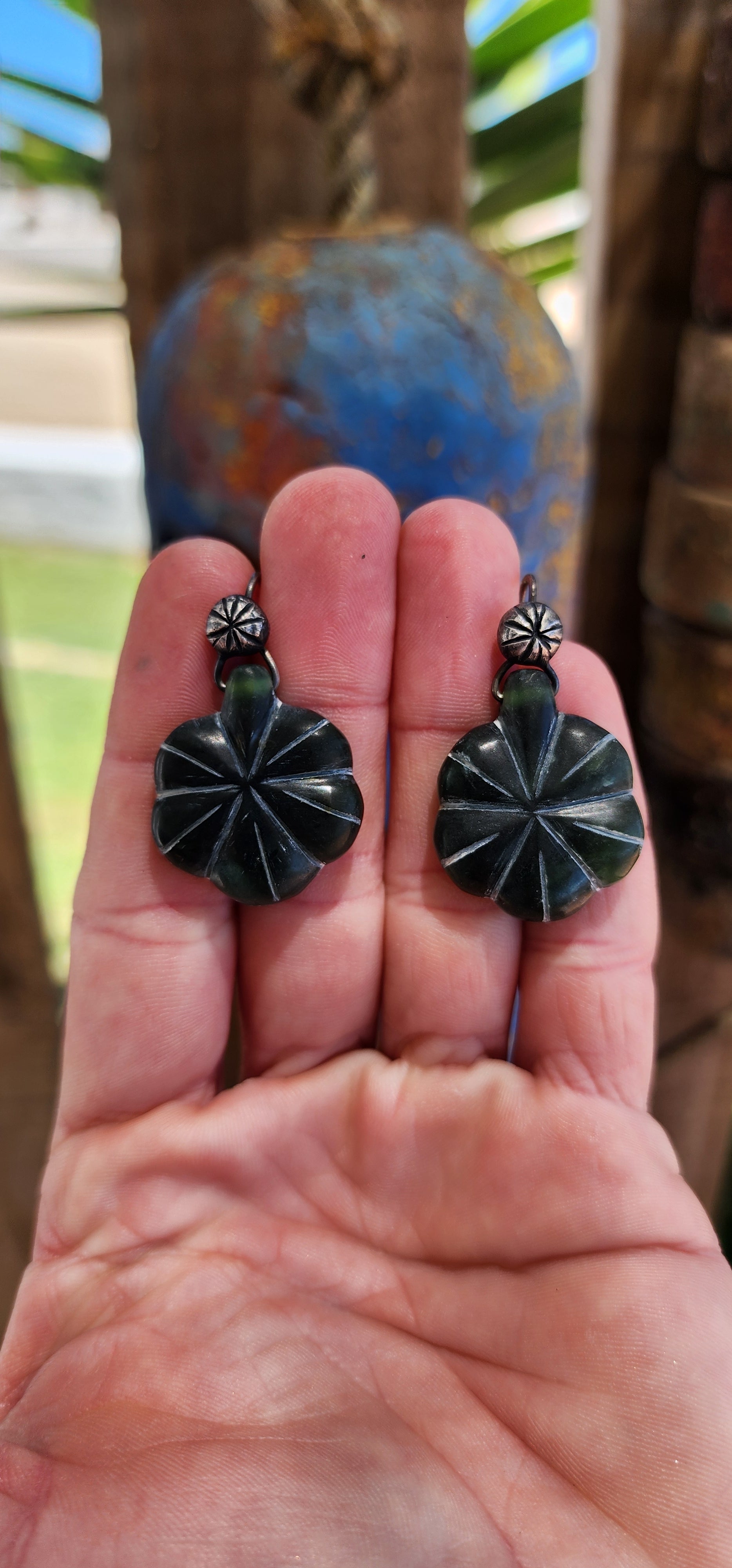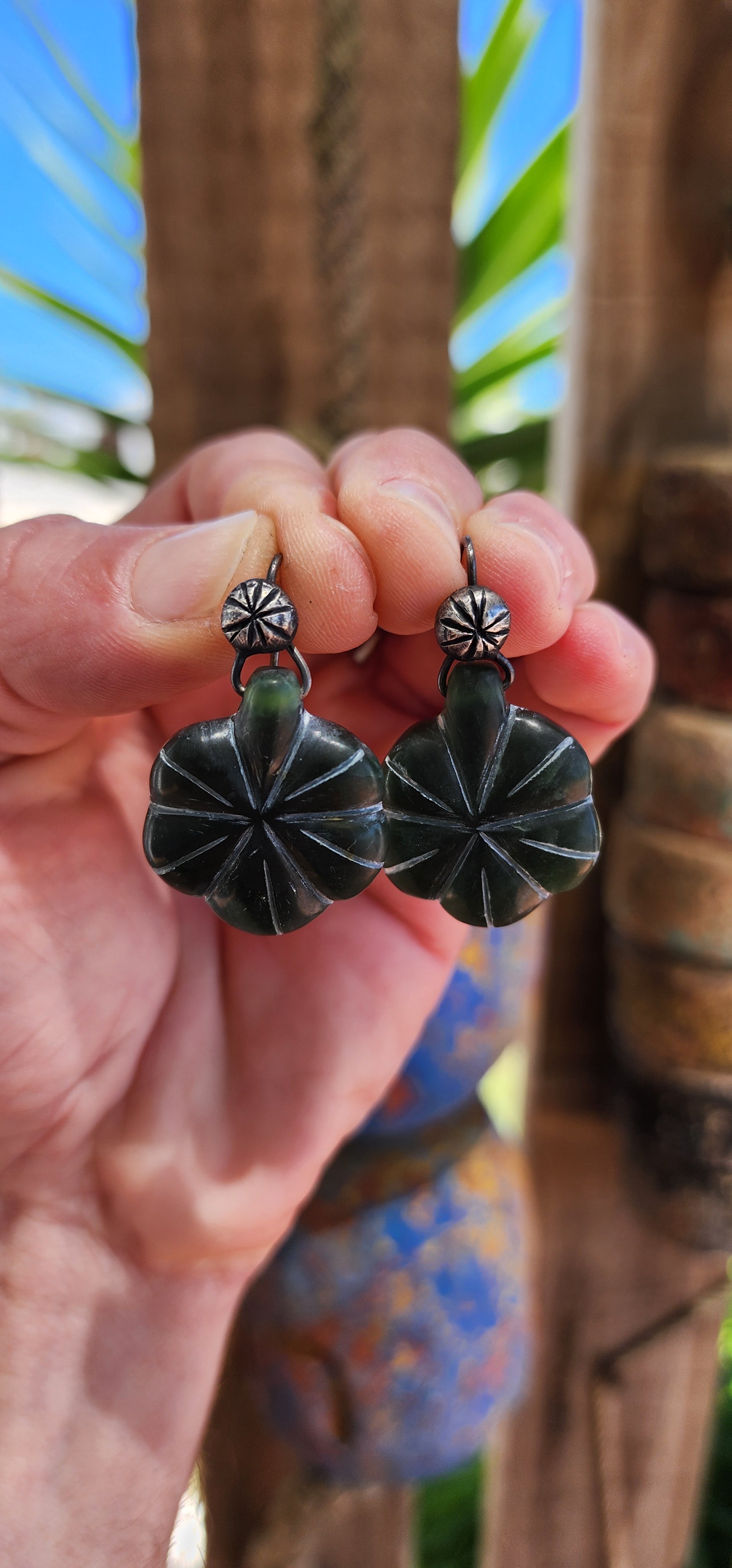 The main body of the earrings is a substantial piece of serpentine gemstone, carefully carved into a flower shape. This large, rounded form with deep grooves etched from the center outward, emphasizing a radial symmetry reminiscent of lotus or lily pads.