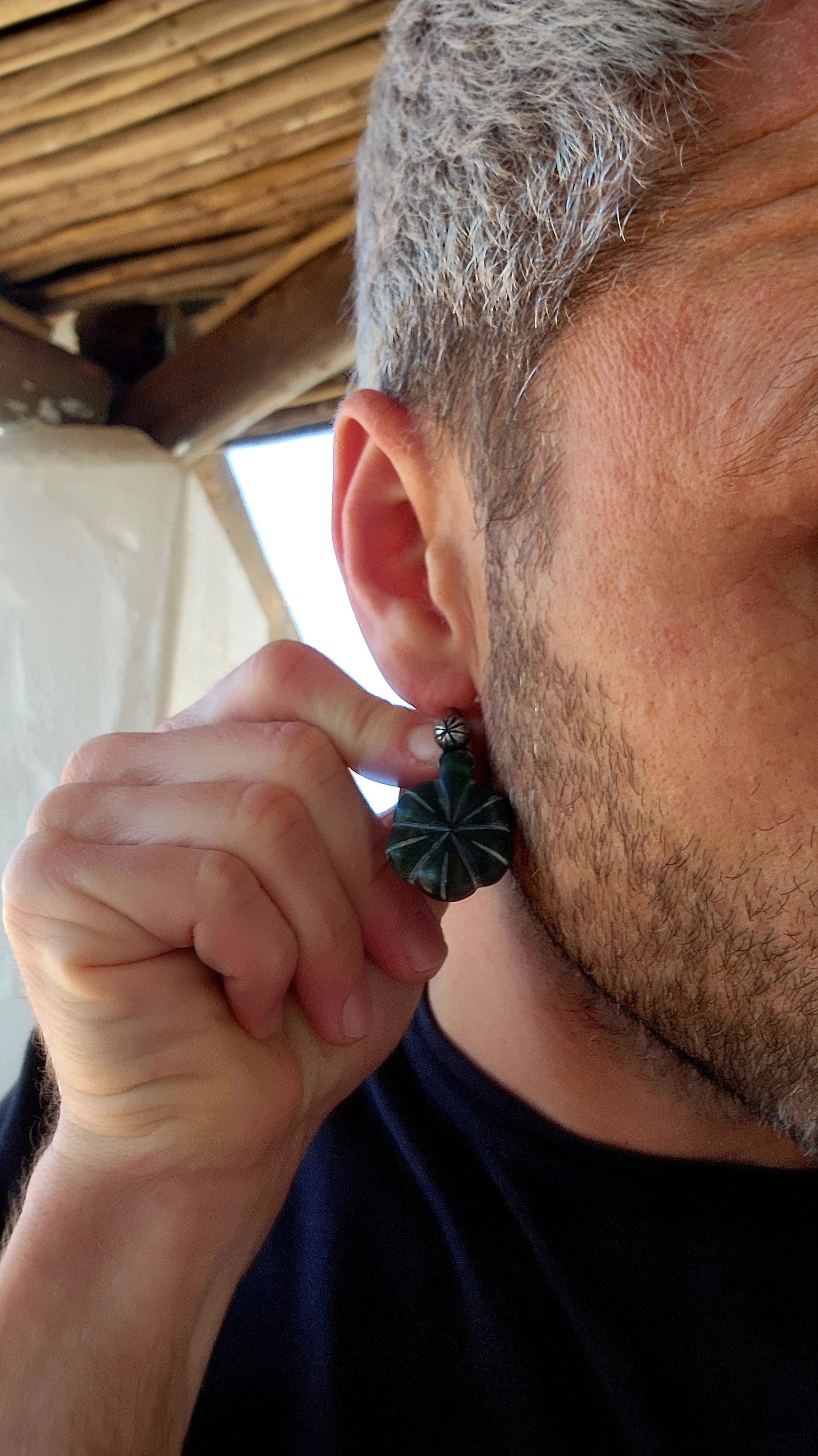 These earrings present a rich, earthy aesthetic that combines the elegance of sterling silver with the natural allure of serpentine gemstones. The design follows a layered structure that draws on organic and tribal/ethnic-inspired motifs.