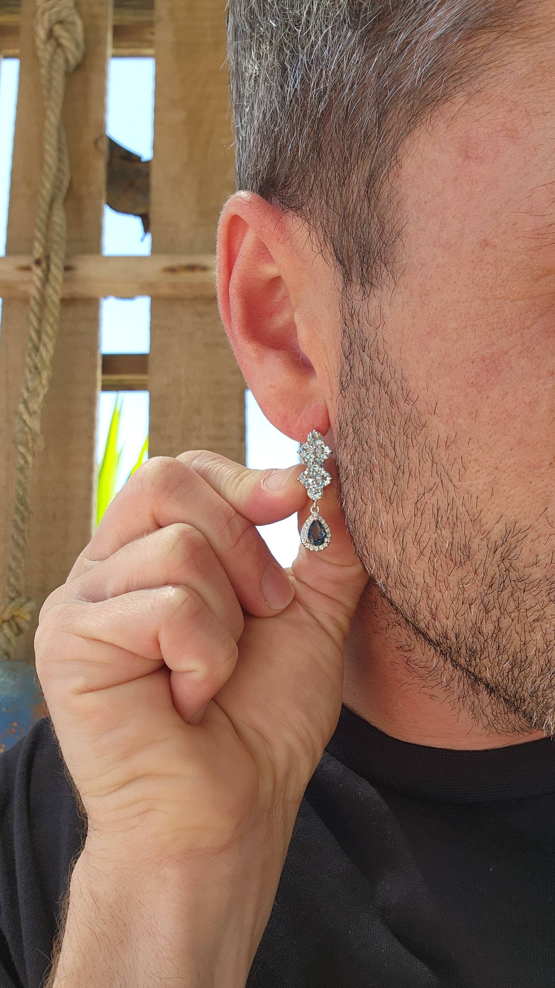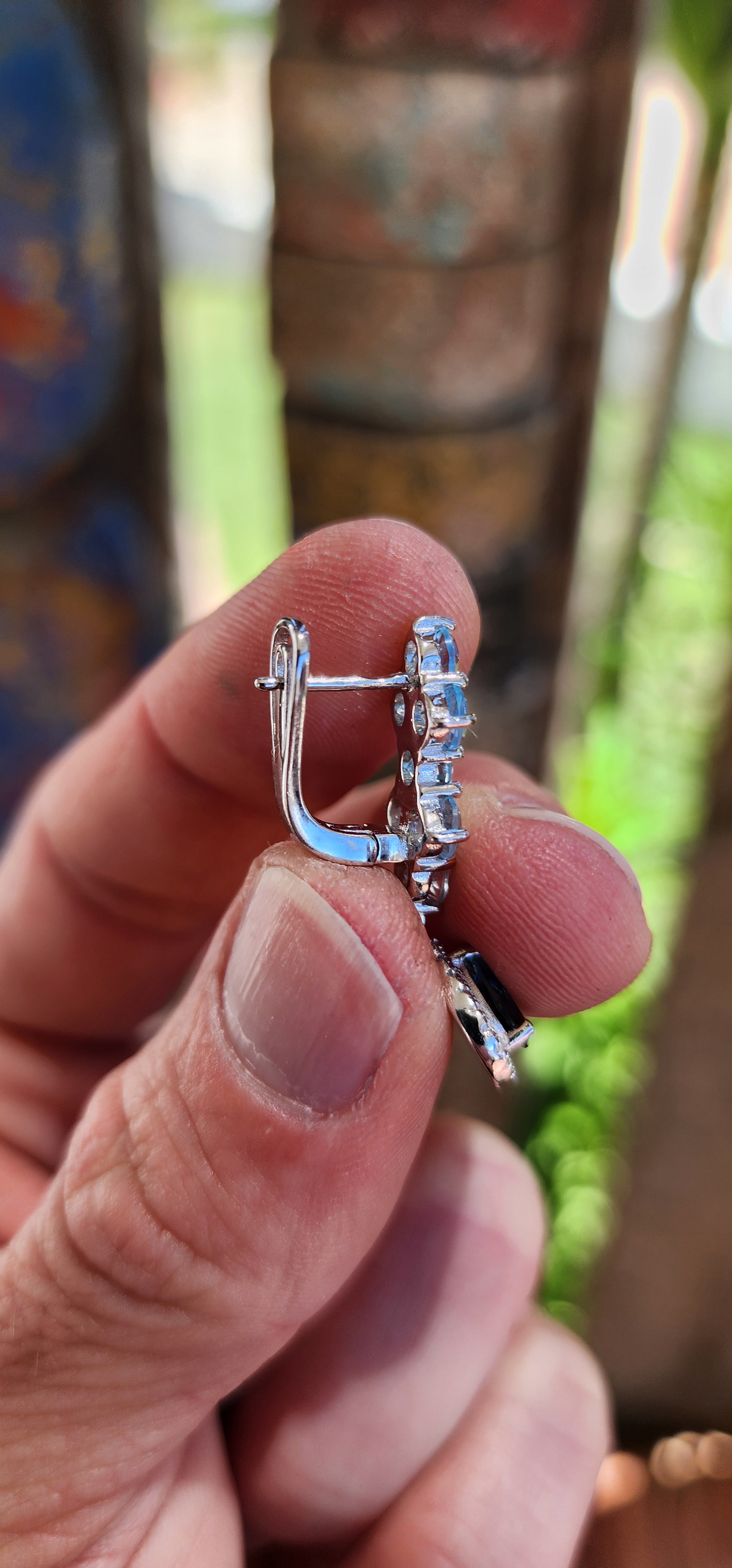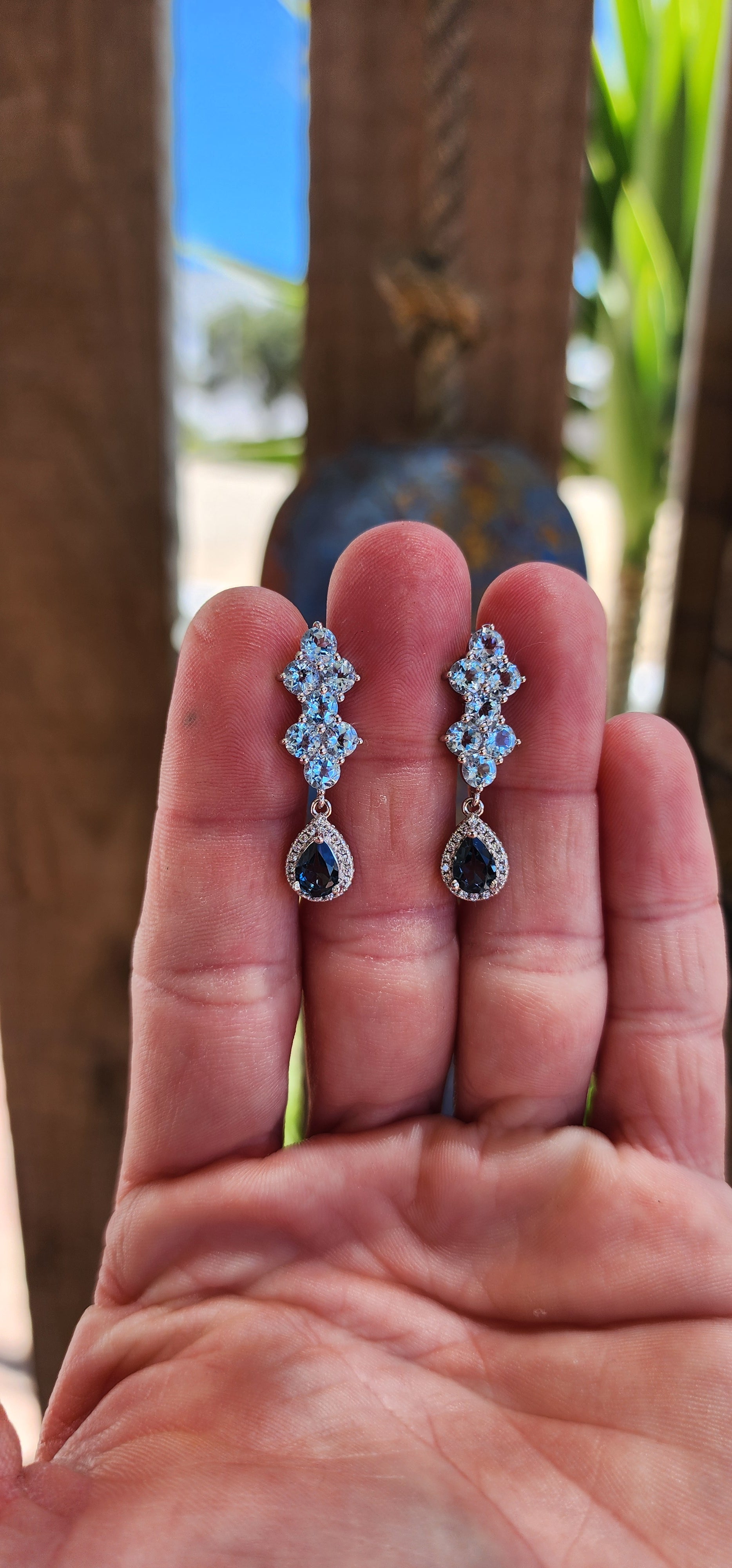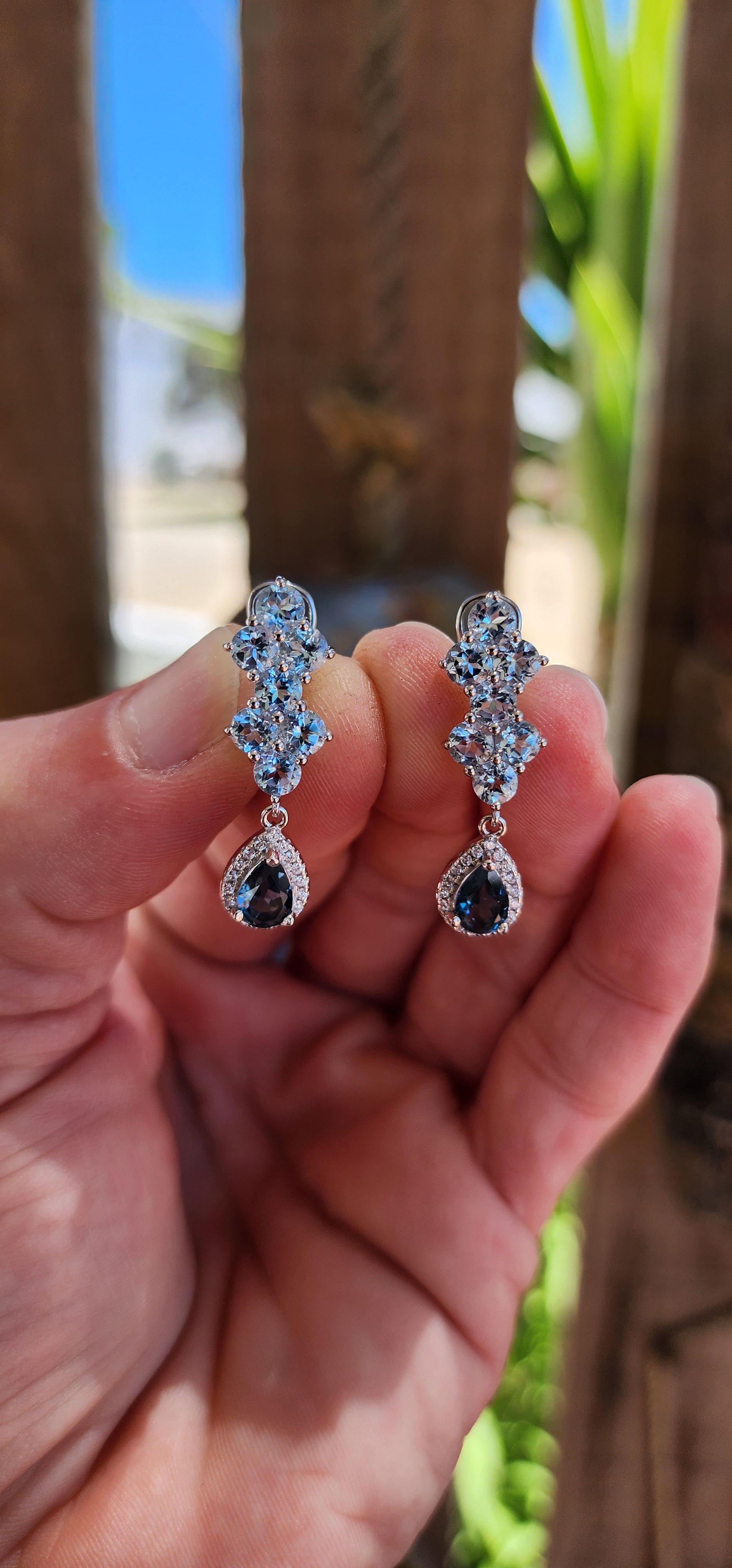 Measurements :Each earring with a drop of 3.2cm x 1cm wide.The larger swiss blue pear cut topaz gemstones each measure 6.80mm x 5mm.The earrings with a combined weight of 7.1grams.