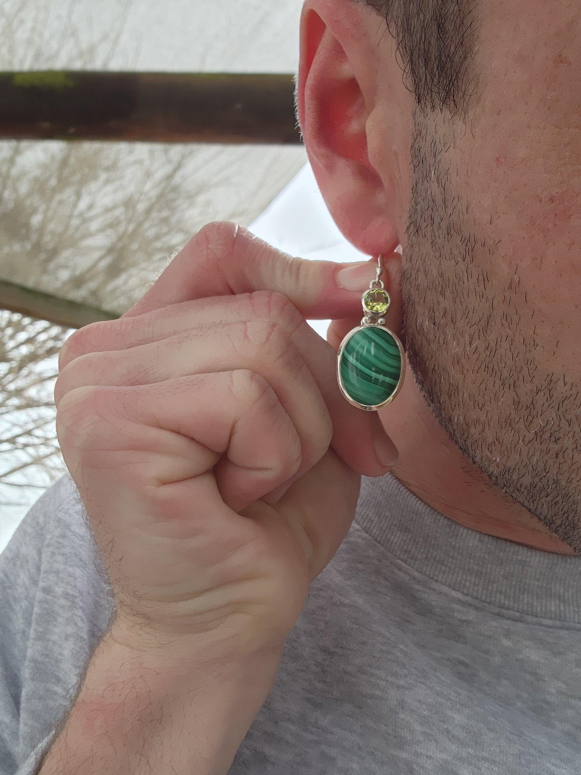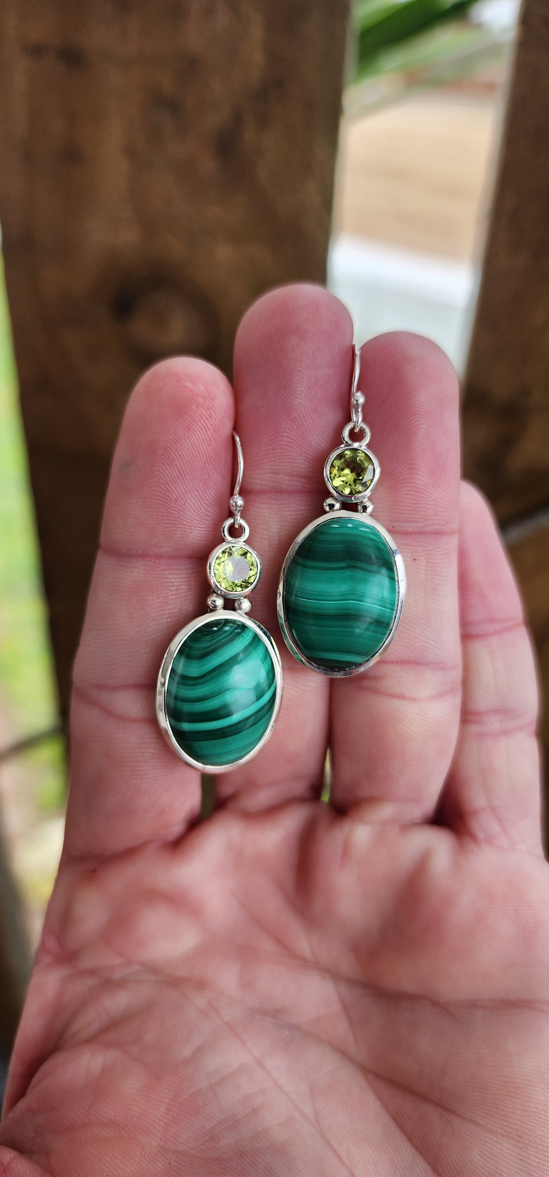 Measurements :Each earring with a drop of 3cm x 1.6cm wide excluding the shepherds hooks.Each of the Oval cut Malachite Cabochons measure 1.9cm x 1.4cm.The Round cut Peridot Gemstones with a diameter of 6mm each.Earrings with a combined weight of 14.4grams.