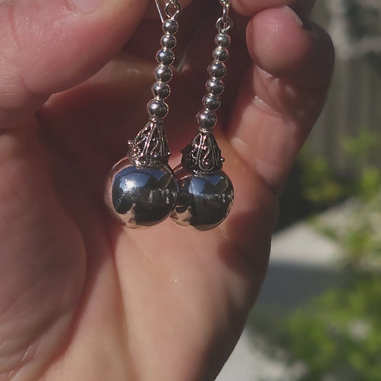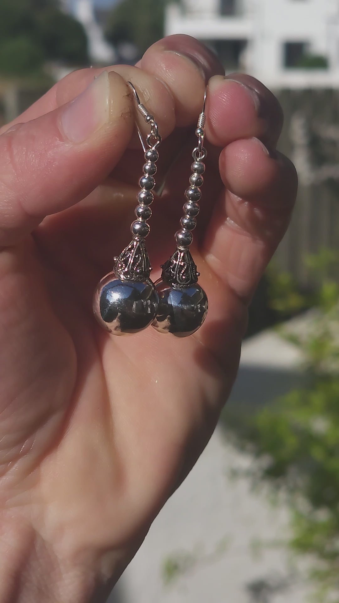 Resting atop each orb is an ornate, handcrafted Balinese filigree cap—rich with swirling detail and tiny beadwork that add a regal, exotic flair. The contrast between the sleek modern shine of the sphere and the old-world detailing of the cap is simply delicious.
