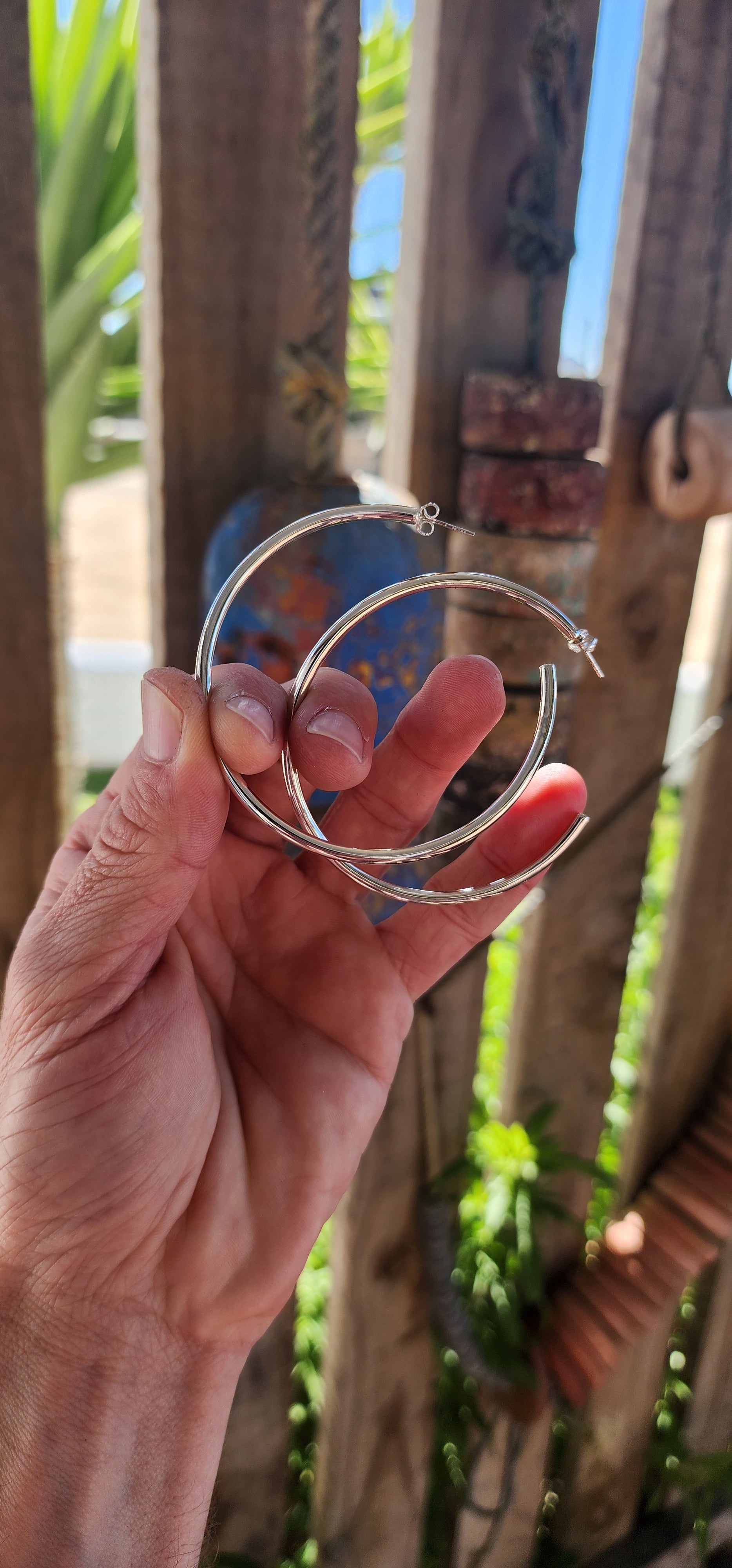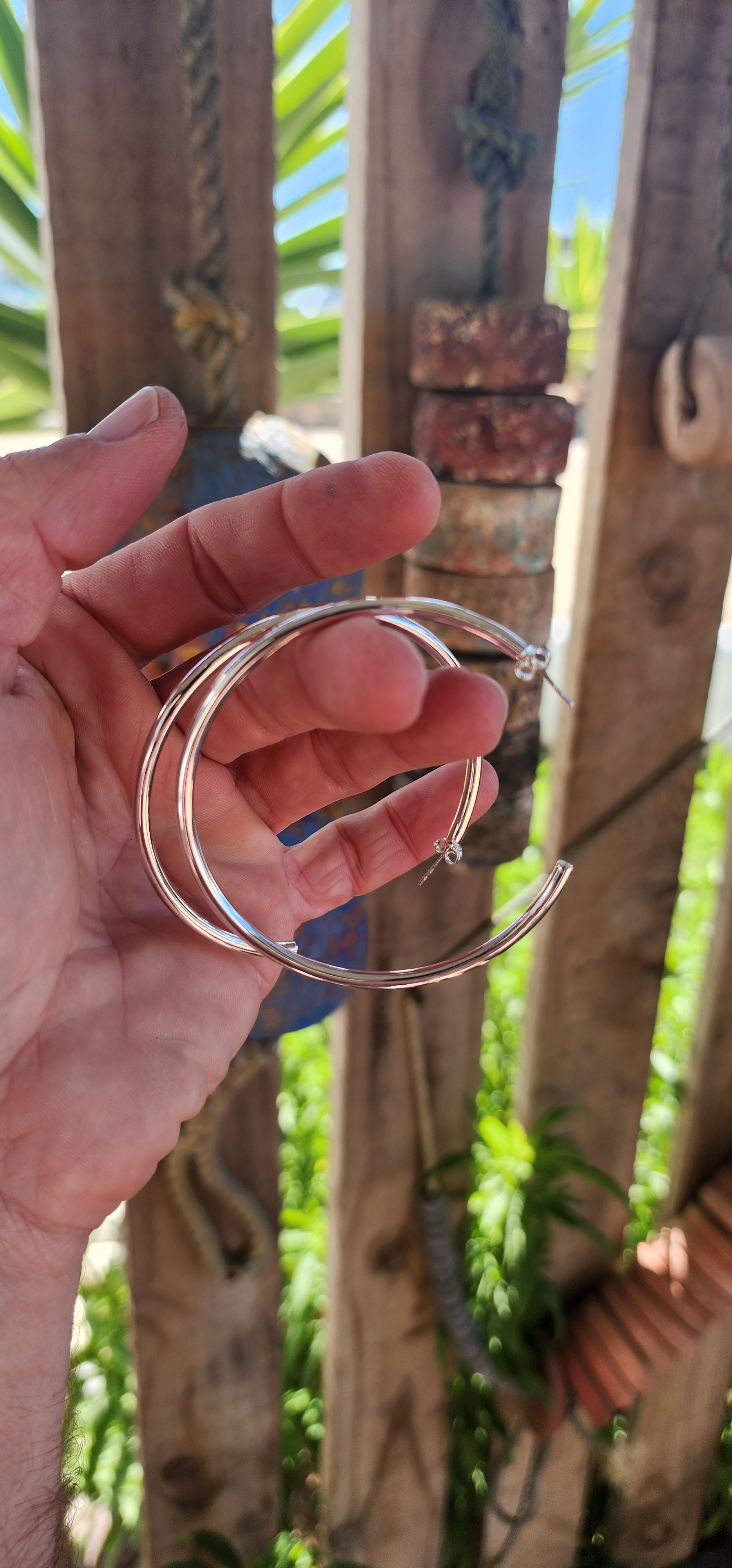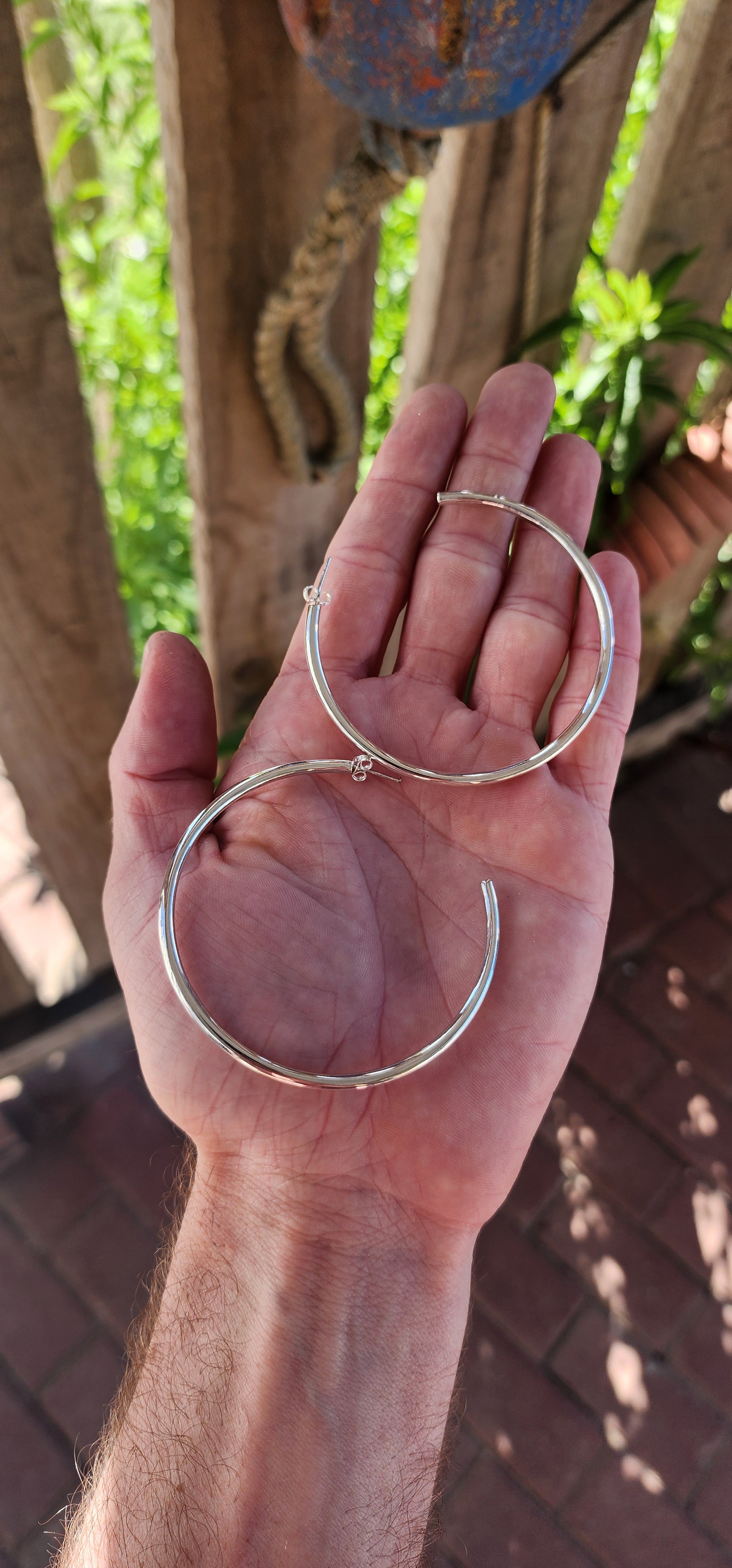 These oversized sterling silver hoop earrings boast a bold, tubular design with a clean and minimalist aesthetic.