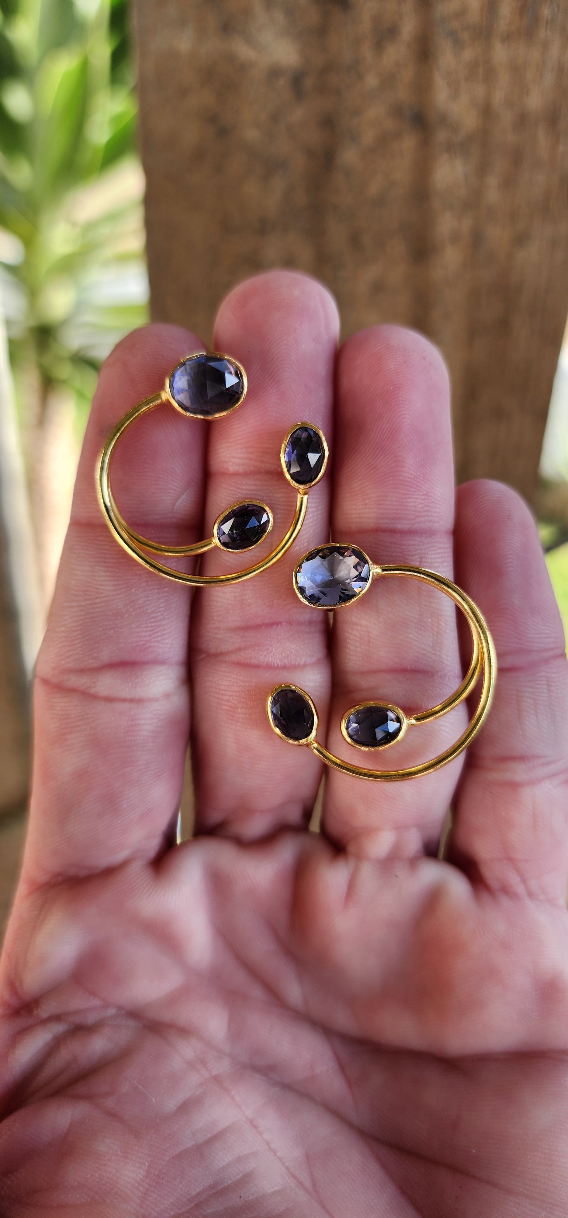 These push-in earrings are unusual and Artsy with a Modernist twist ! Crafted in Sterling Silver with 22ct Yellow Gold plating , the open-end Circles are adorned with Oval Rose Cut Amethyst Gemstones , the larger Amethyst Gemstone on the left earring being Rose cut while the Amethyst on the right earring is faceted with a flat table,this adds to the artistic flair these beauties flaunt.