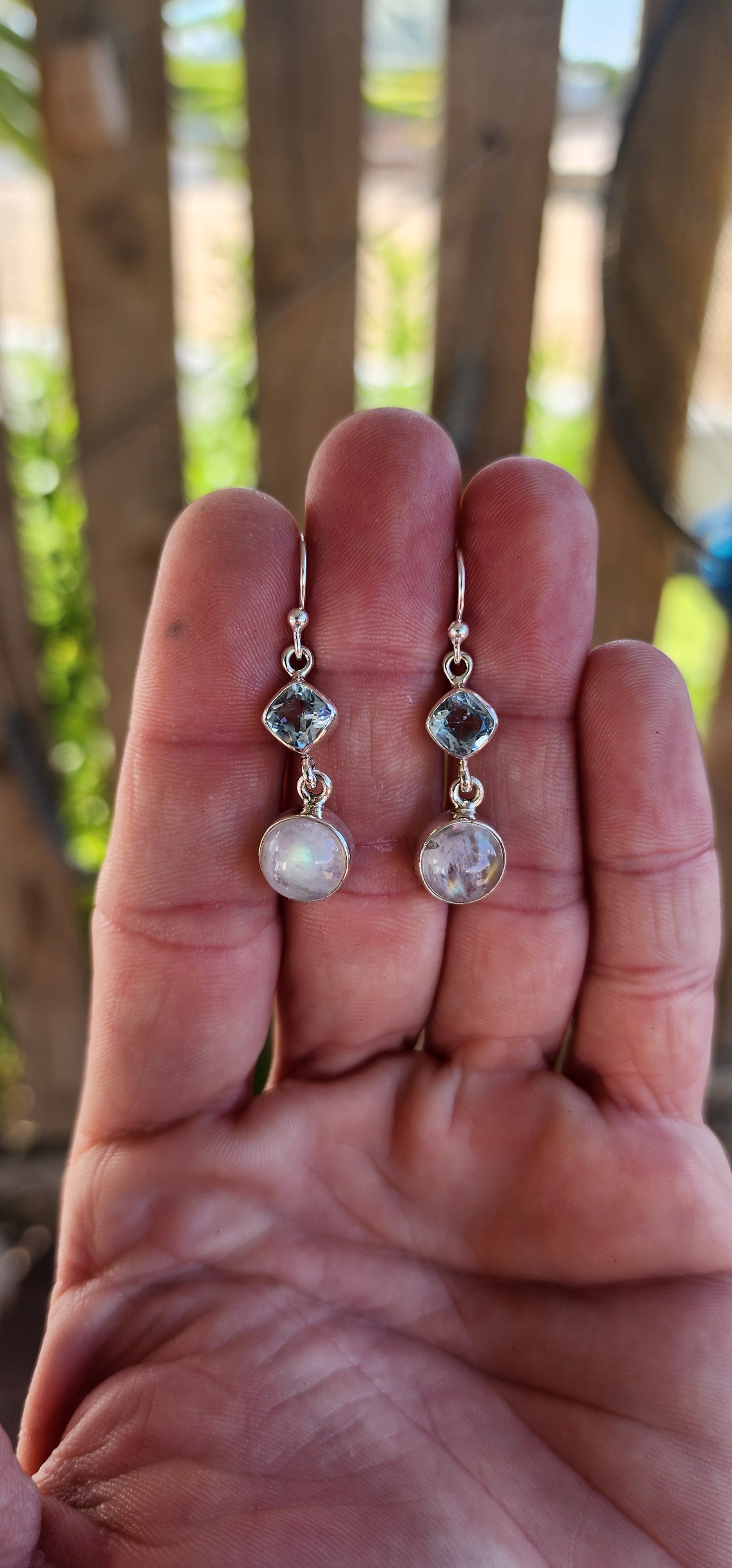 Measurements :Each earring with a drop of 2.3cm excluding the shepherds hooks.The moonstone cabochons each measure 9mm in diameter and the cushion cut topaz gemstones each measure 6mm x 6mm.The earrings with a combined weight of 4.9grams.