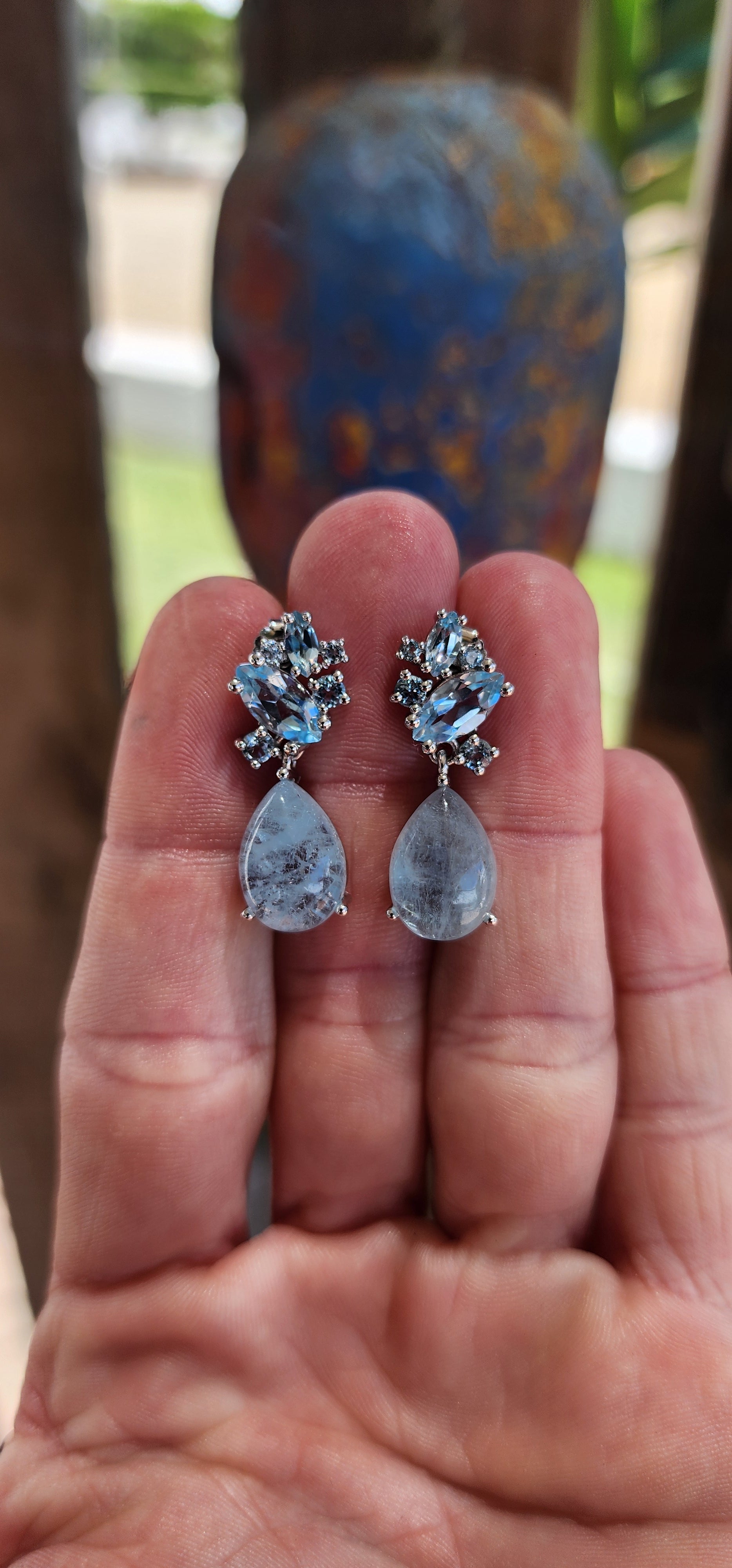 Measurements :Each earring with a drop of 3cm x 1cm wide.The larger Pear cut Aquamarine Cabochons each measure 1.3cm x 9mm.Earrings with a combined weight of 7.5grams.